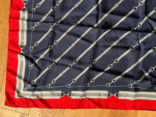 Vintage Celine Silk Scarf With Red, Navy & Cream Equestrian Chain Print