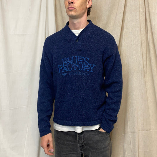 Armani Jeans Blue 90s Silk & Wool Button Collar 'Blues Factory' Jumper