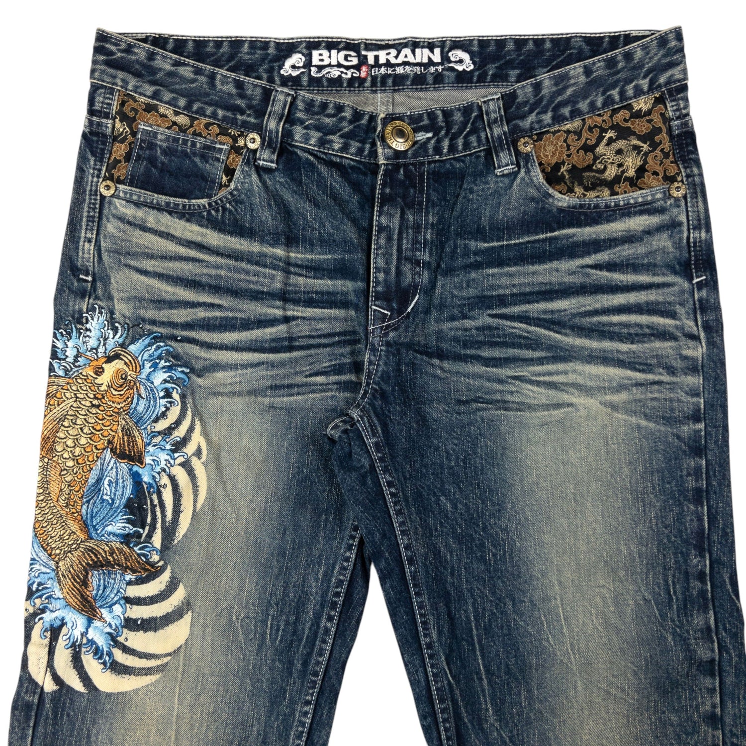 Vintage Big Train Embroidered Koi Fish Japanese Denim Jeans Size W36