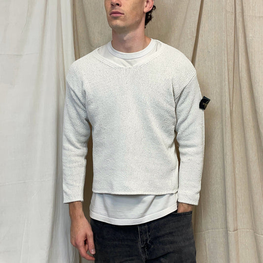 Stone Island White SS96 Chenille Knit Scoop Neck Green Edge Badge Jumper