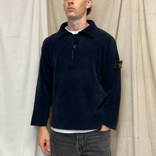 Stone Island Navy SS95 Chenille Knit Green Edge Badge Button Collar Jumper