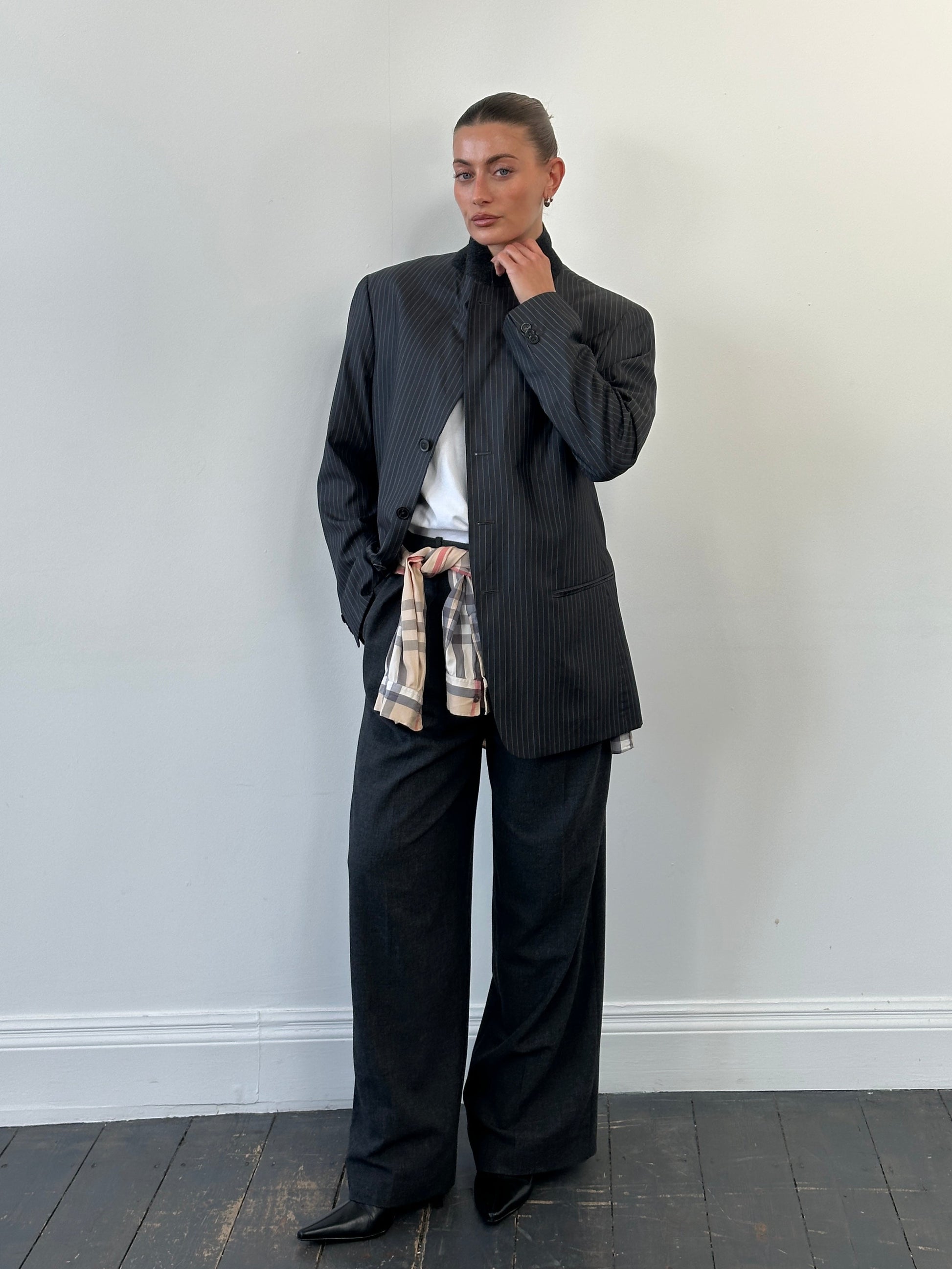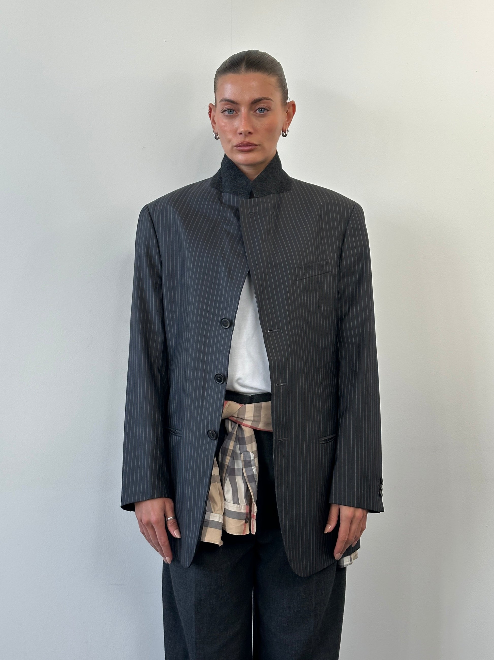 Vintage Armani Collezioni blazer in grey with a fine pinstripe, tailored in a classic single breasted silhouette with structured shoulders and a clean, elongated line. Crafted in Italy with a smooth bemberg cupro lining, this piece reflects refined 1990s Armani menswear tailoring.