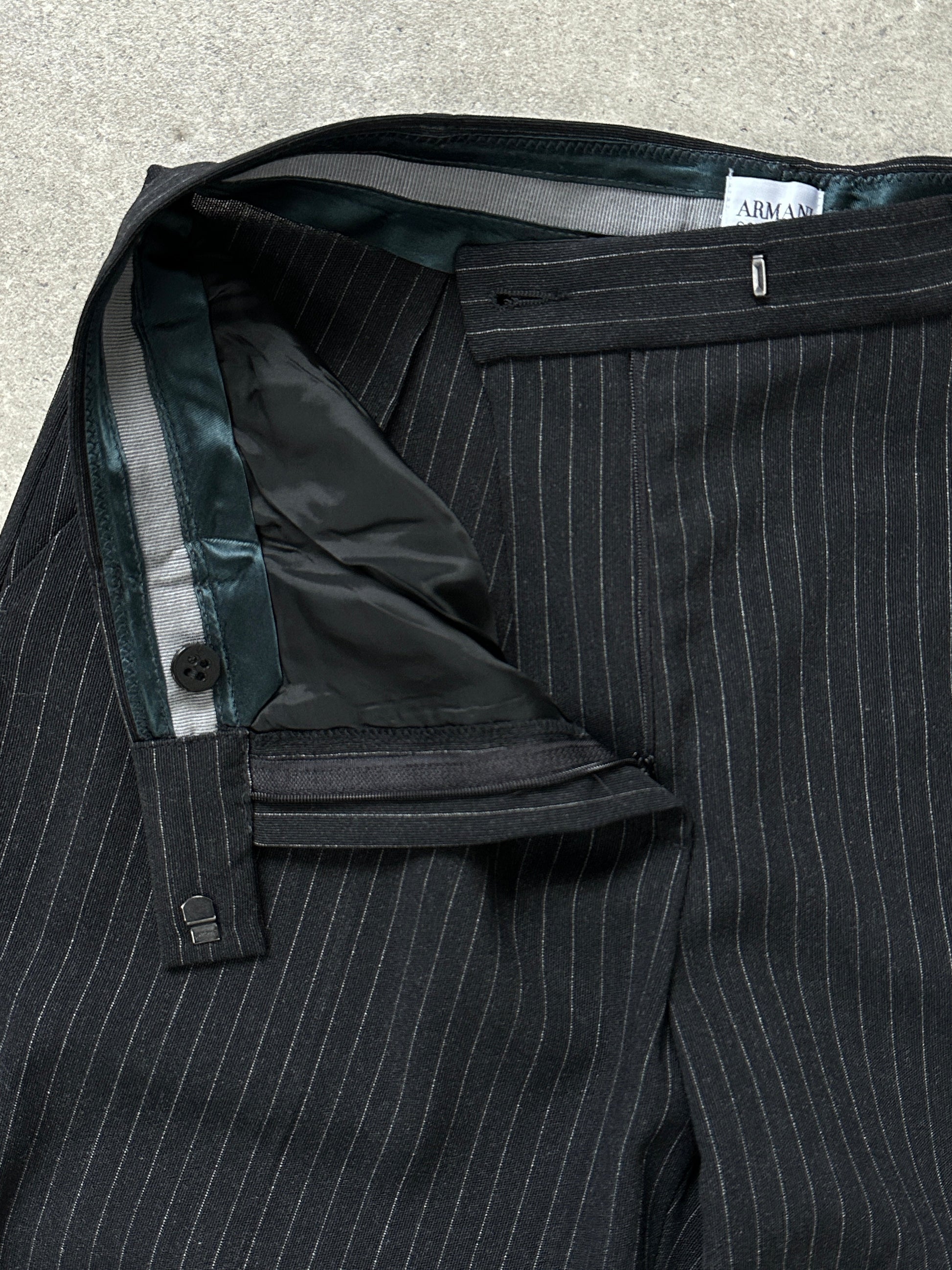 Vintage Armani Collezioni 2000s tailored trousers in a dark grey pinstripe wool, finished with a clean straight leg and classic mid-rise silhouette. Presented brand new with original tags and left unhemmed, allowing for a fully custom finish.