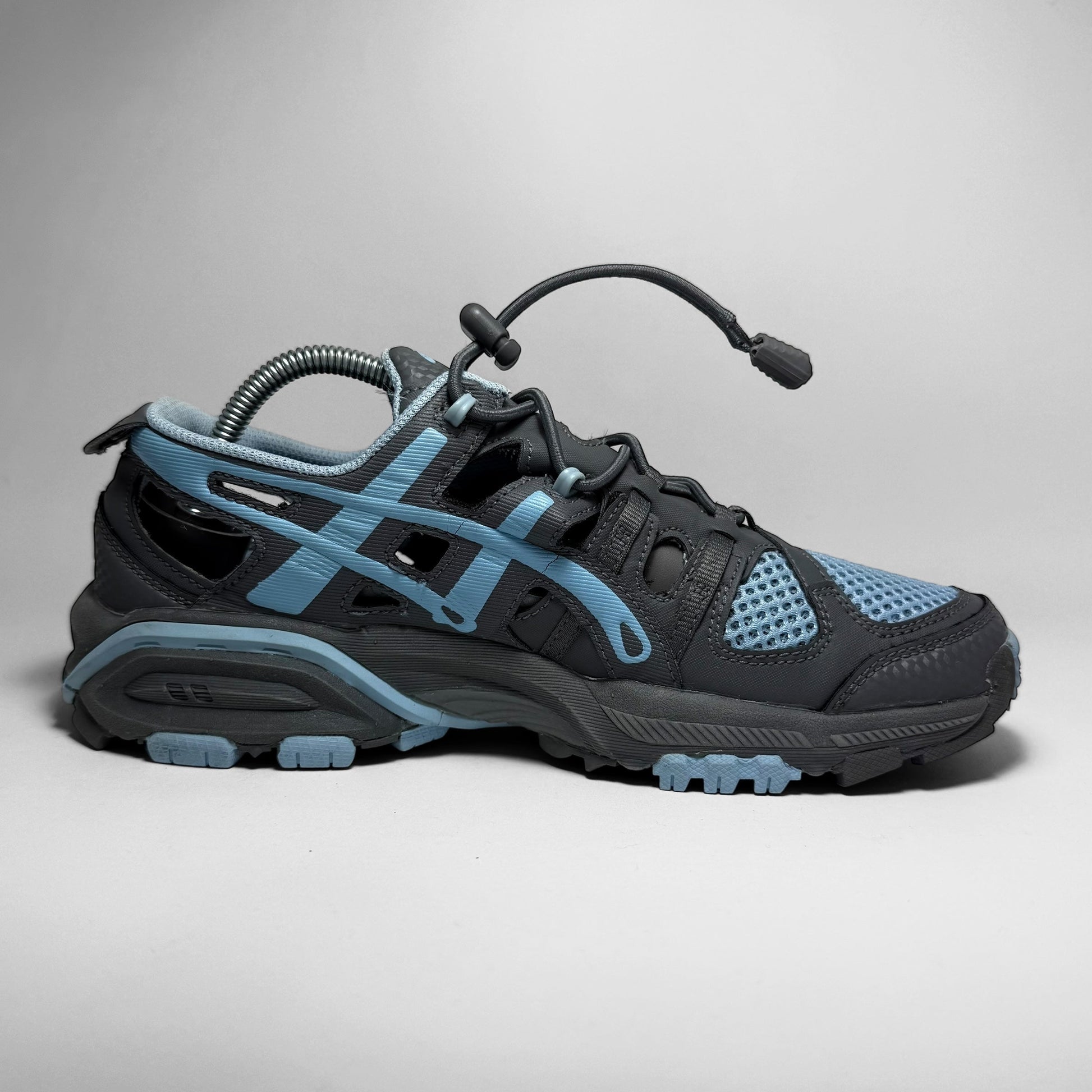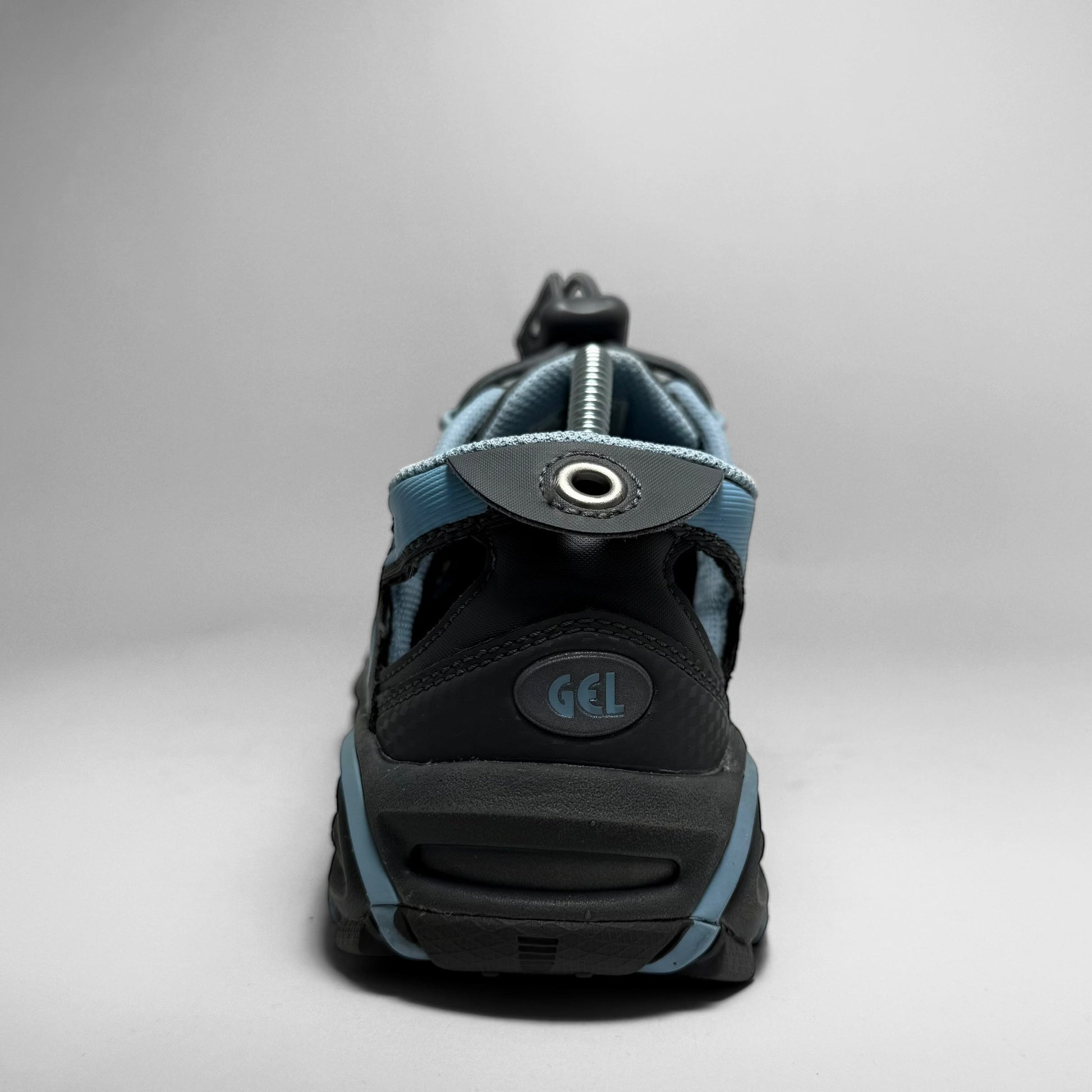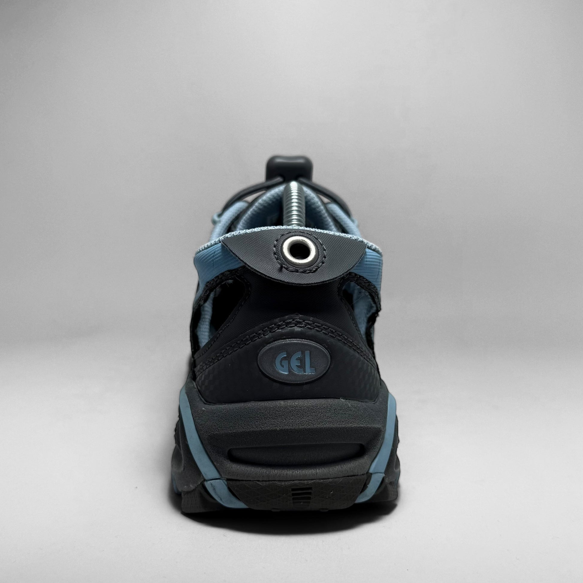 Built with breathable mesh and layered synthetic overlays, featuring cut-out side panels (sandal-like), toggle lacing, and GEL cushioning in the midsole.