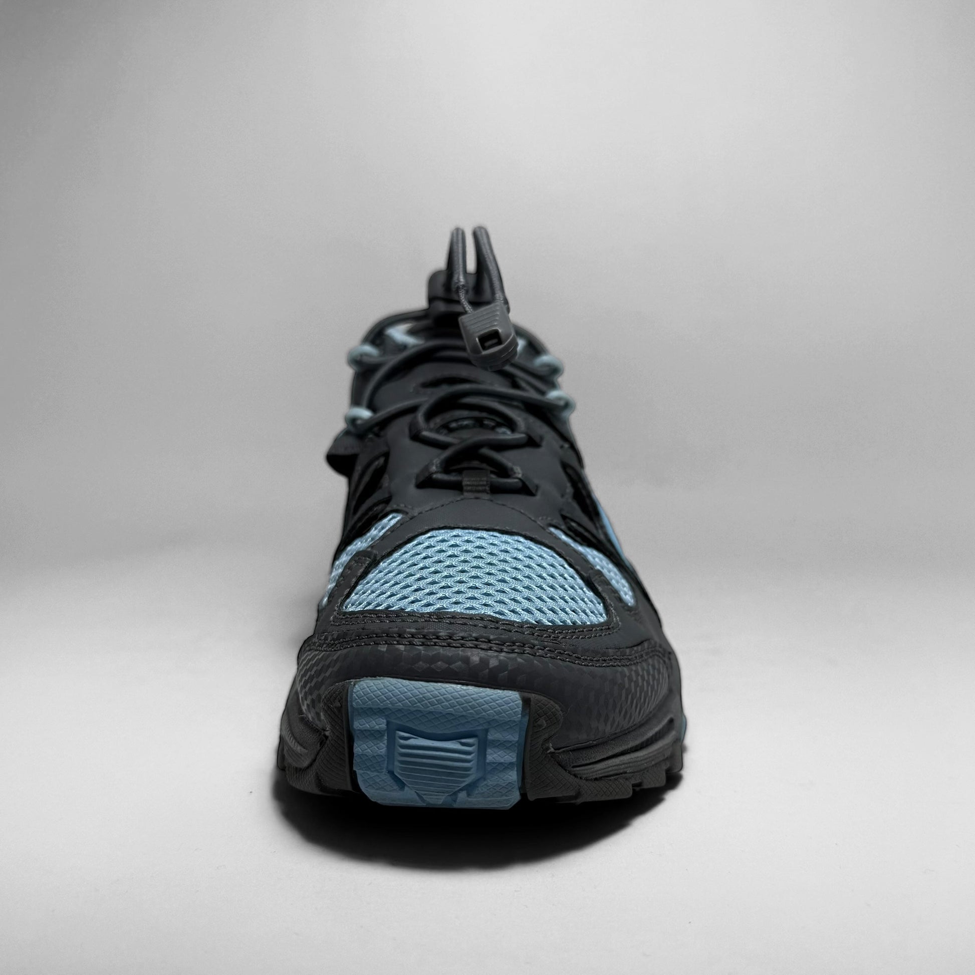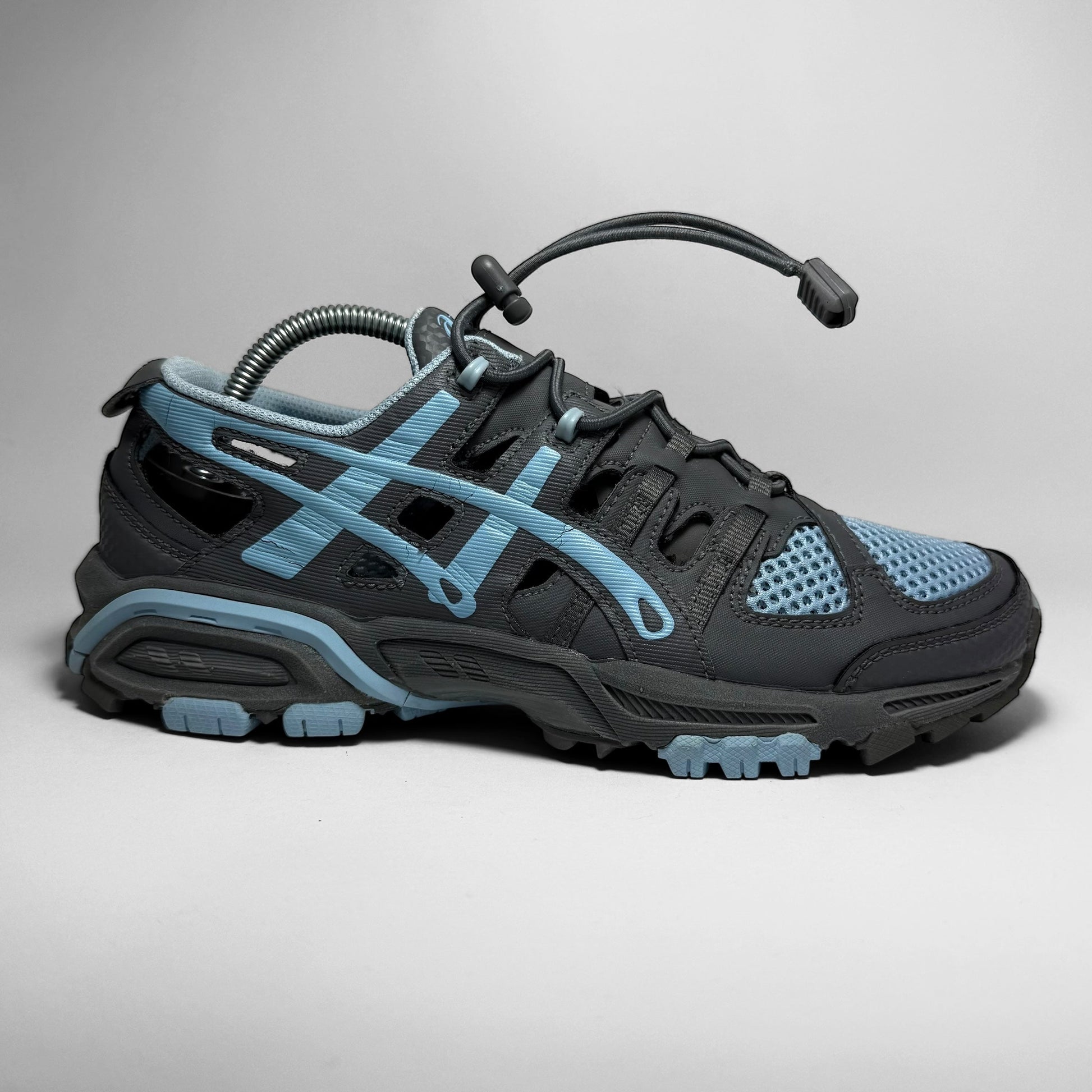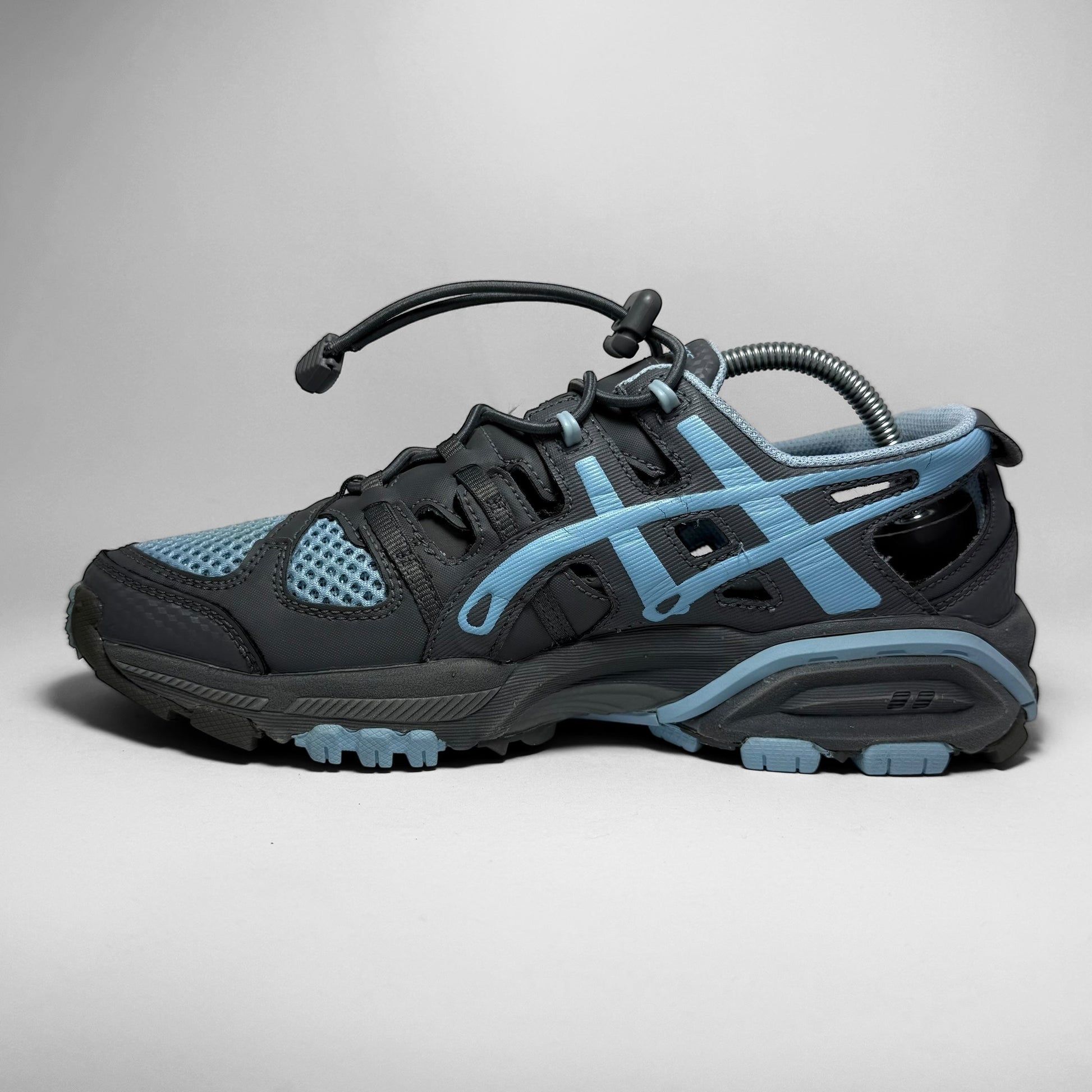 Built with breathable mesh and layered synthetic overlays, featuring cut-out side panels (sandal-like), toggle lacing, and GEL cushioning in the midsole.
