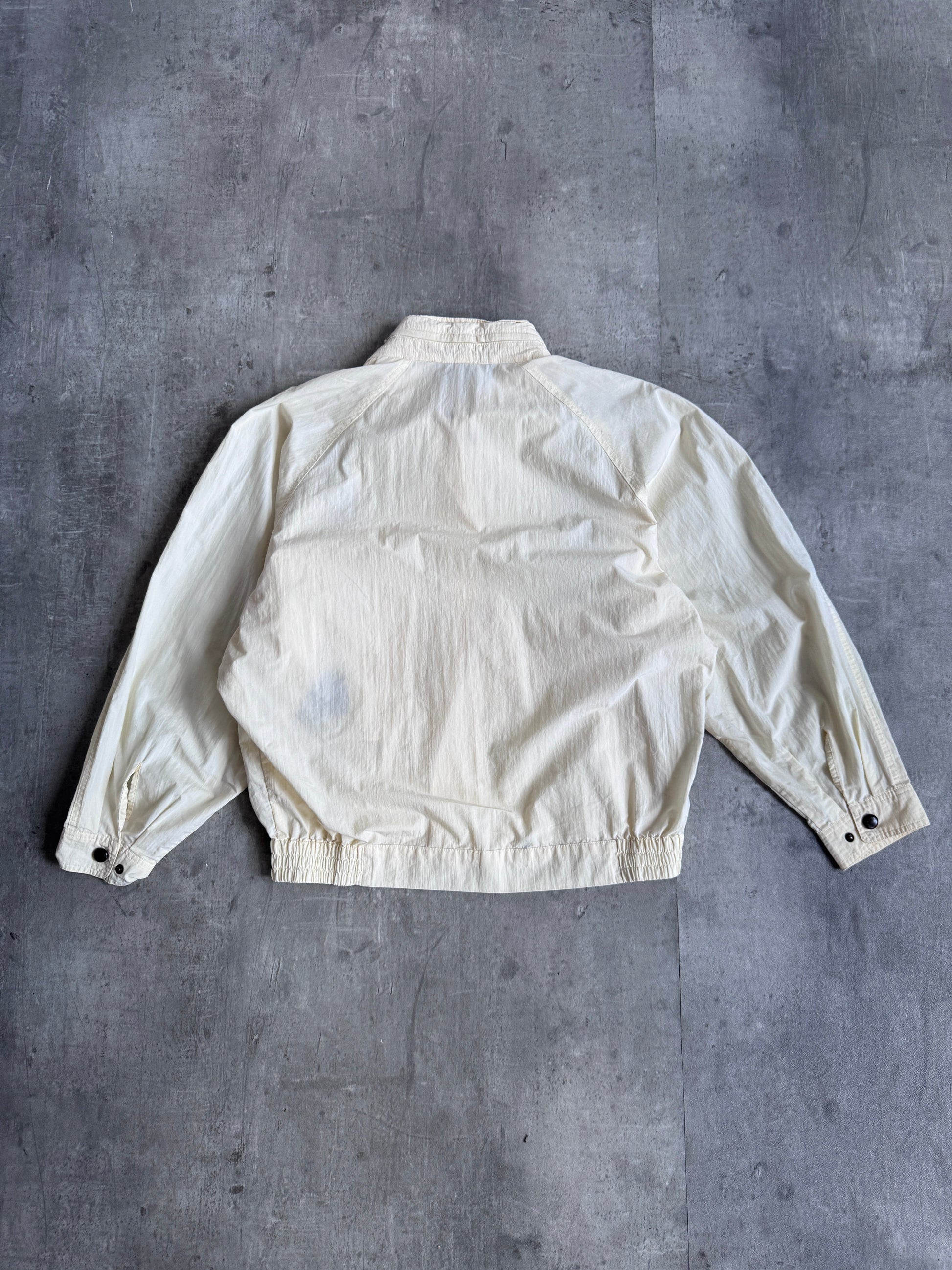 A vintage Burberry bomber jacket in a soft cream tone, designed with casual ease and understated detailing. Featuring a subtle embroidered Burberry logo crest at the chest and a hidden hood, this piece combines functionality with timeless style. Its lightweight construction makes it perfect for transitional layering.