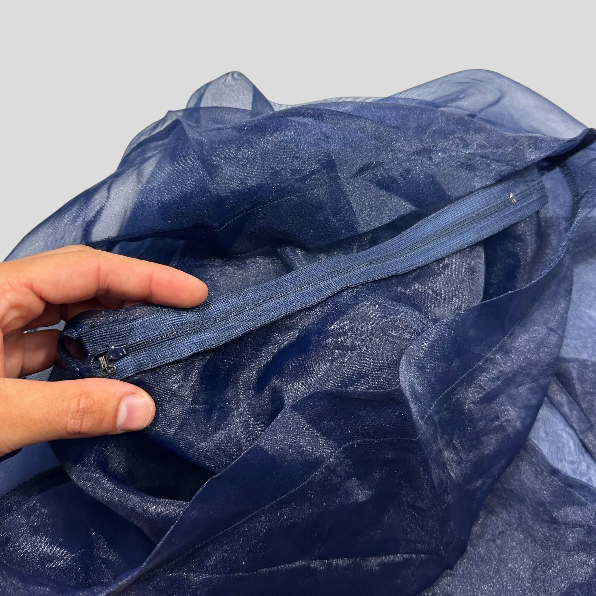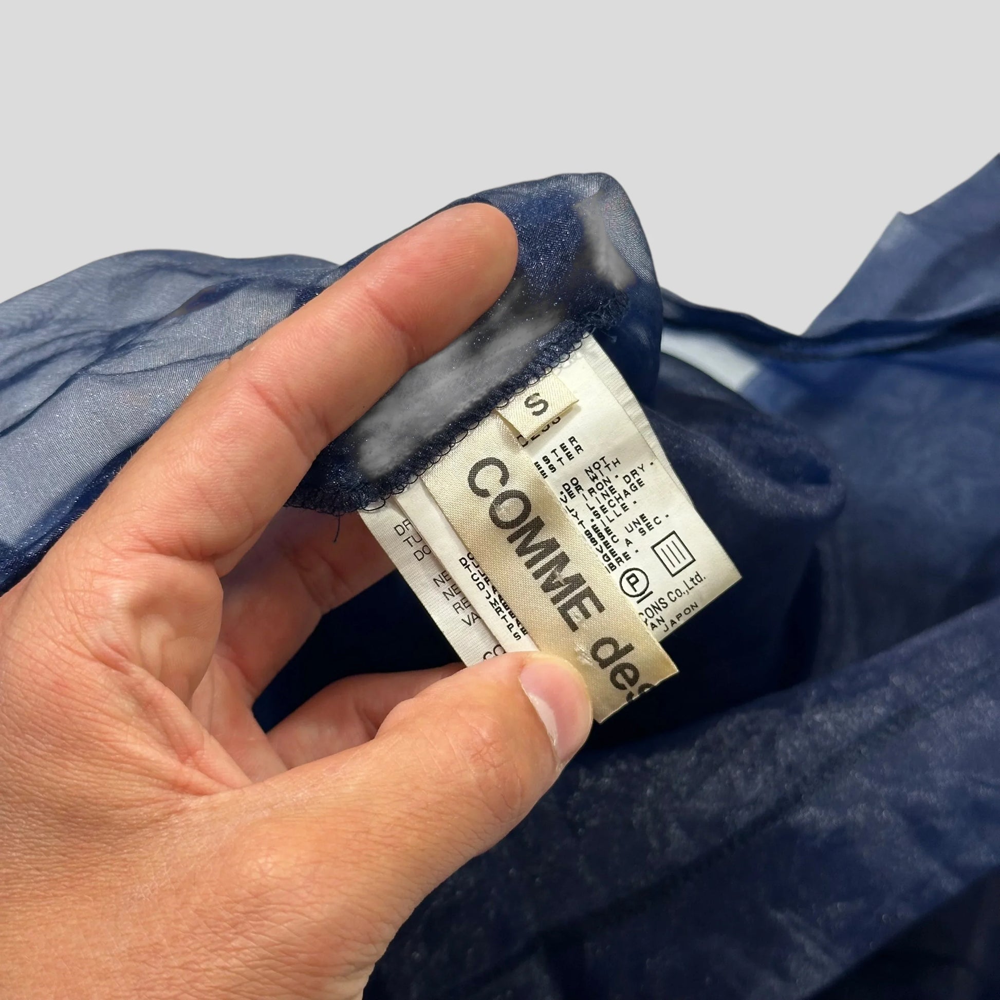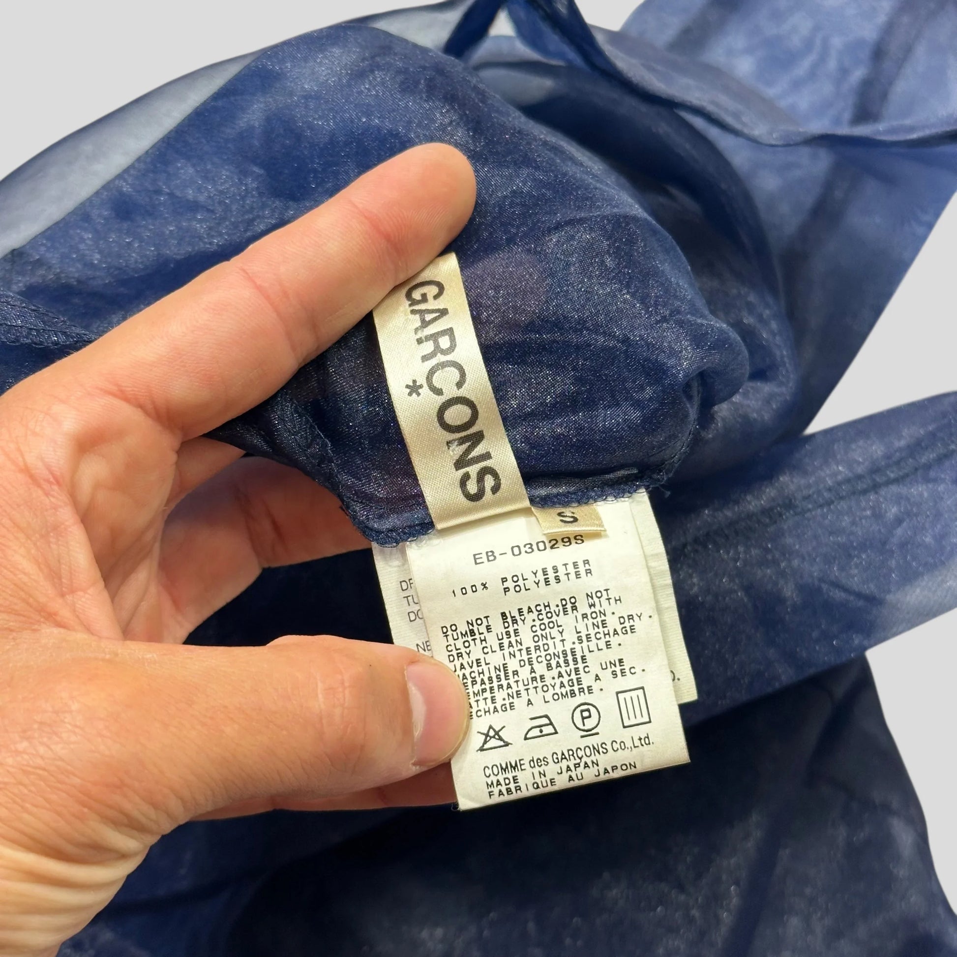 Very rare AD1997 Comme Des Garçons blue polyester see through sheer mesh top, incredibly unique piece from their punk themed 1997 collection, blending Japanese materials with sheer layering and punk style.