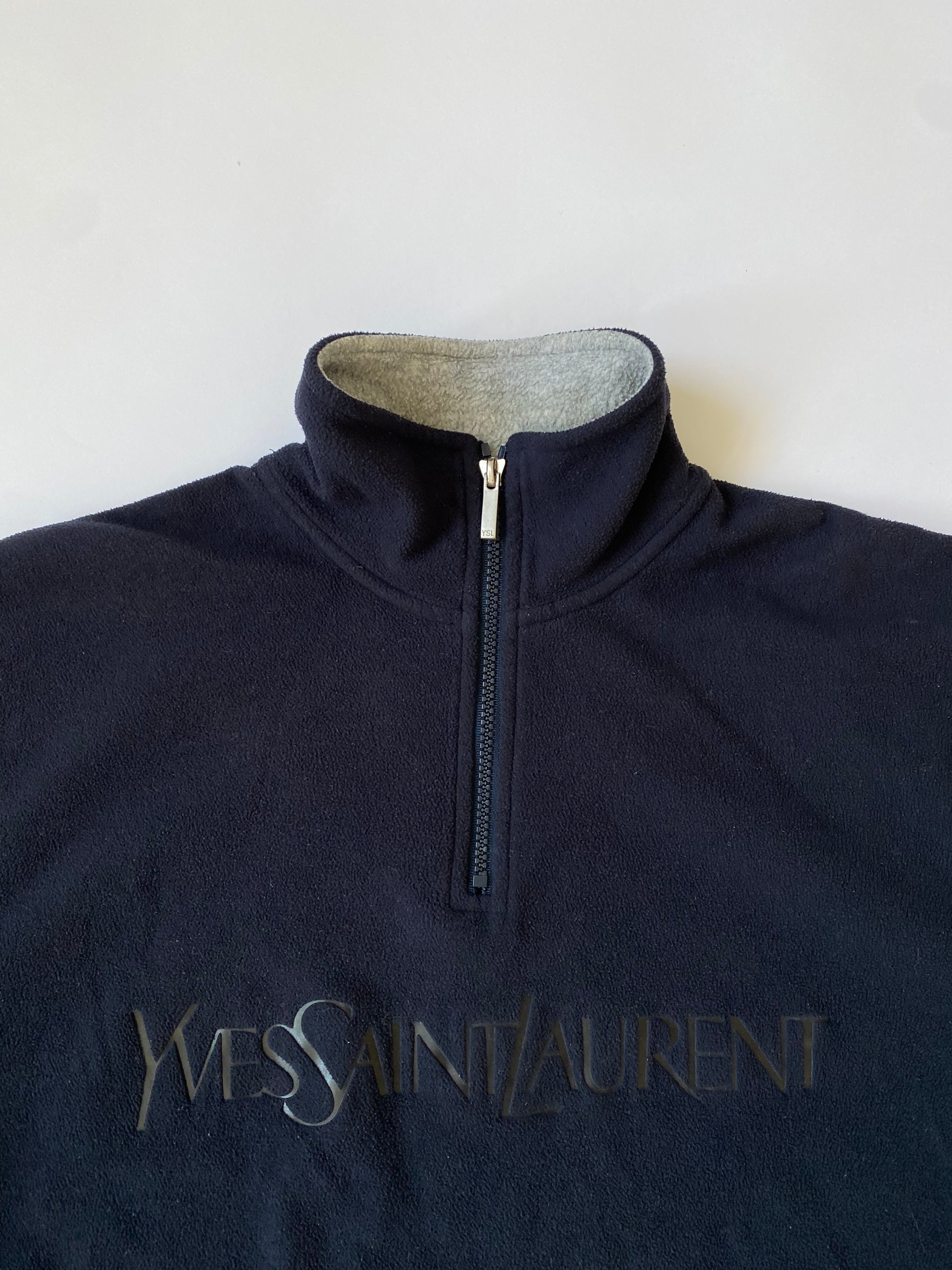 Yves Saint Laurent Spellout Fleece Quarter Zip. Lovely soft navy, relaxed, cozy sweatshirt. 100% Polyester, black printed spellout on the front.