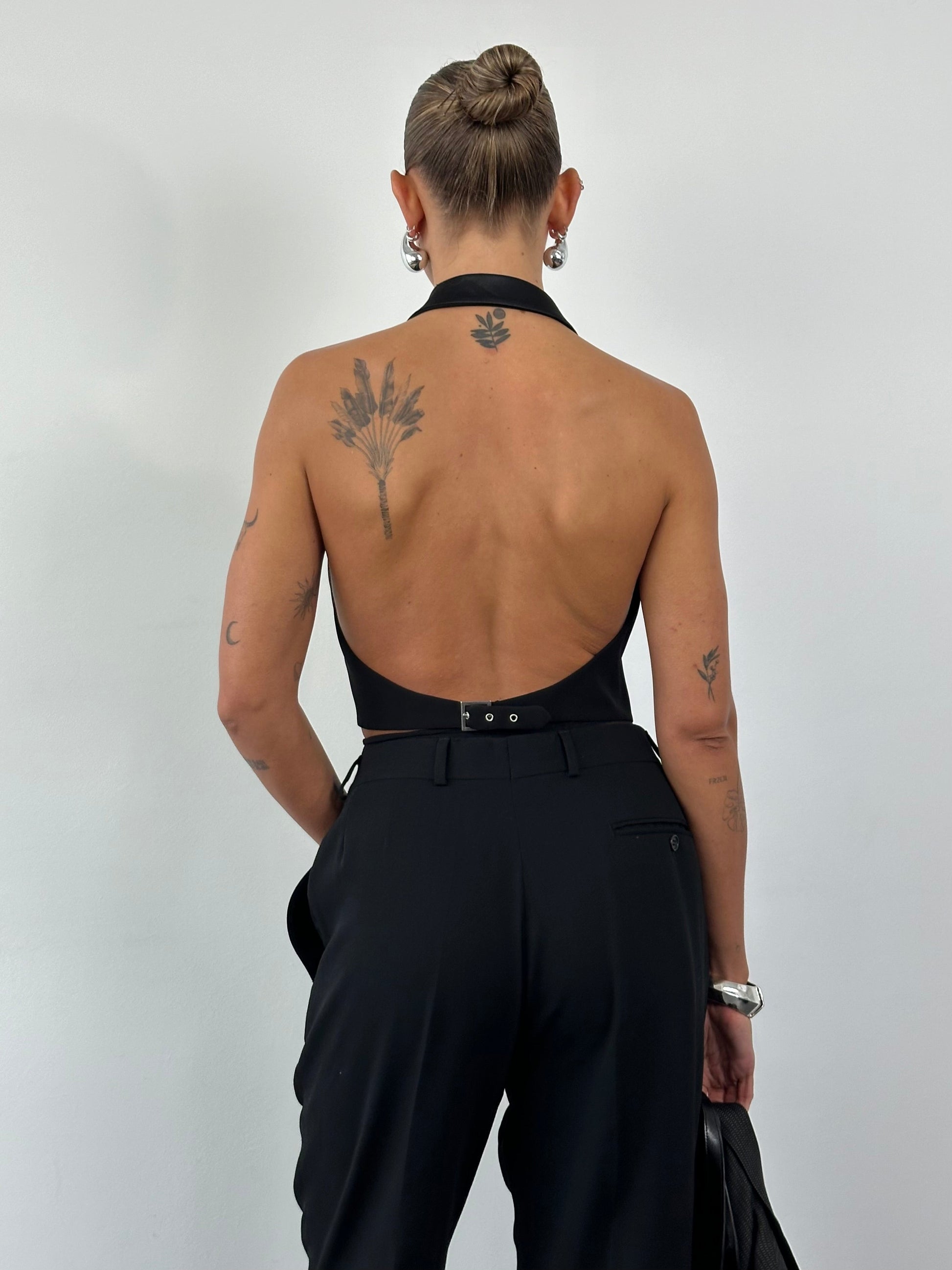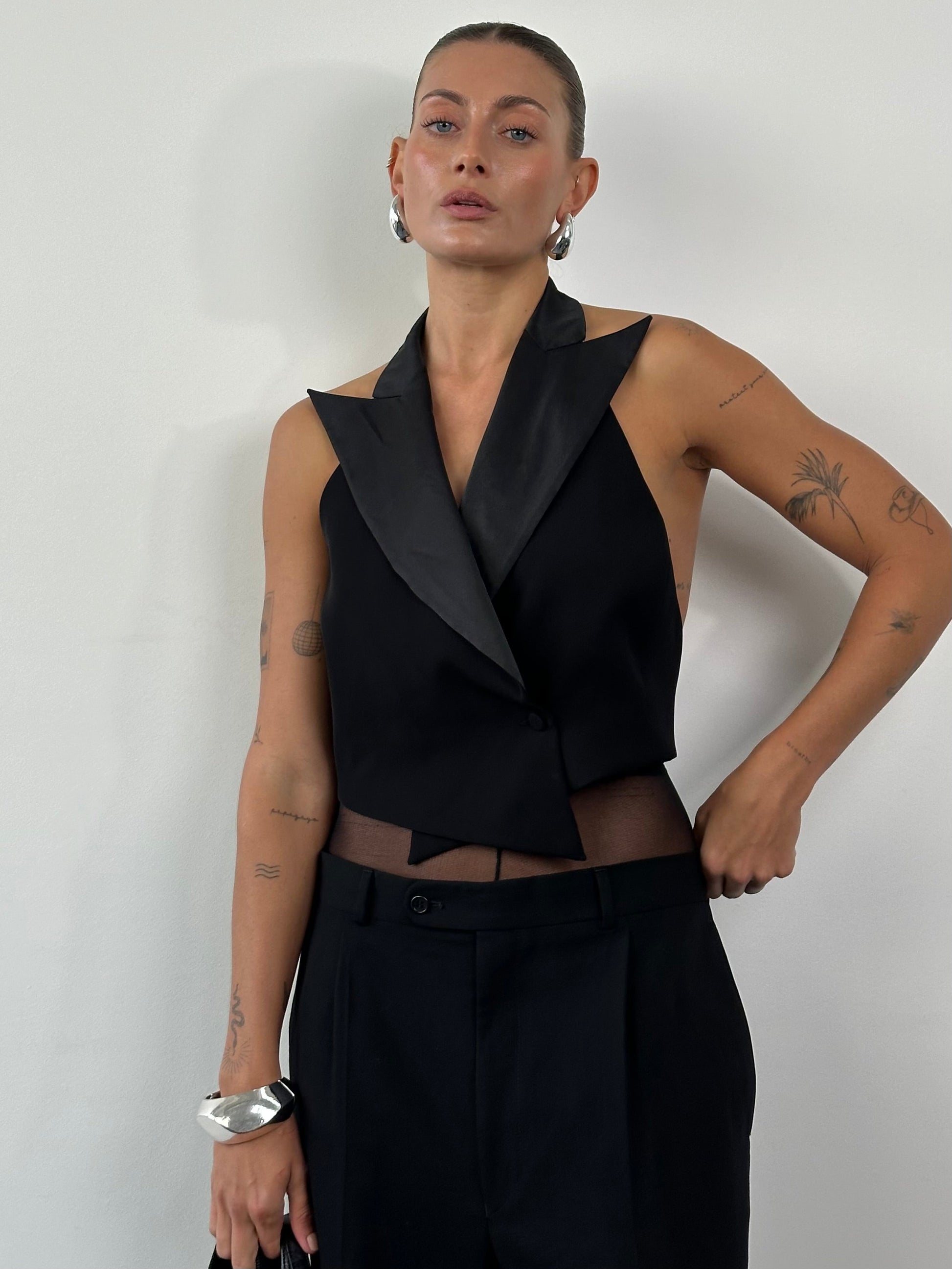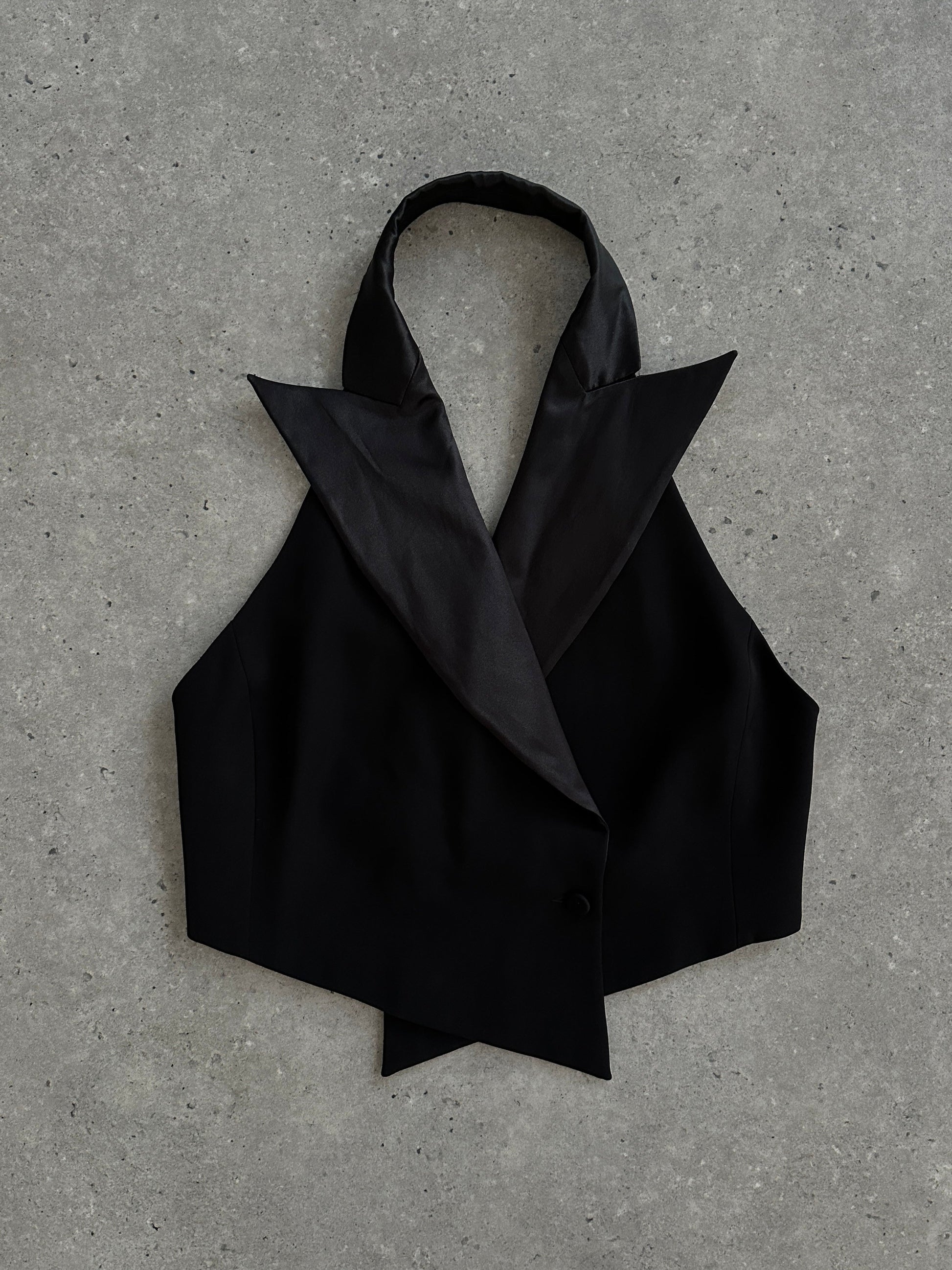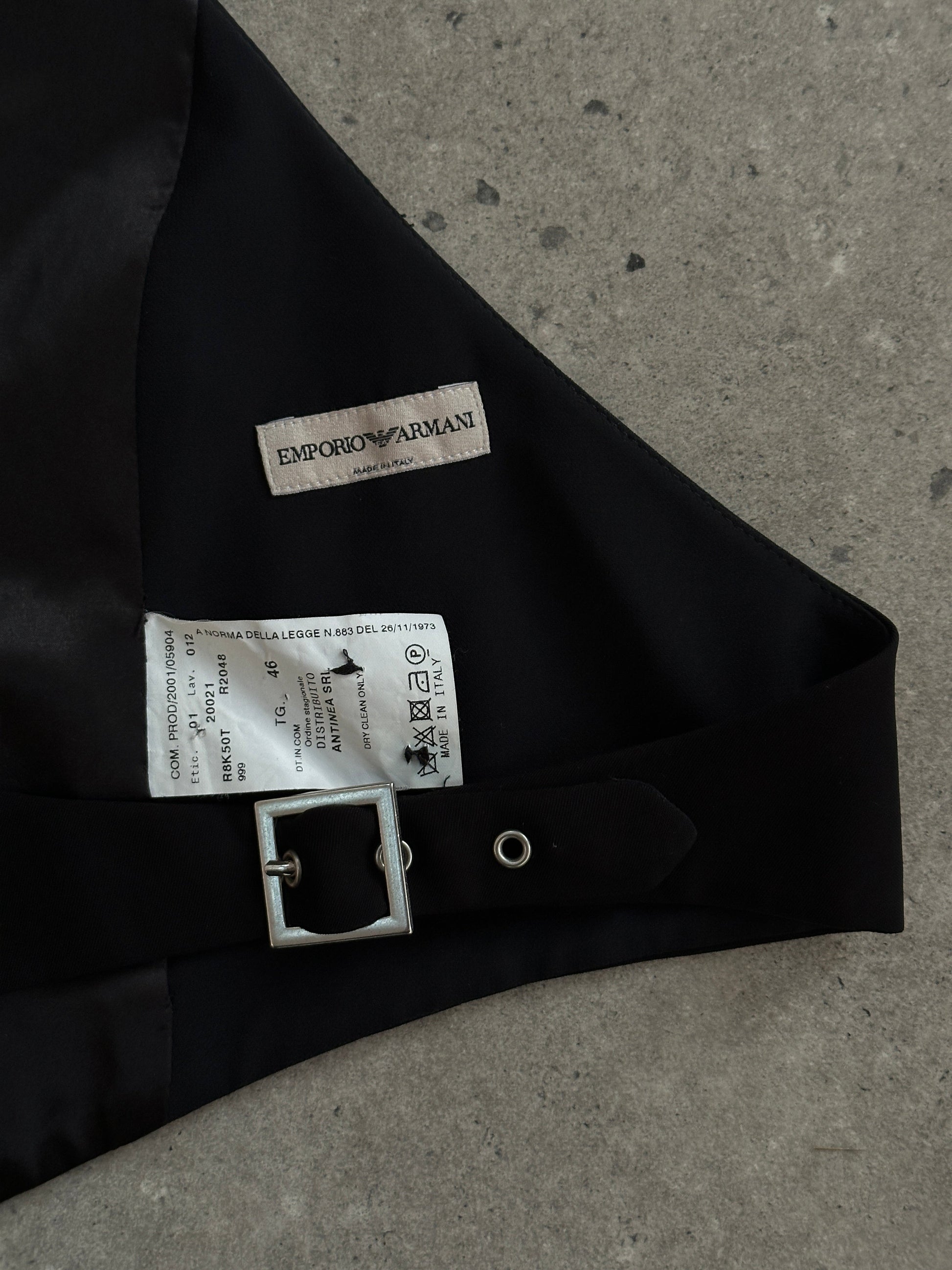 Indulge in the luxurious appeal of the SS 2002 Emporio Armani's Pure Silk Tuxedo Waistcoat, crafted with 100% silk large dagger collar and backless design. As seen on the runway.