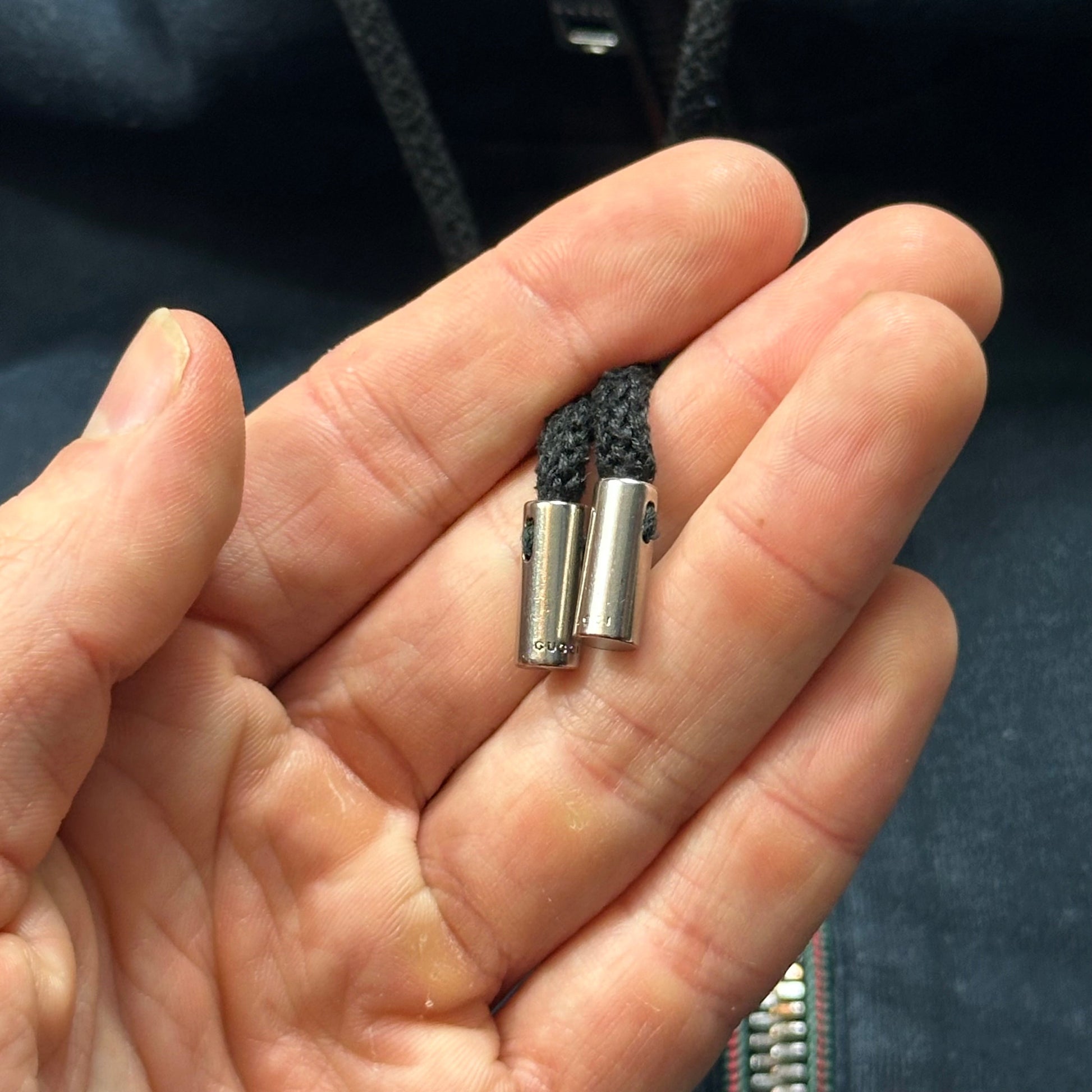 Rare 2008 navy thick cotton zip-up Gucci hoodie, unique Gucci web stripe detailing running along the zips, metal Gucci aglets and zips.