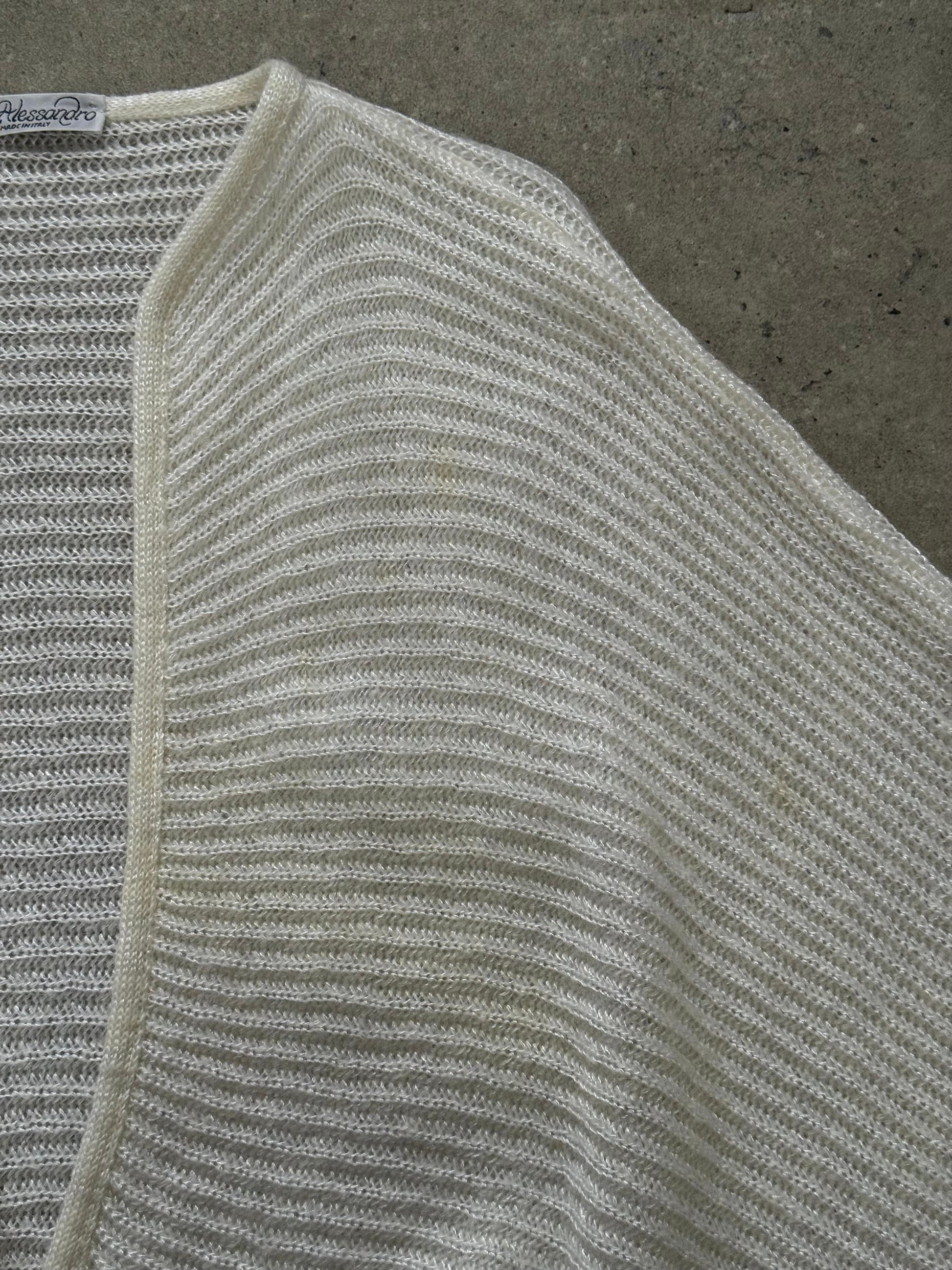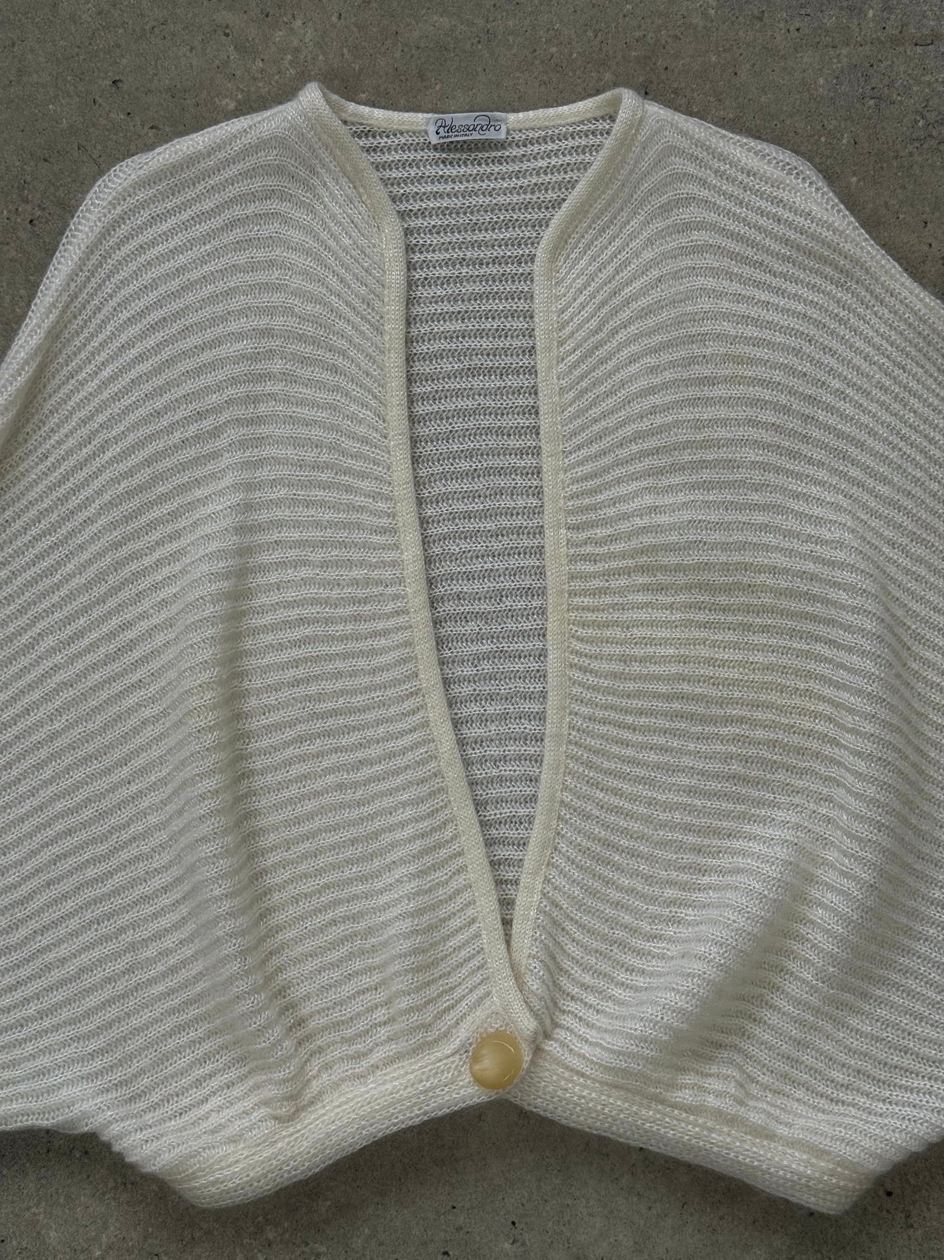 Vintage Italian 1990s cream cardigan in a soft brushed mohair blend, designed with a sculptural cropped silhouette and a single tonal statement button fastening. The ribbed knit texture and wide, fluid sleeves create an elegant shawl-inspired drape.