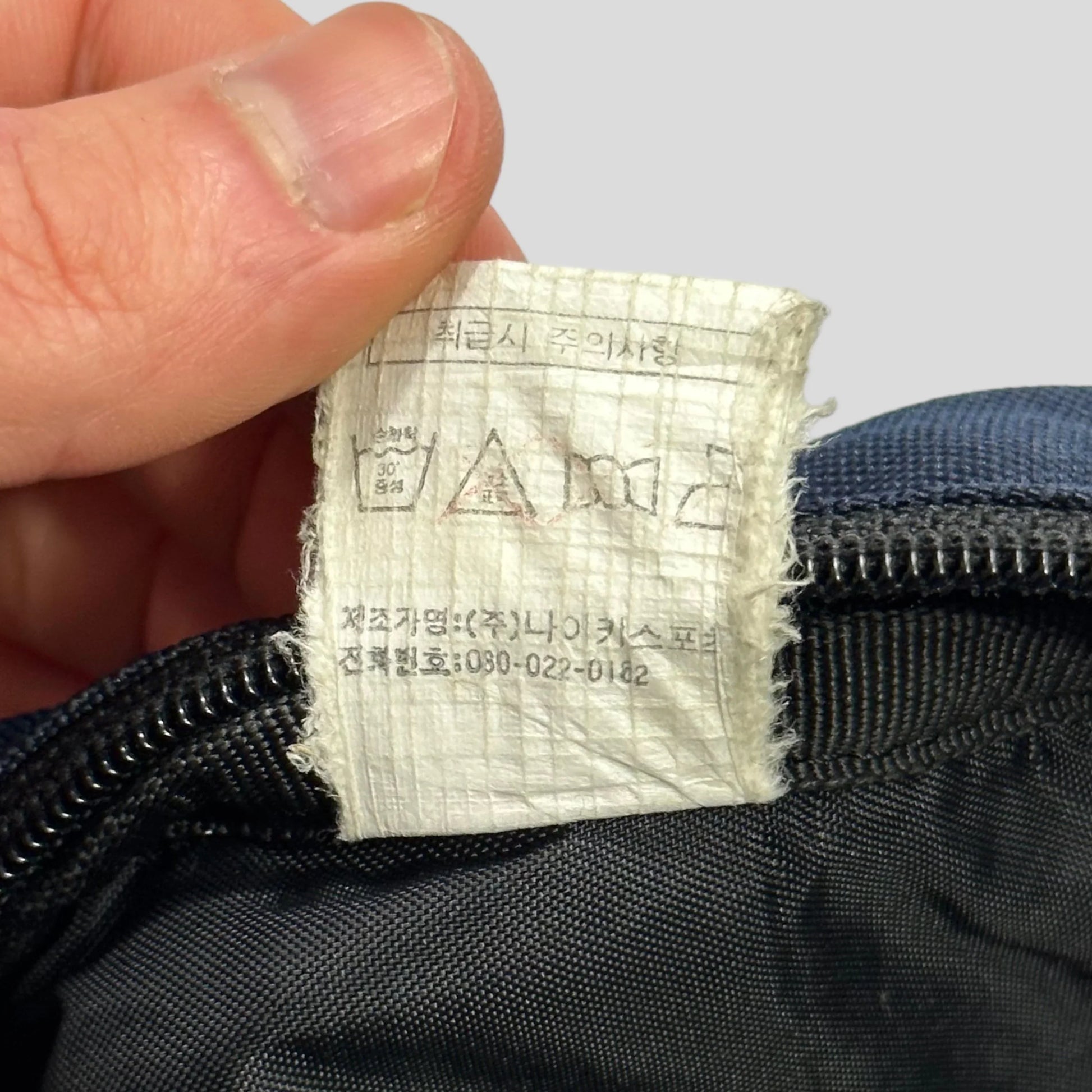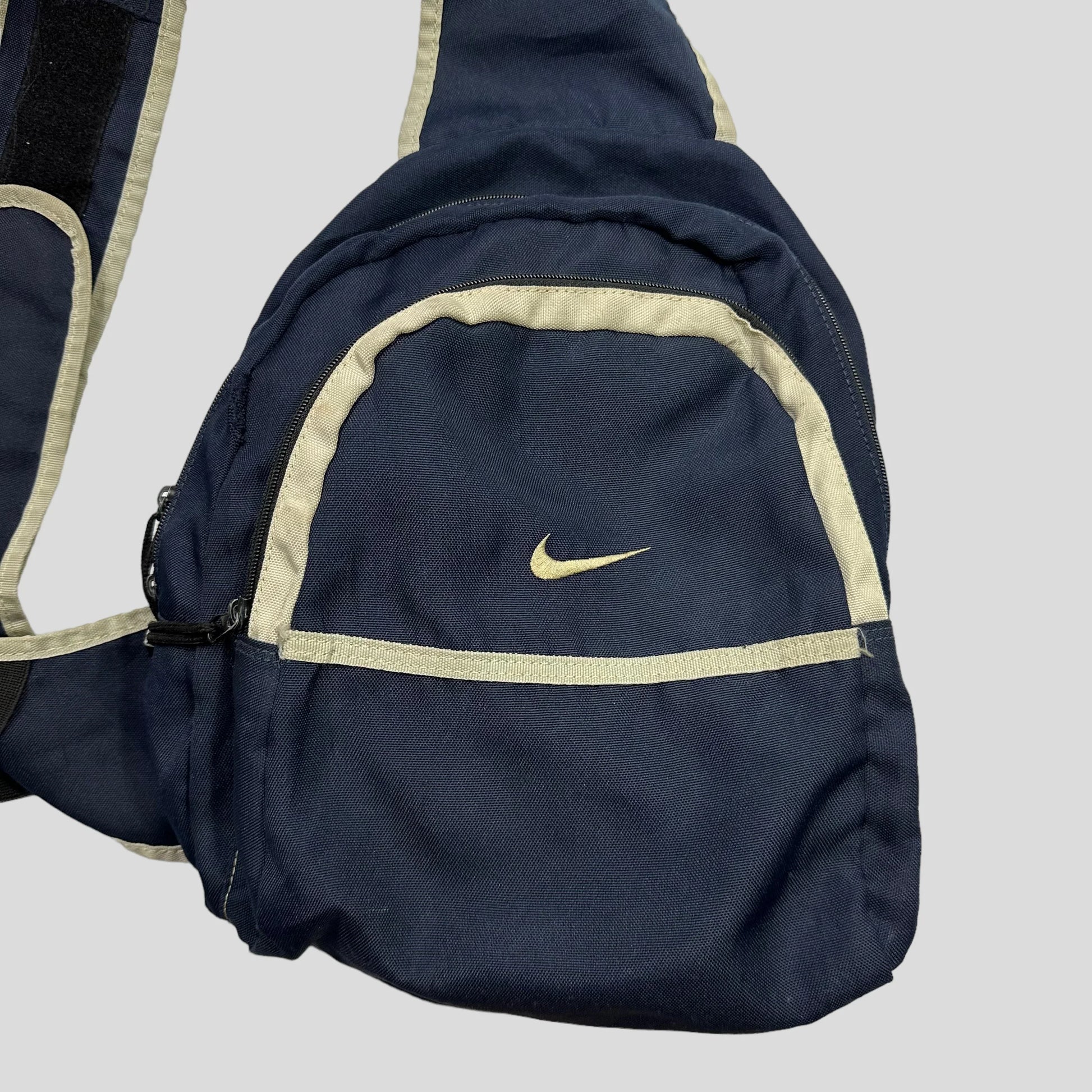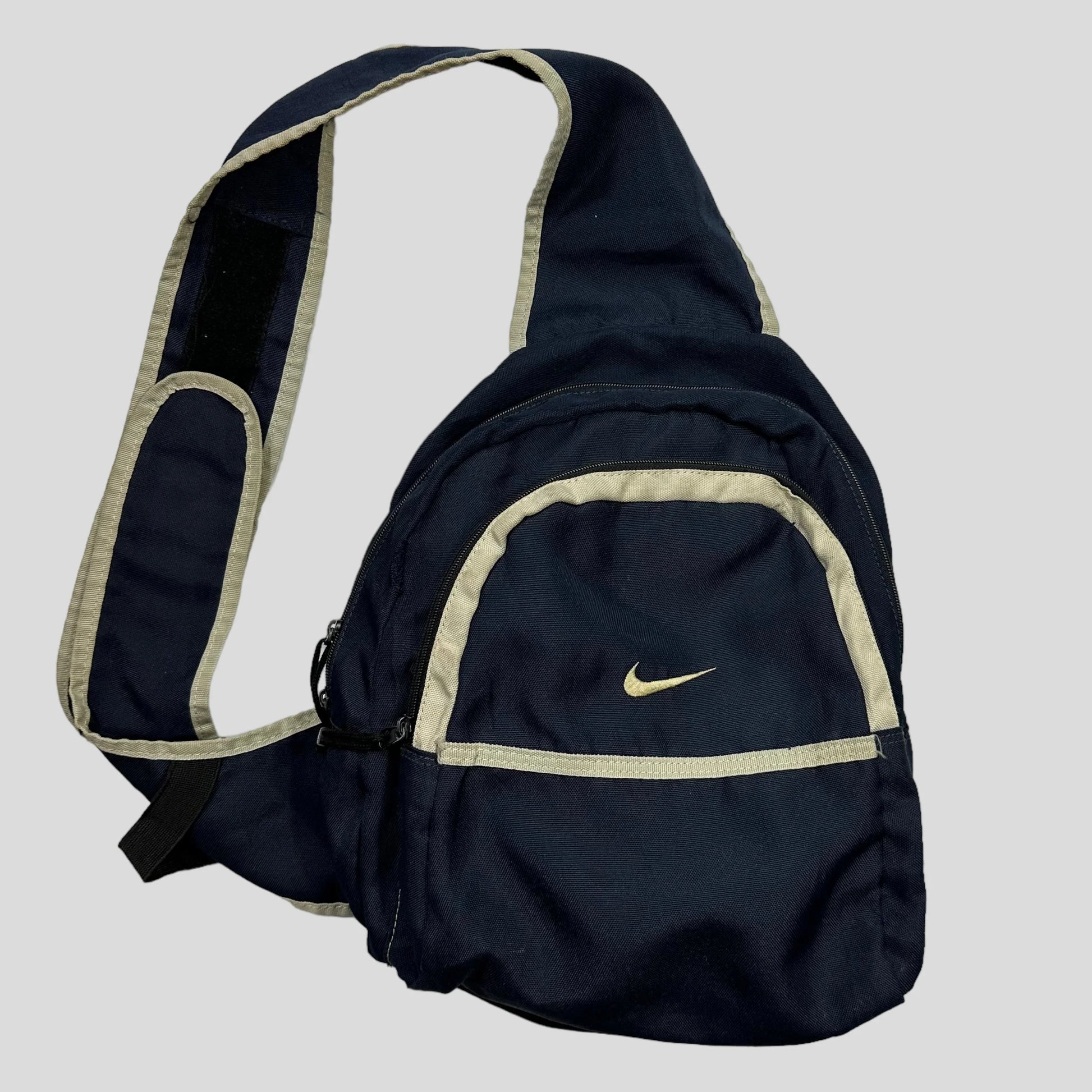 Navy and cream sling bag, embroidered swoosh, carabiner and multipocket slots in front pouch, adjustable strap with flame embrodiery and phone netted pouch.