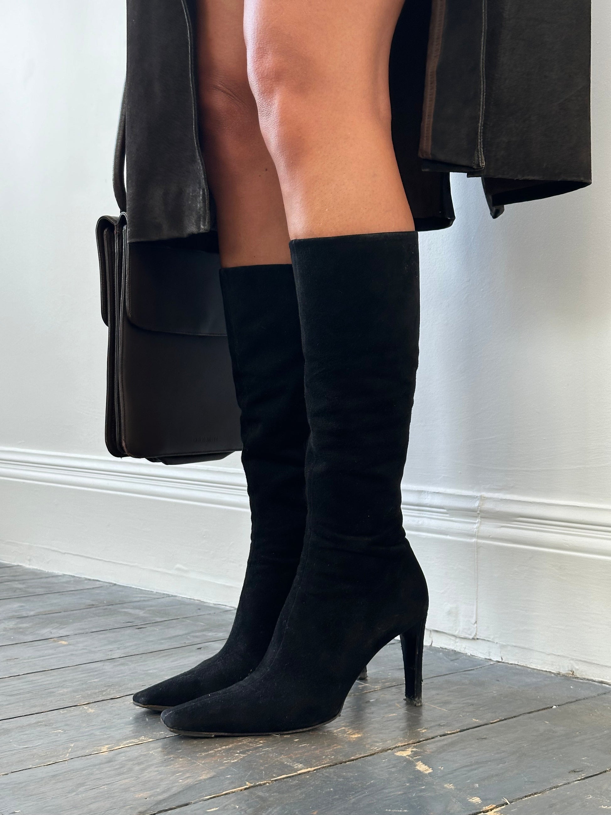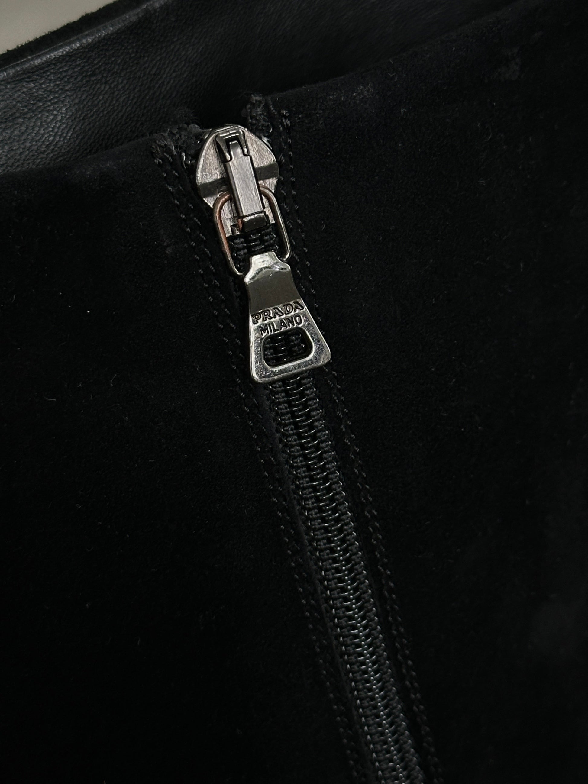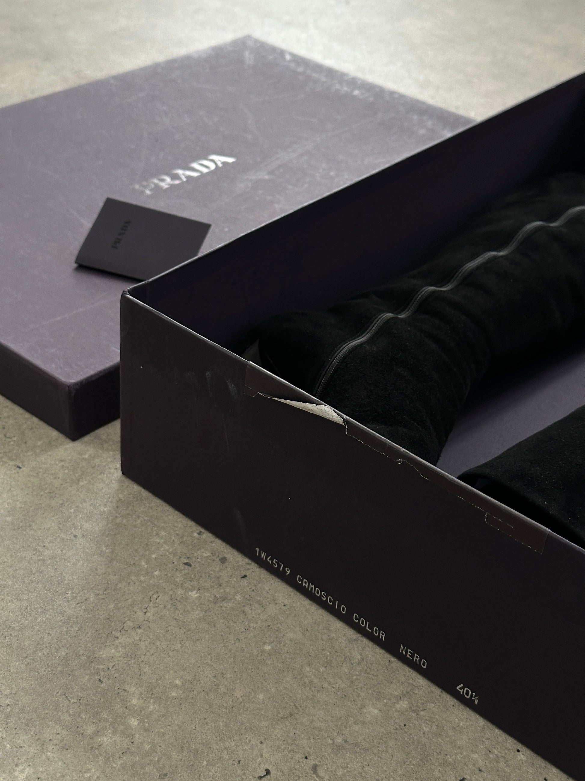 Vintage 2000s Prada square toe heeled knee boots in black velvety goatskin suede. A sharp elongated silhouette that reflects Prada’s refined Y2K footwear design language.