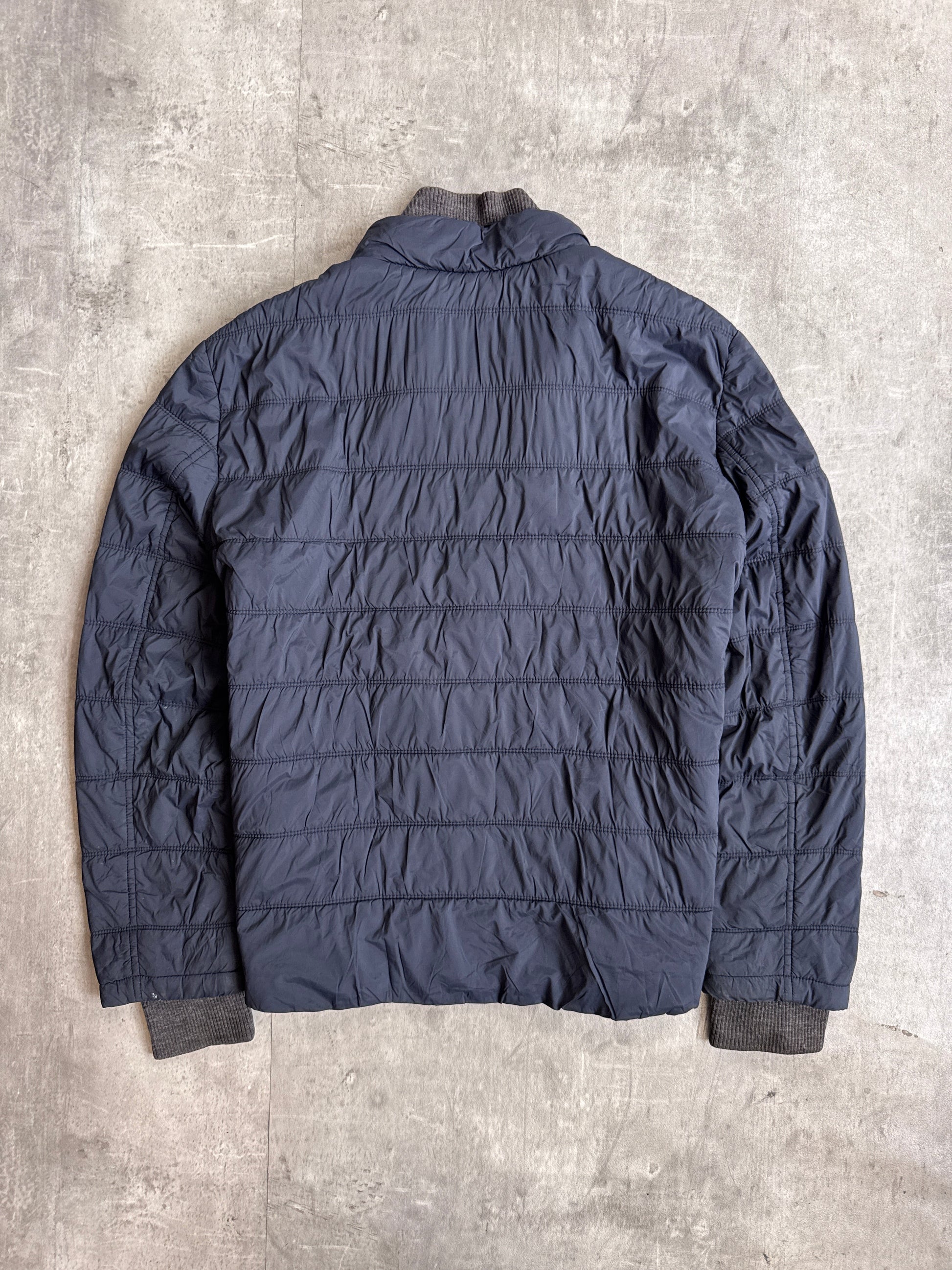 A sleek example of Prada’s utilitarian minimalism, this Ribbed Collar Navy Rain Jacket combines function and luxury in equal measure. Constructed from lightweight, water-resistant nylon, it offers effortless protection from the elements while maintaining a refined silhouette.