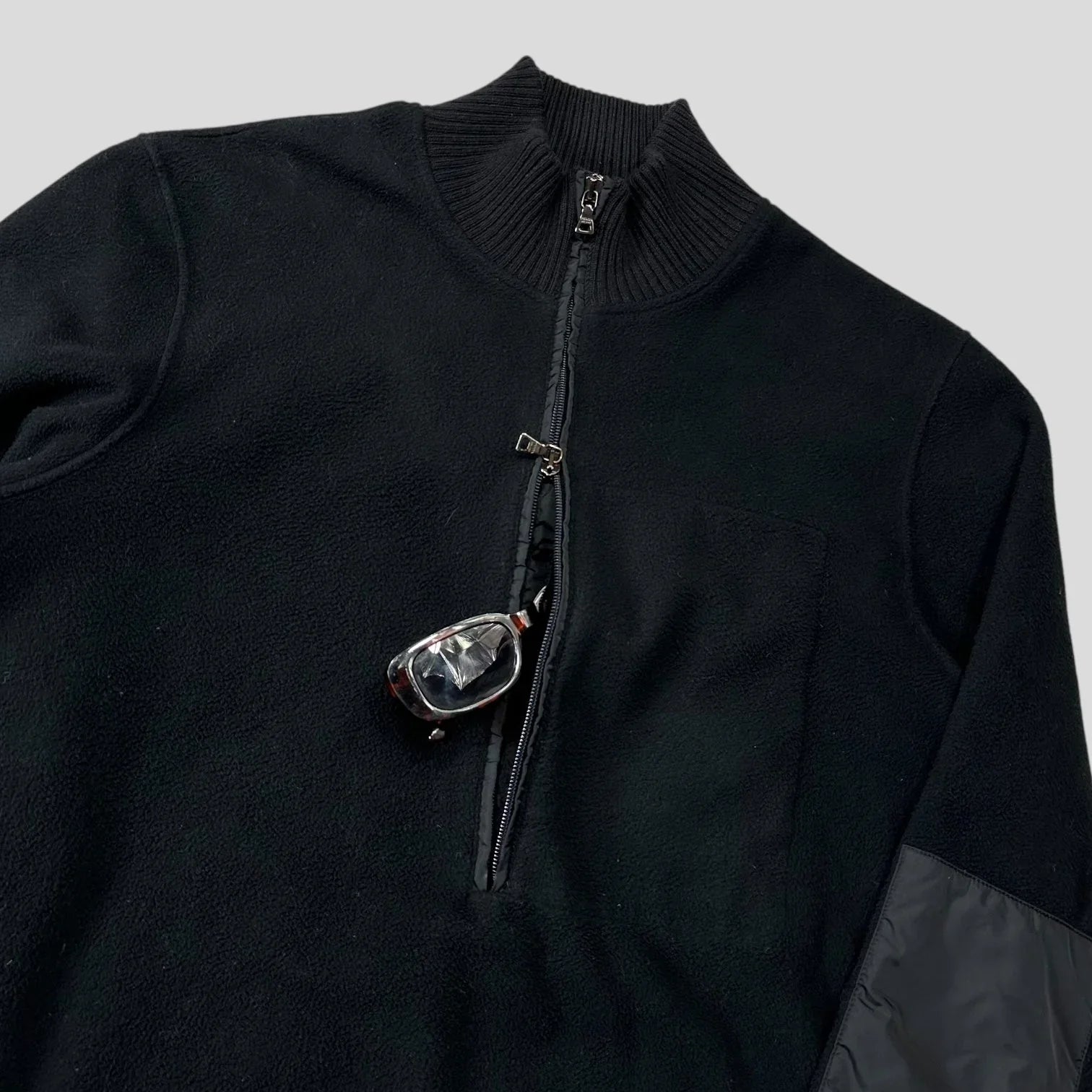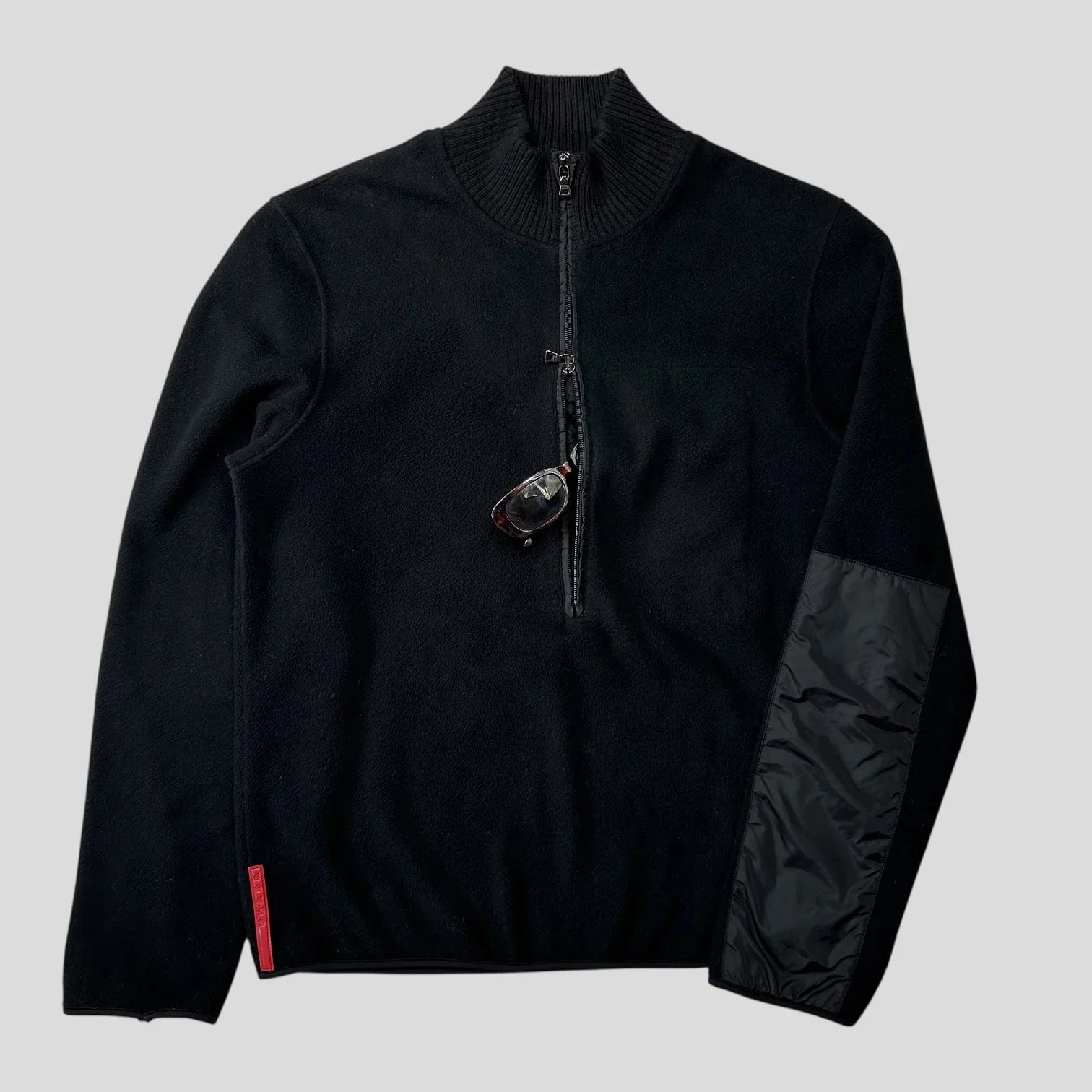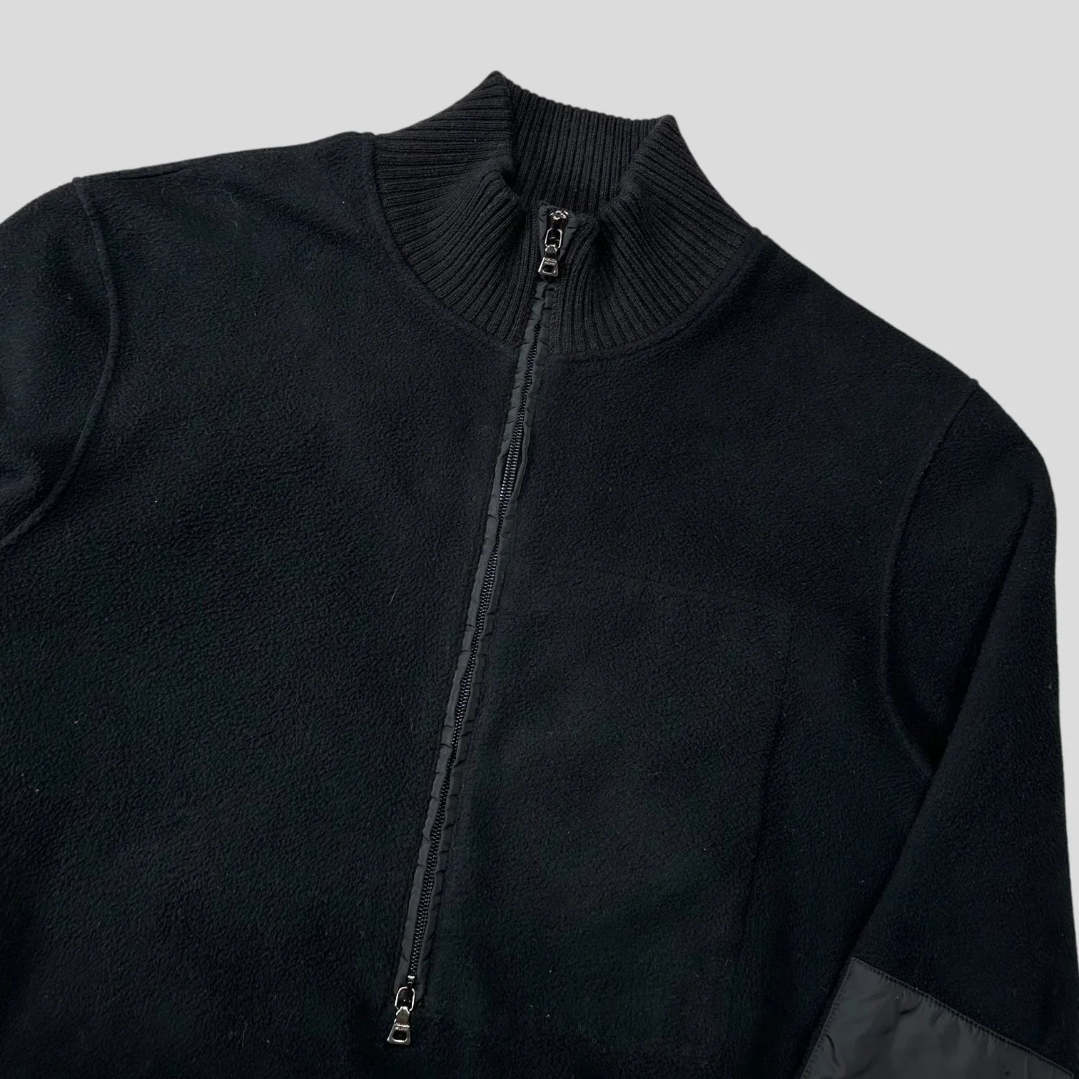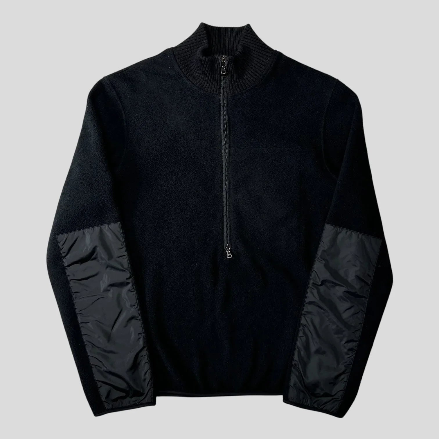 Very rare early 2000’s Prada Sport black fleece, wool collared neck, nylon panelled elbows, double 1/2 zip with a hidden nylon stash pocket inside, fleece construction.