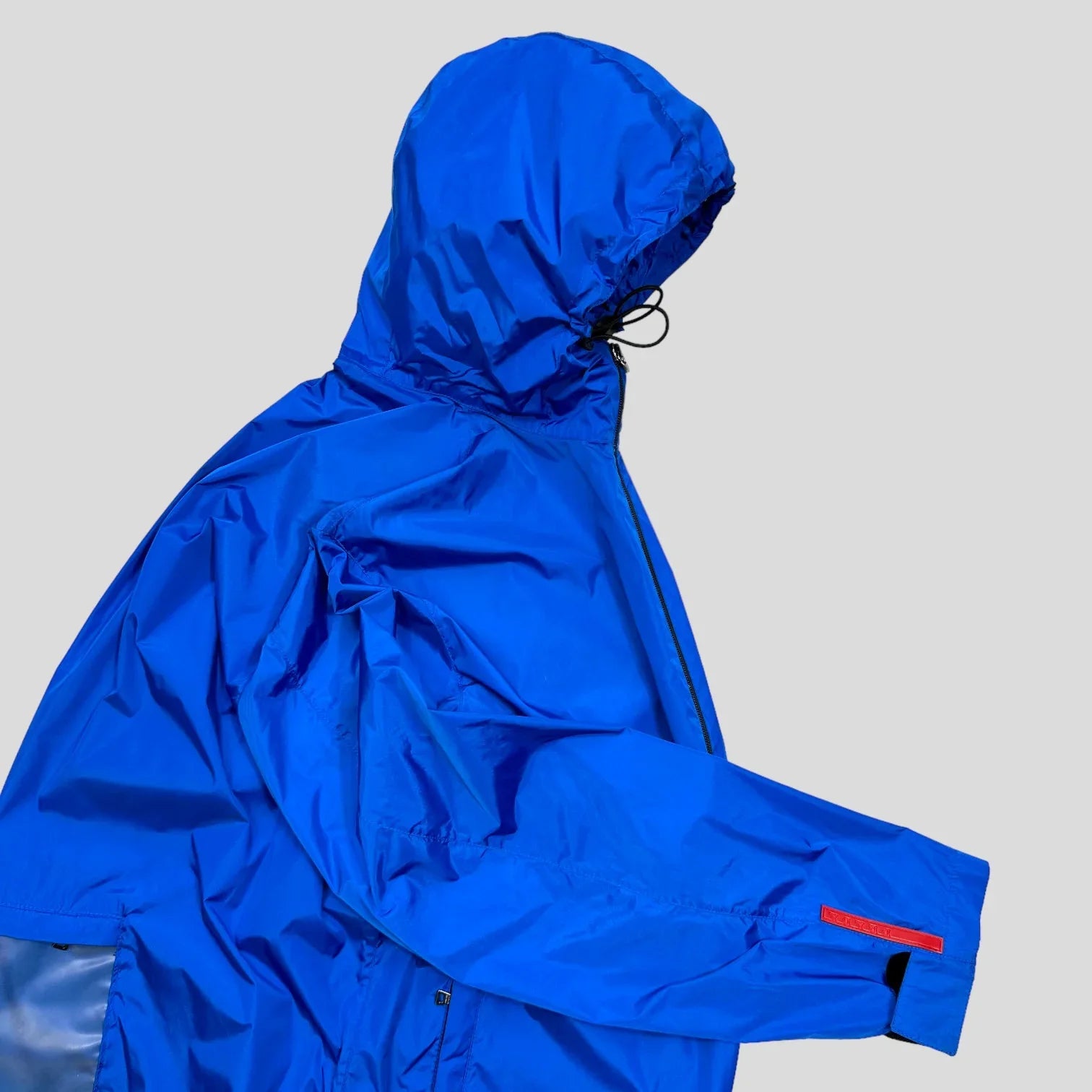 Jacket is nylon with a polyurethane coating that catches the light, cinchable hem and hood via drawstrings, cuffs adjustable with Velcro straps, zip hand pockets at front, finished with Prada Sport red tab to cuff.
