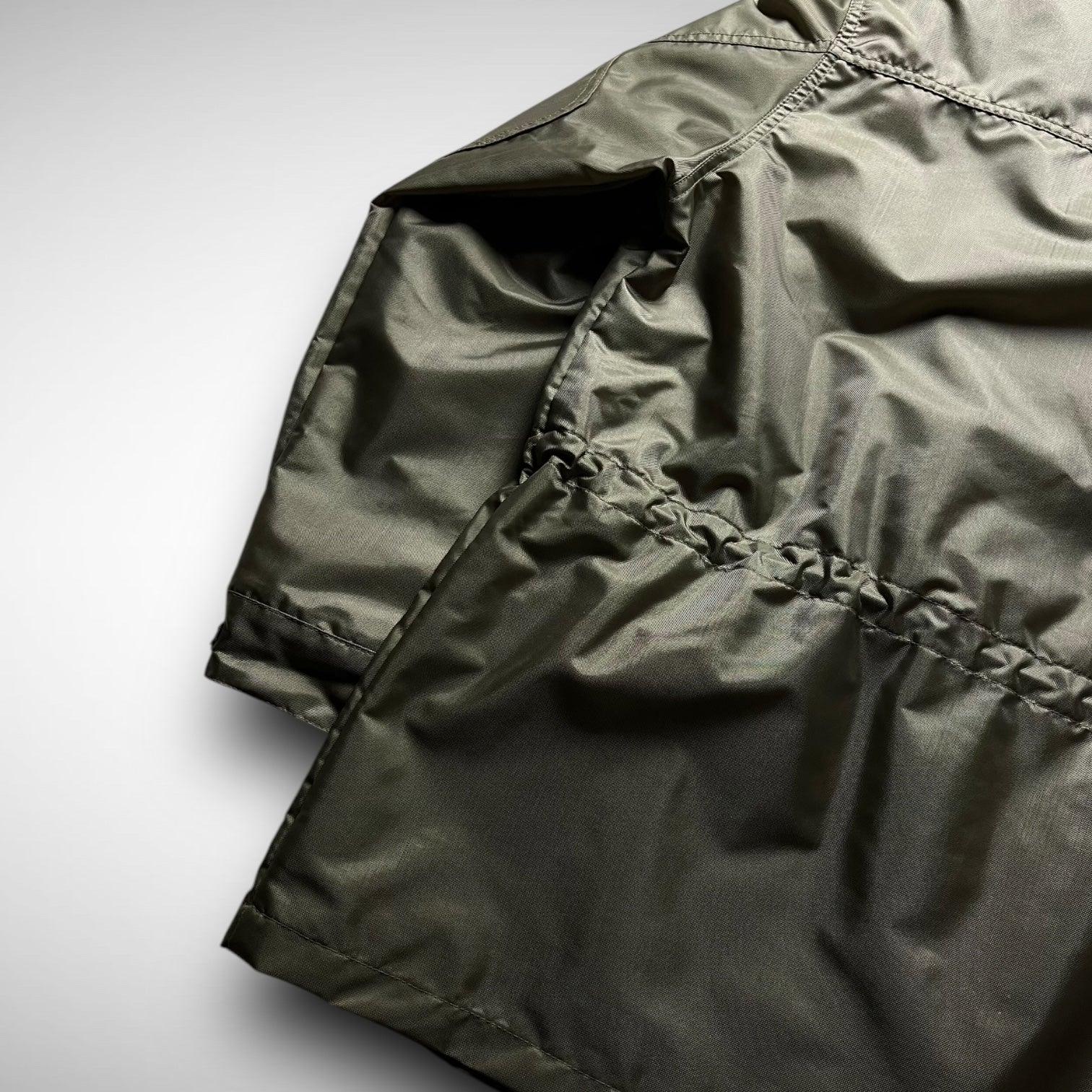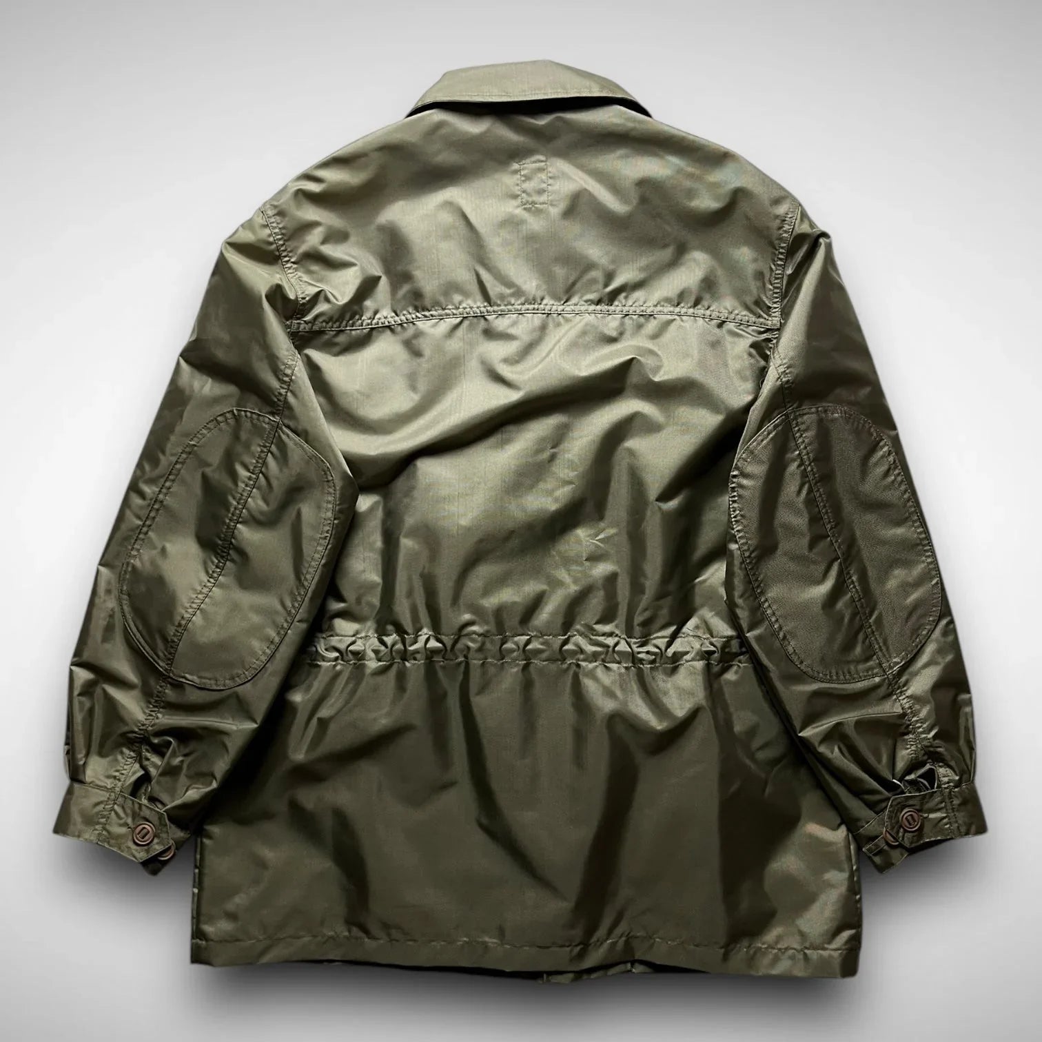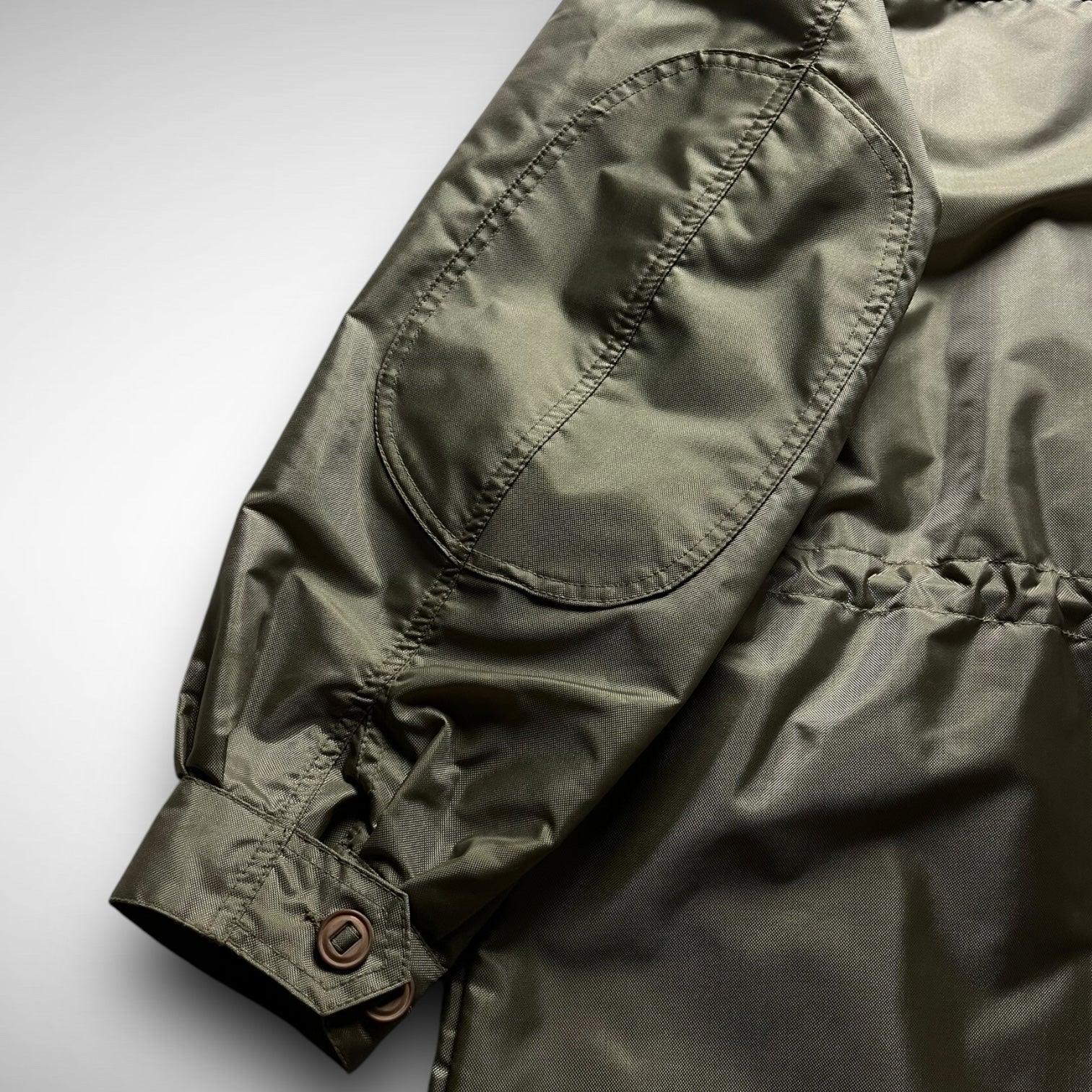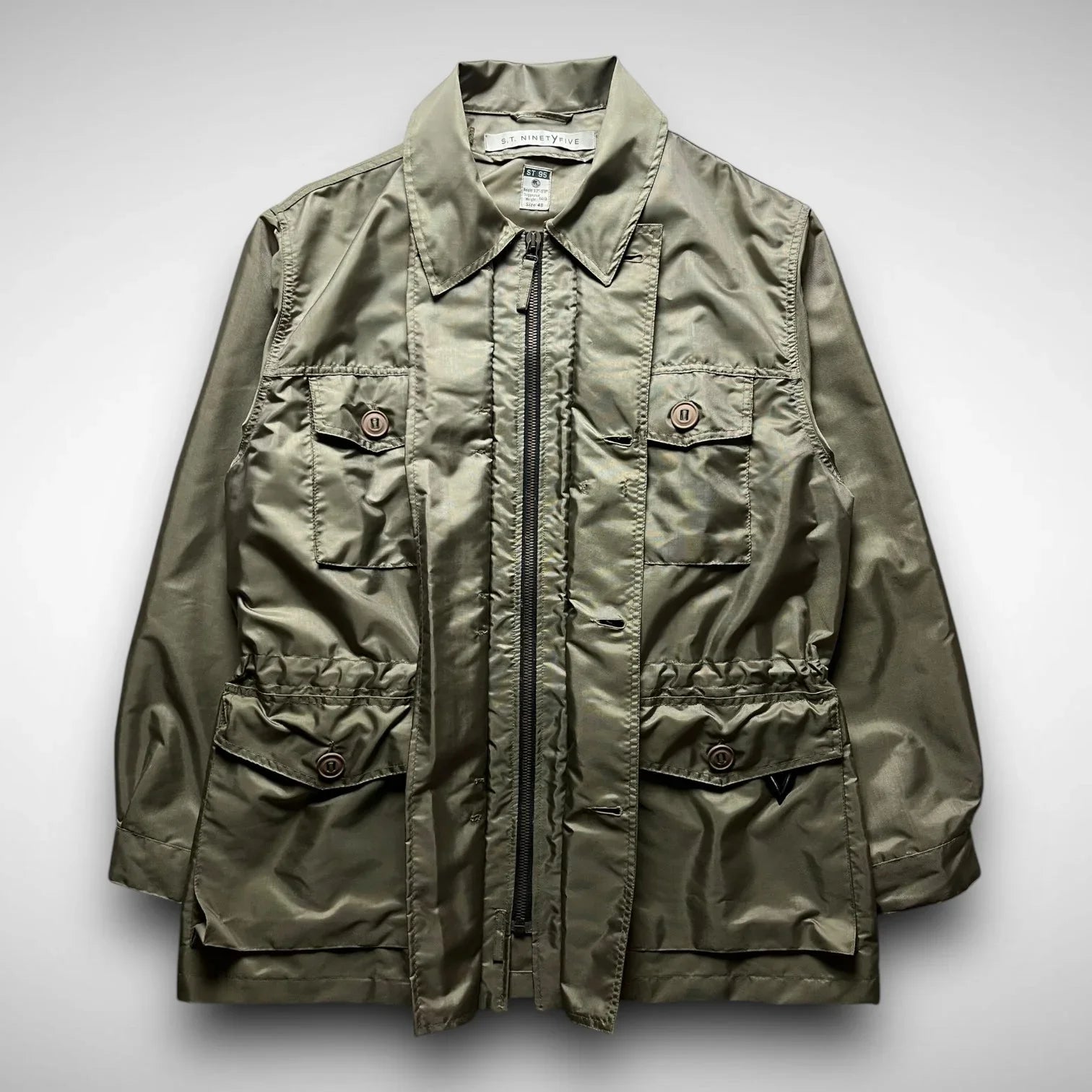 Rooted in military aesthetics and elevated by the innovative vision of Massimo Osti. Crafted from a lustrous olive/copper nylon, it features a boxy field-style silhouette with articulated panels and reinforced elbow patches. Four front flap pockets, a hidden zip closure beneath a buttoned placket, and an internal drawstring waist deliver both utility and structure. The subtle black ST95 triangle logo is tucked beneath the right lower pocket, adding understated branding for those familiar with the brand’s legacy.