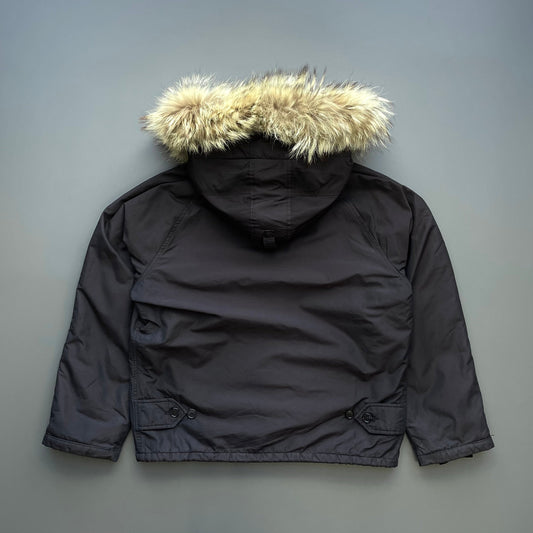 Fair condition, with lots of peeling and wear throughout which is common for these jackets.