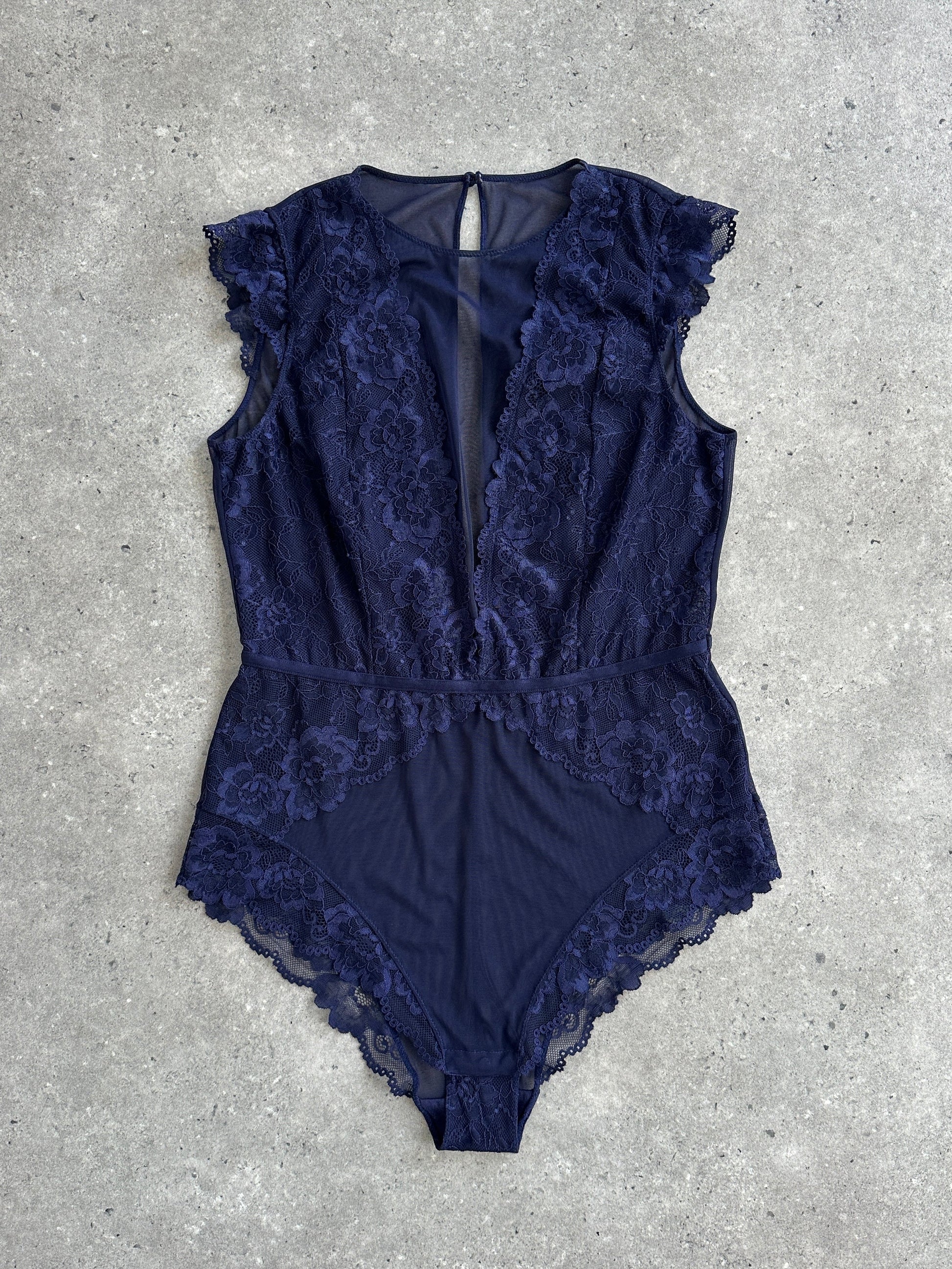 Sheer navy lace bodysuit with scalloped edging and a romantic deep-V silhouette — perfect styled as lingerie or layered beneath tailoring for evening edge