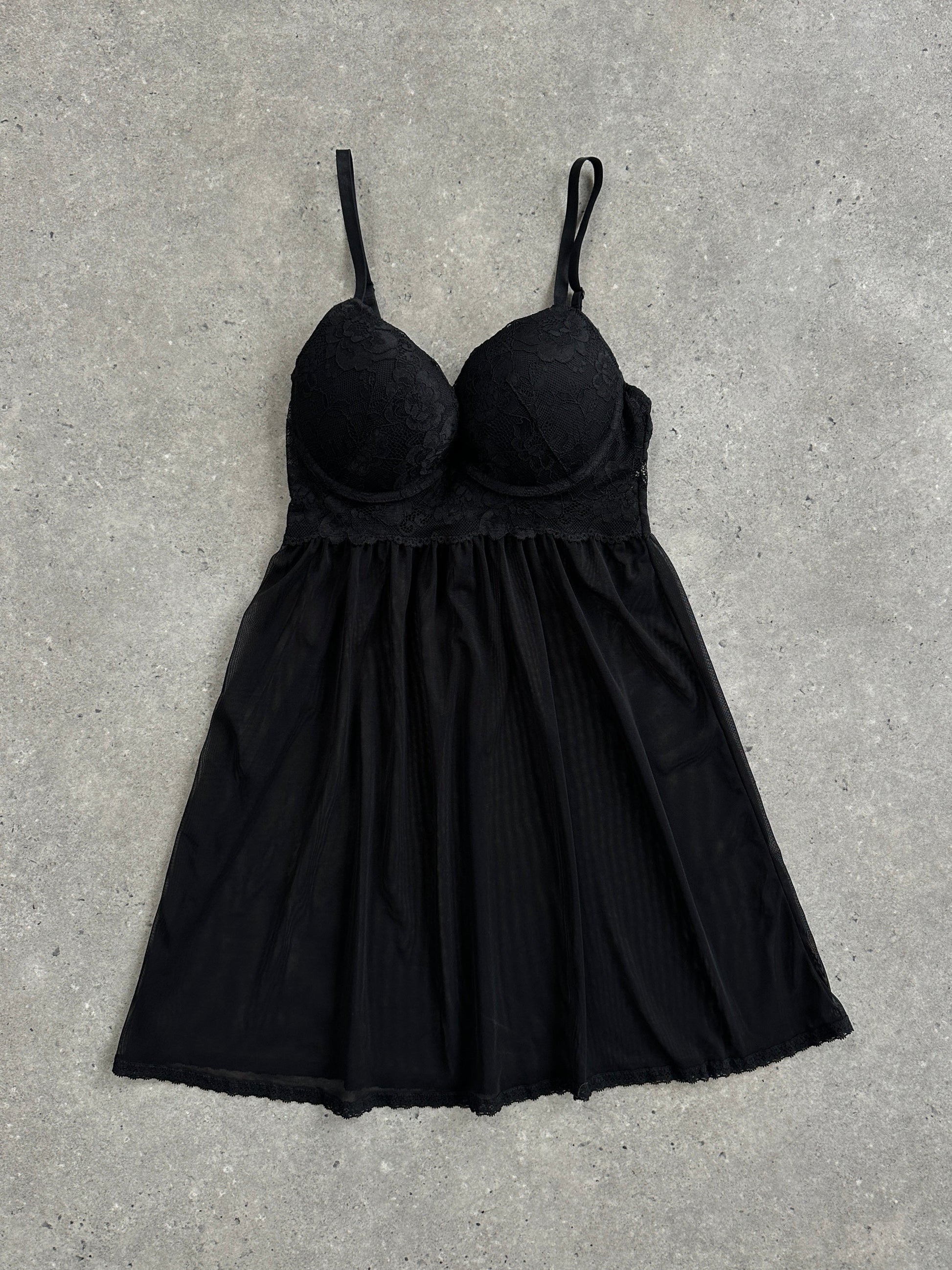 Vintage 2000s sheer black mesh camisole with lace-trimmed padded bust and adjustable straps.