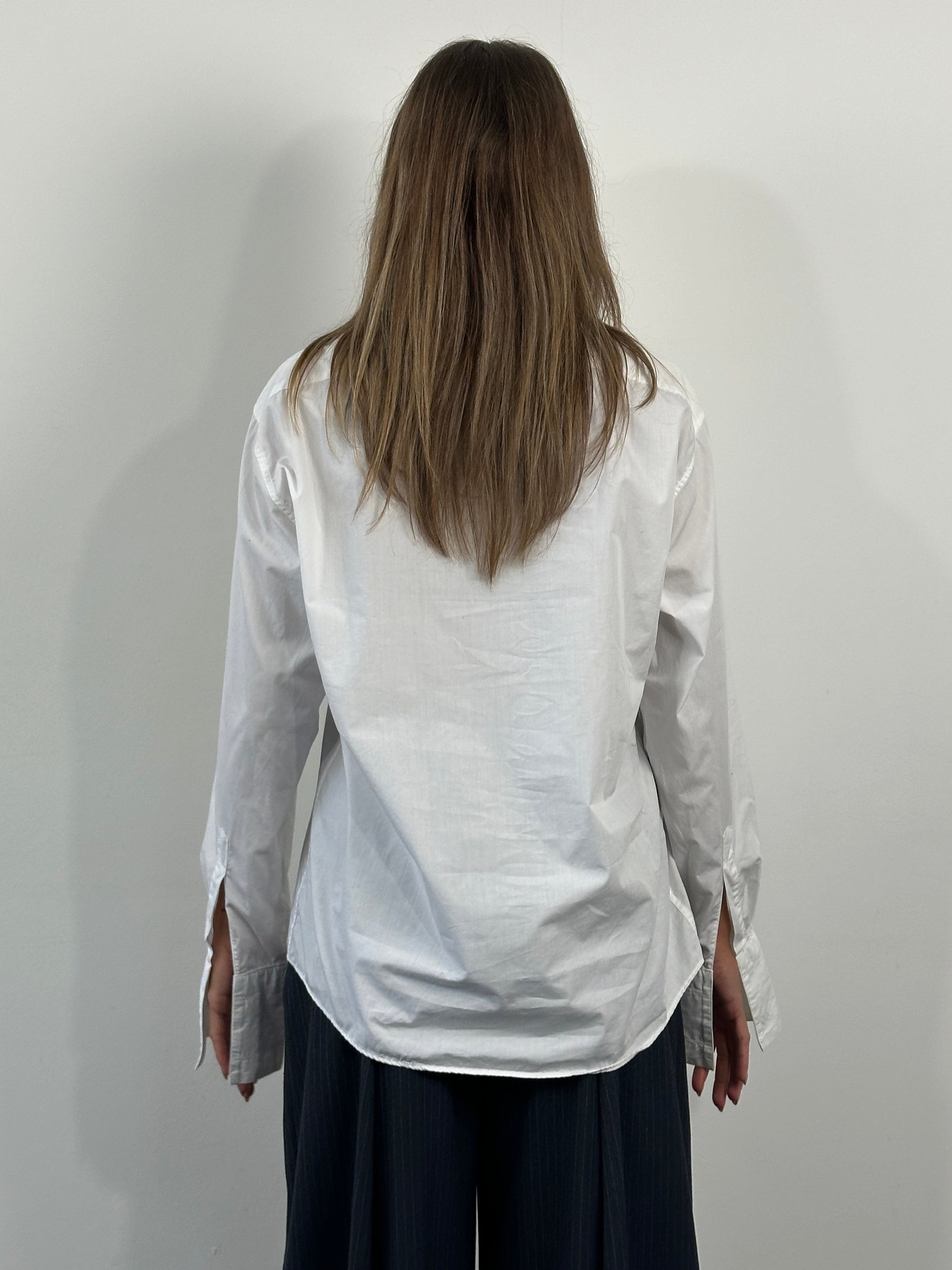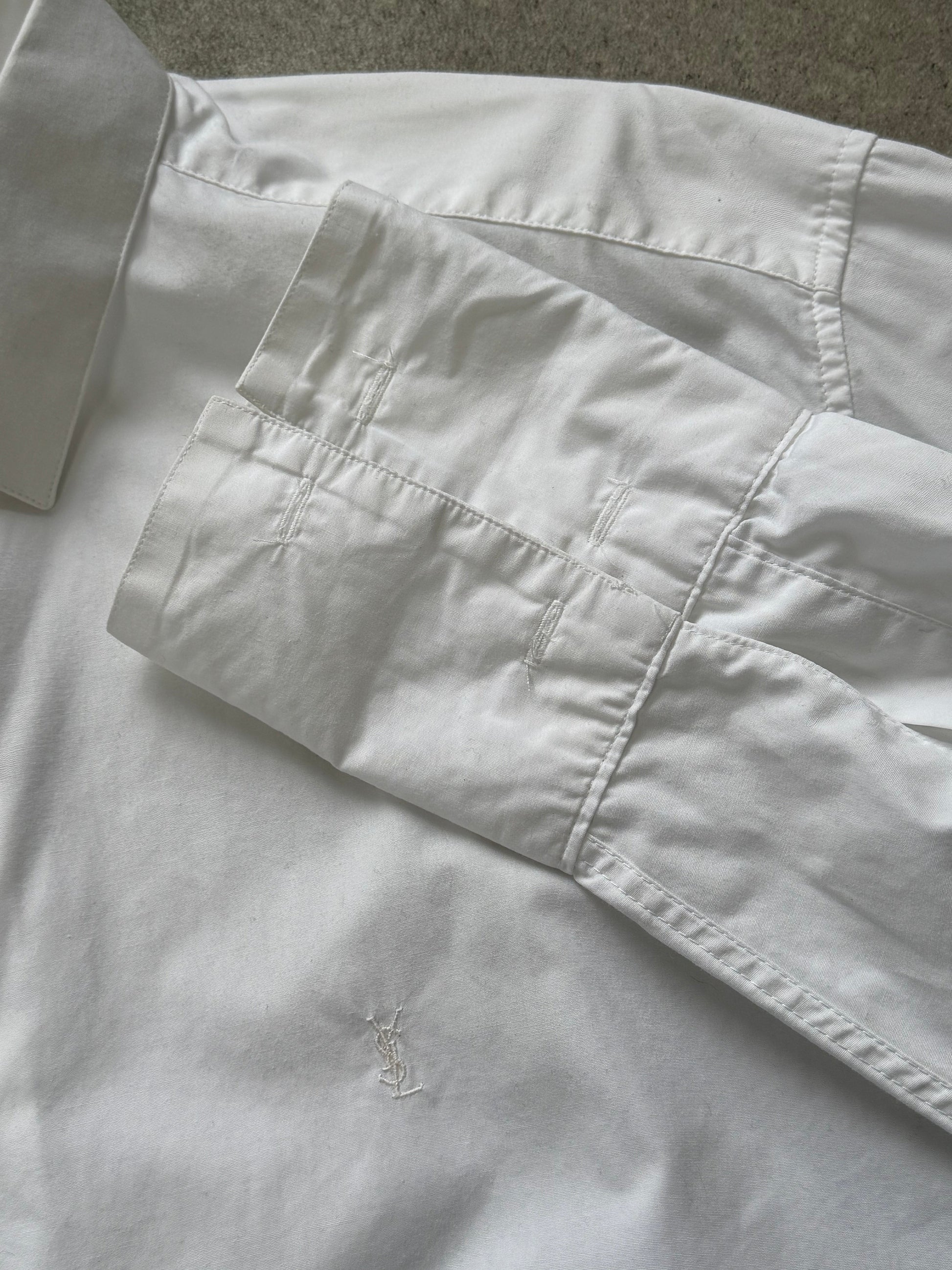 A vintage Yves Saint Laurent pour homme white cotton shirt featuring tonal chest embroidery and a clean classic silhouette. Designed with a sharp point collar, full button front and lightly structured drape in crisp shirting cotton.