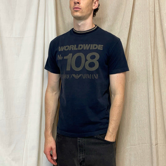 Emporio Armani Navy 1990s Reflective Print 'Worldwide' Tee