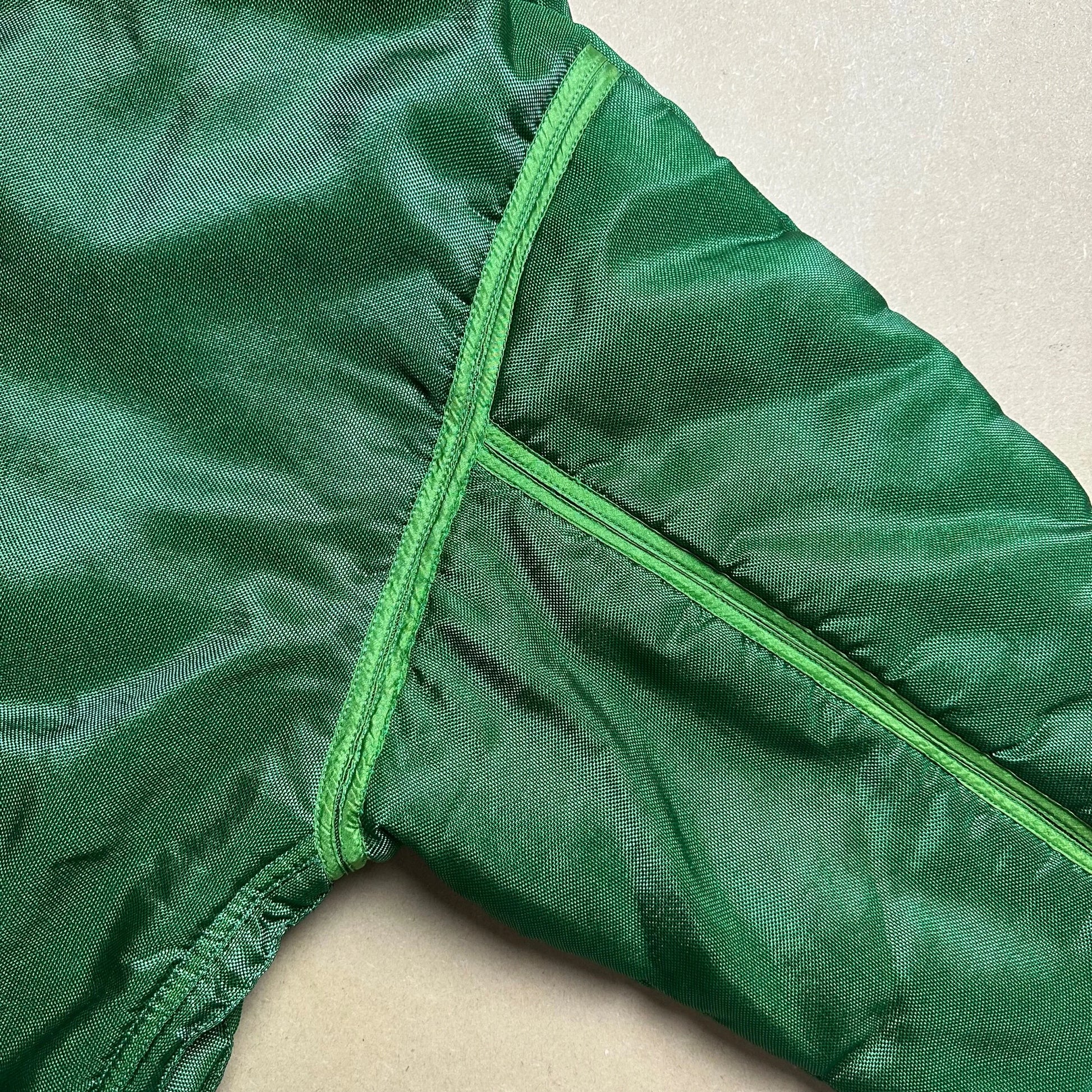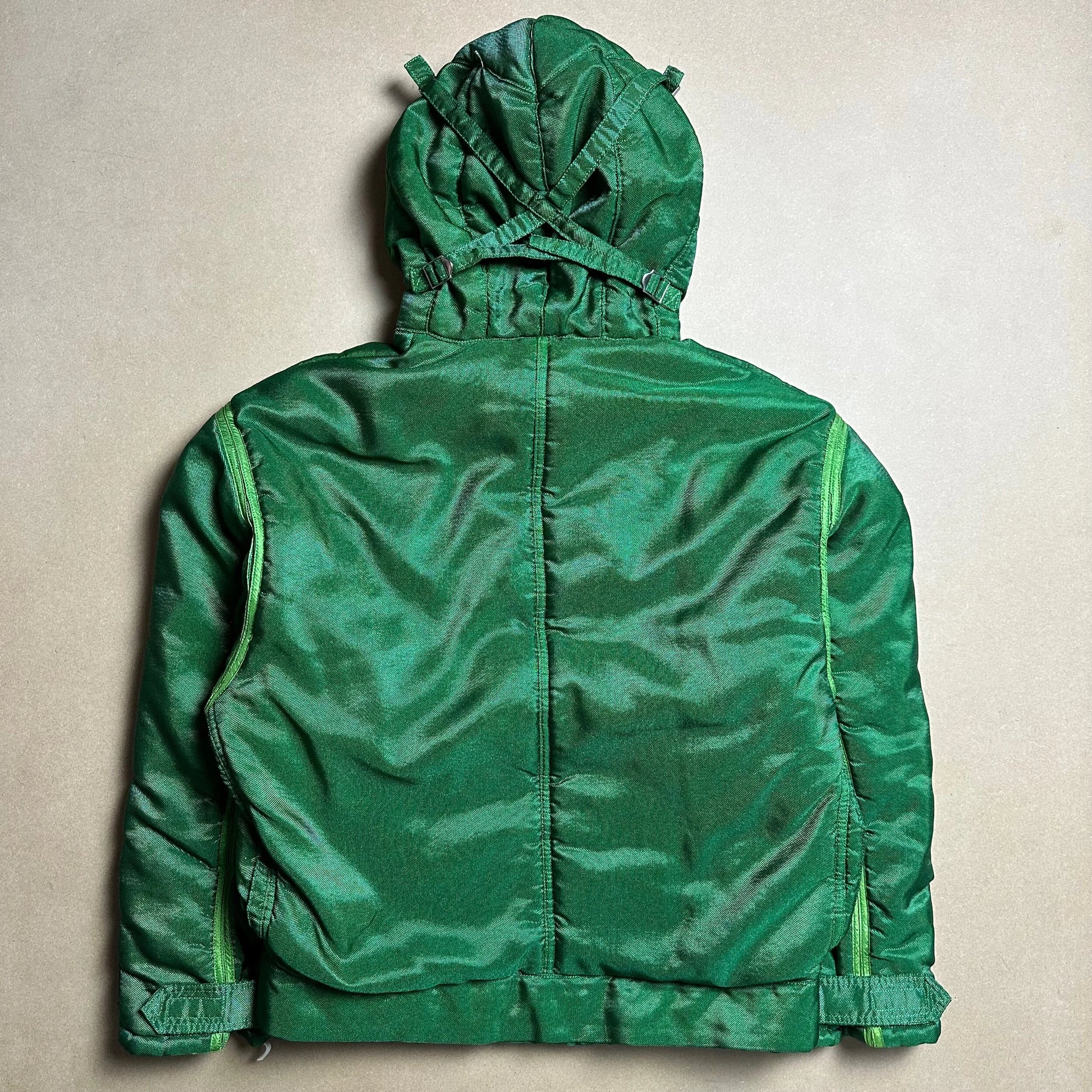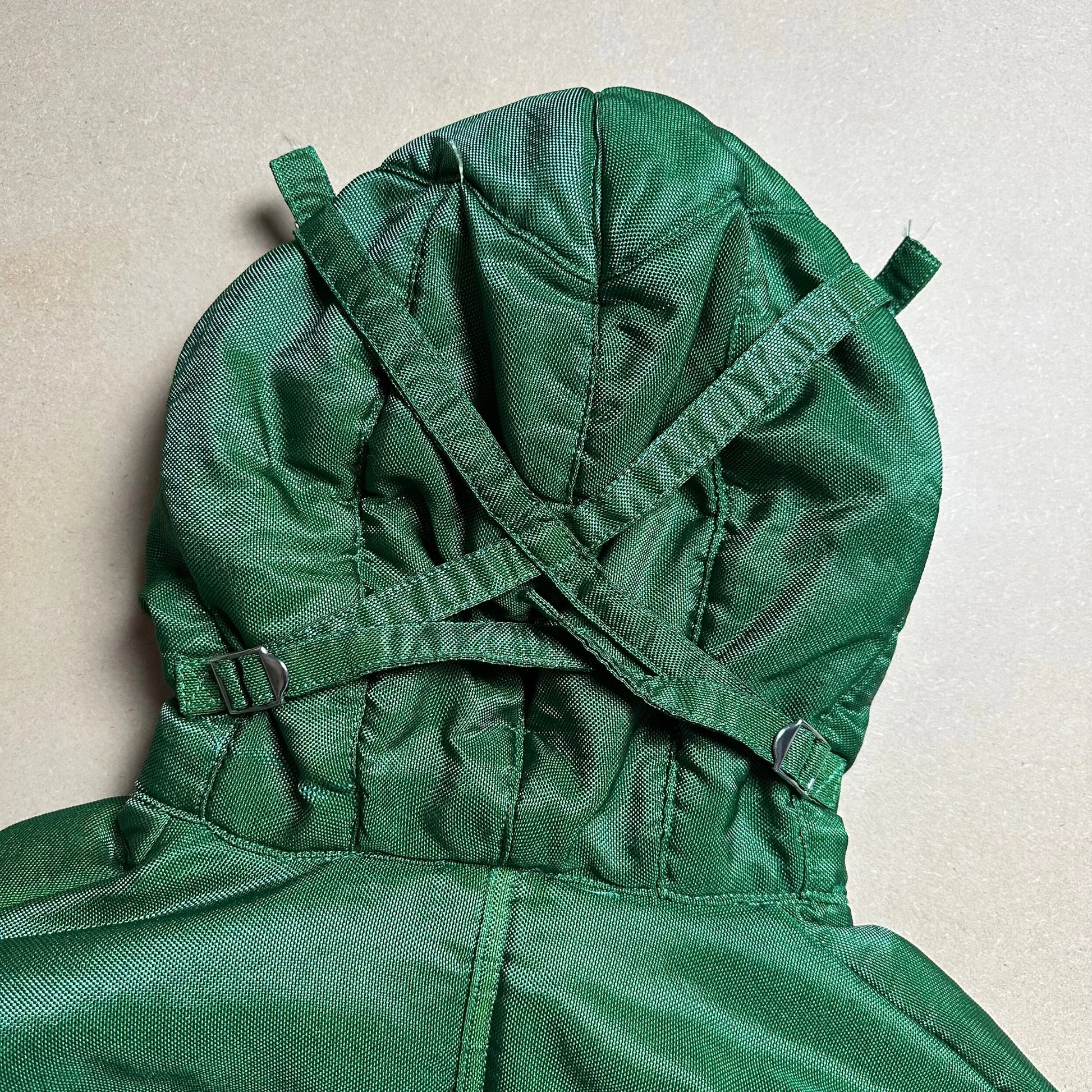 Designed by Massimo Osti. Highly rare sample colour way of another very elusive fabric, and a rarely sited piece. Emerald Green Rex nylon flight jacket with a removable coyote fur trim hood. Double layer silk hood and lining. Rubber compass logo hood toggles. Compass embossed buttons and large Lampo zip fastening. Adjustable cuffs. Slip clasp hood fastening to finish the detailing.