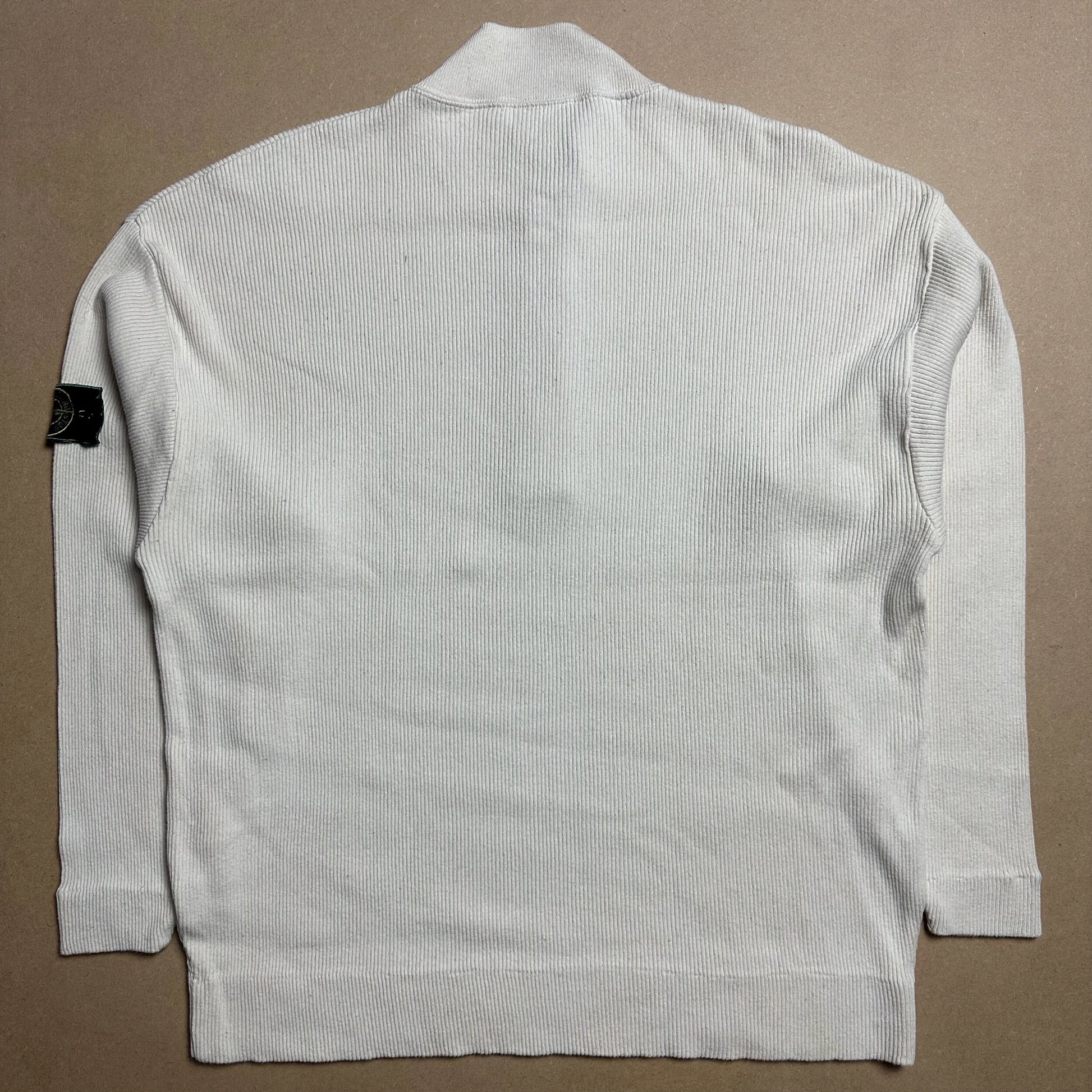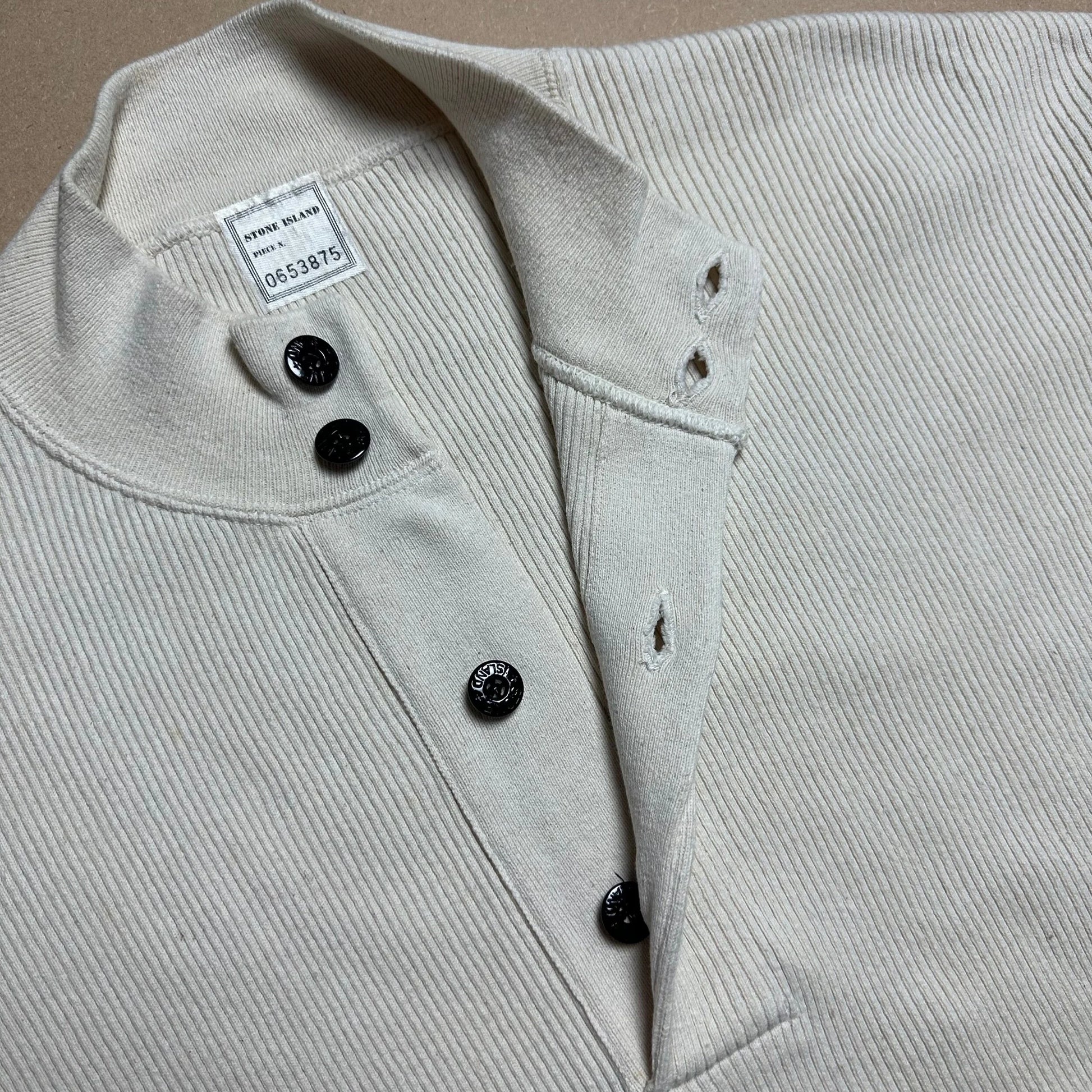 Designed by Massimo Osti. Ribbed cotton 5 button down sweater. Tapered cuffs and hem. Pearl white colour way.