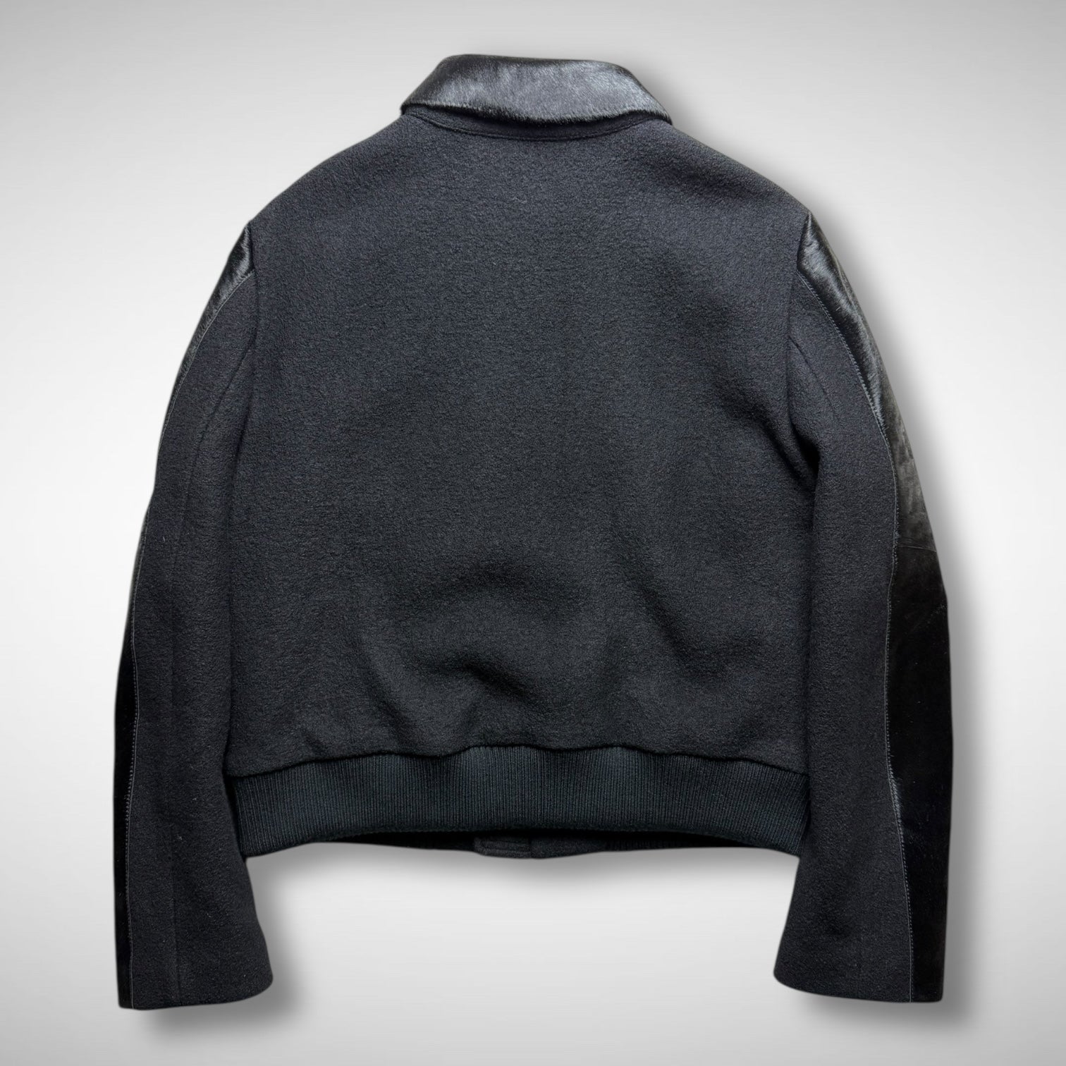 Structured bomber jacket in rich wool with bovine leather (cowhide) panels at sleeves and collar. Understated luxury, with minimalist detailing and tonal ribbed hems for a refined, tactile finish. Made in Italy.