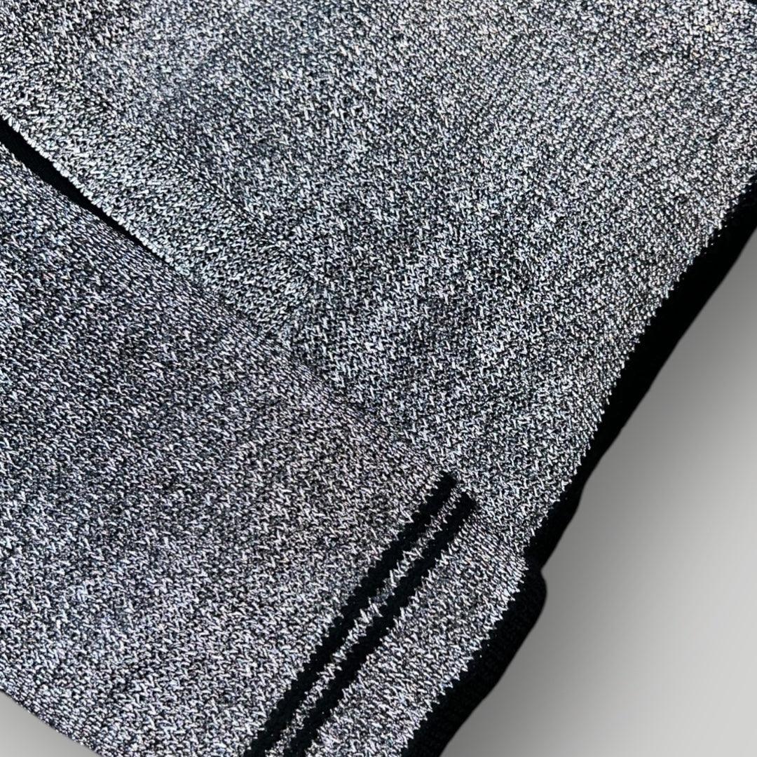 The President's Knit 5715 was created in Reflective yarn, made up of micro plates coated with glass microspheres trapped inside a polyester mesh. The structure of the jumper has been made double, reflective on the outside and wool on the inside. The outer face has then been printed in a darker shade using heat and pressure sublimation printing to amalgamate the fibres, obtain an even surface and reduce the strong reflective appearance.