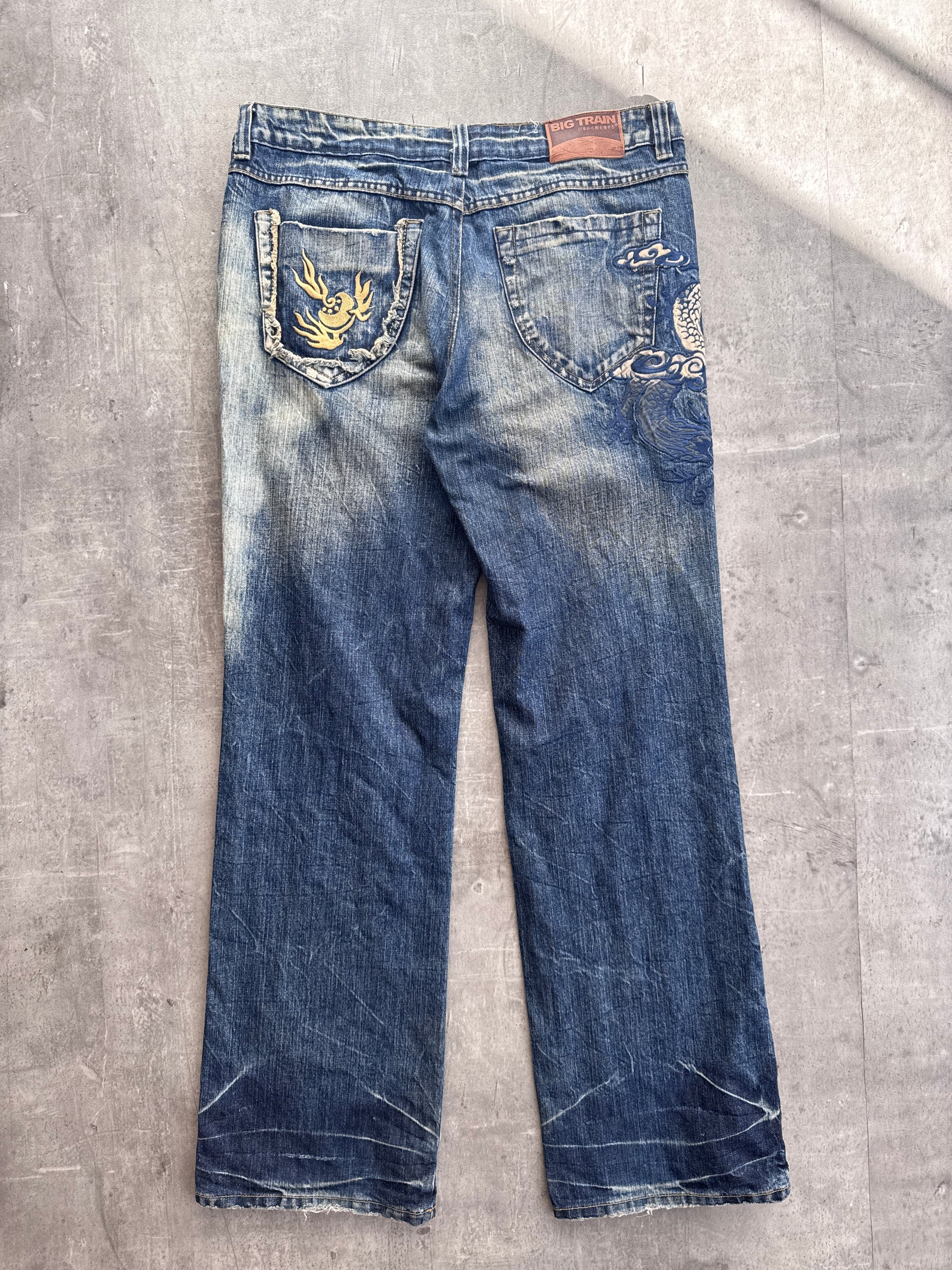 A bold pair of Big Train jeans, featuring intricate embroidered dragon and phoenix motifs that showcase the brand’s signature blend of Japanese streetwear style and traditional symbolism. Cut from medium-weight denim in a distressed acid wash finish, these jeans combine rugged wear with striking back pocket and leg detailing.