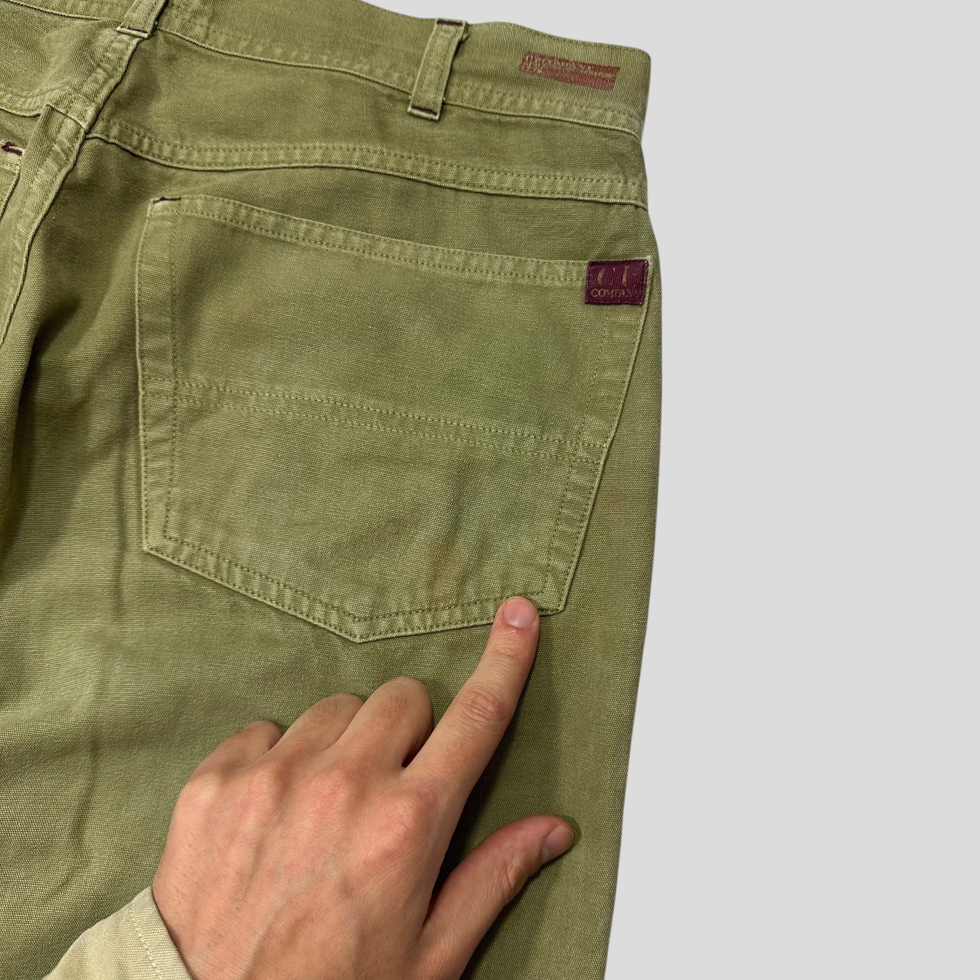 Extremely rare spring summer 1992 CP company Ideas From Massimo Osti line washed green cotton trousers, unique pair with the dated red logo seen only in this season at the belt line and a CP Company logo on the back pocket, clasp closure fly, gorgeous pastel green washed cotton.