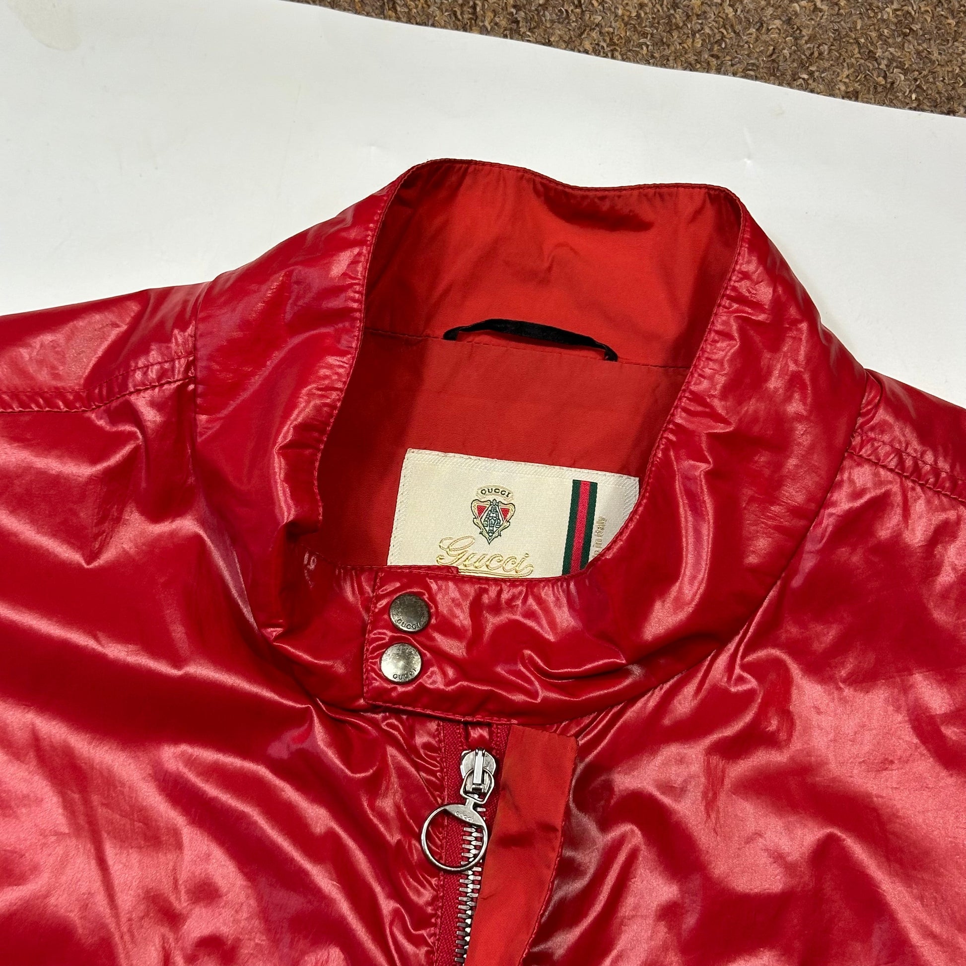 Very rare Gucci 2009 Candy Red nylon polyamide prismatic gloss look silk like jacket, similar to Stone Island Mussola Prismatica material that shimmers and changes shade in natural light.