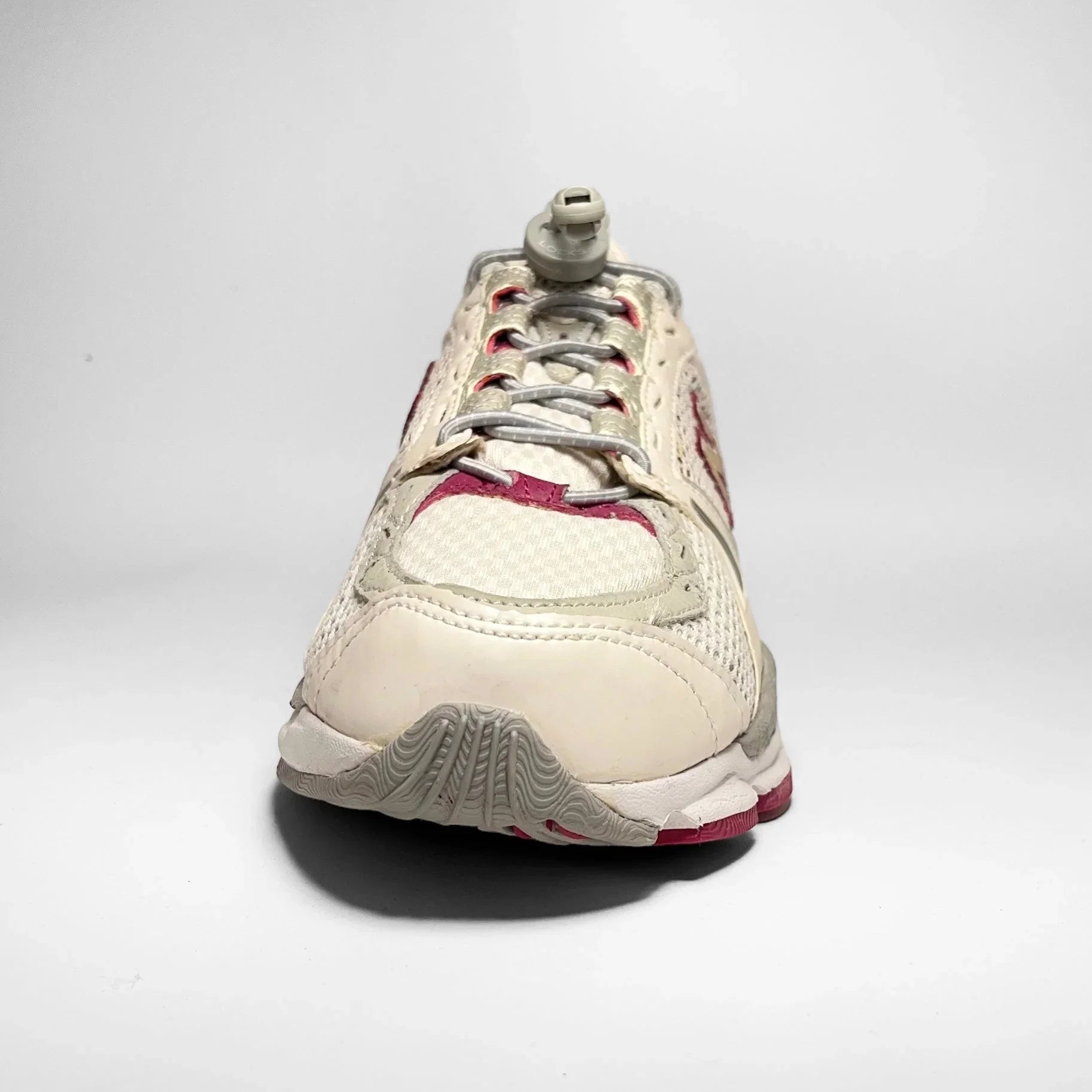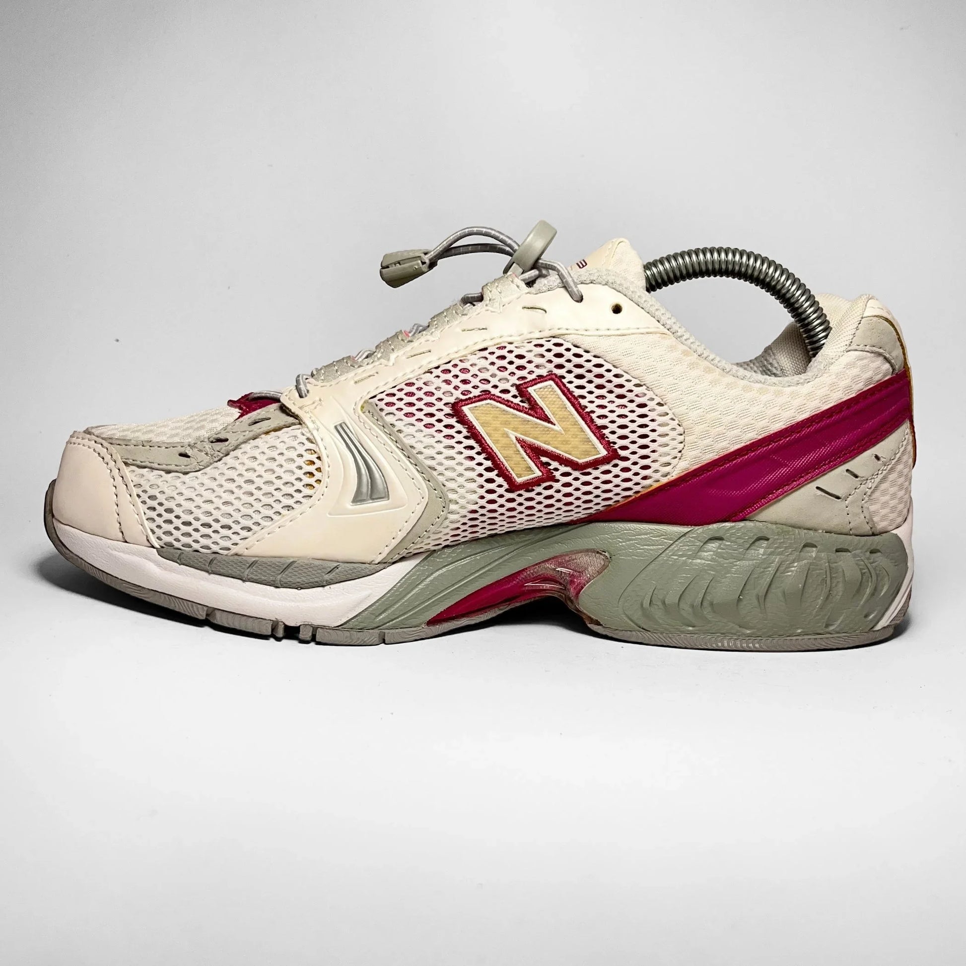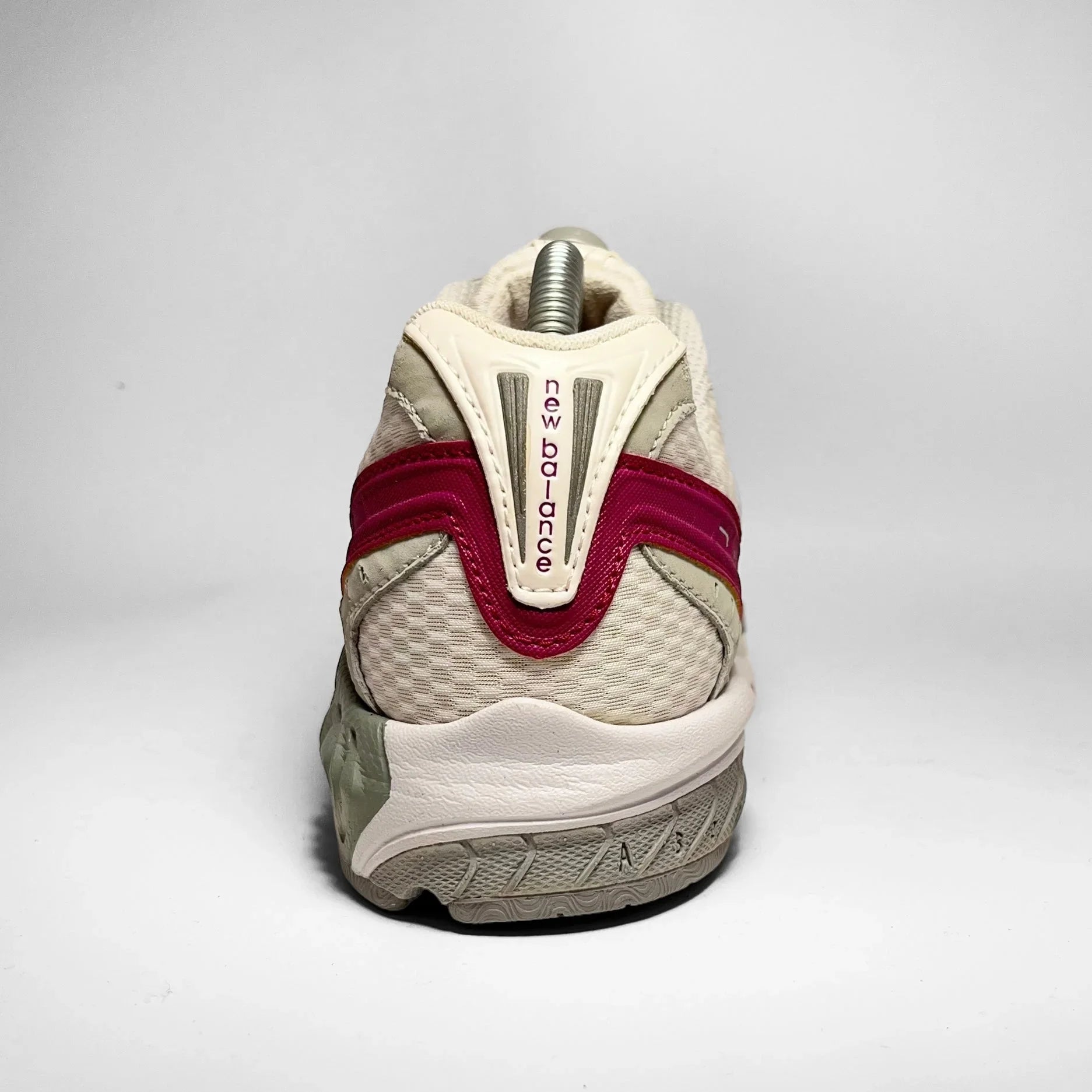White creamish leather panels with silver lining details, white mesh underlay and a purplish see-through mesh matching the outlined ‘N’ logo, rear rubber panel, mid- and outsole.