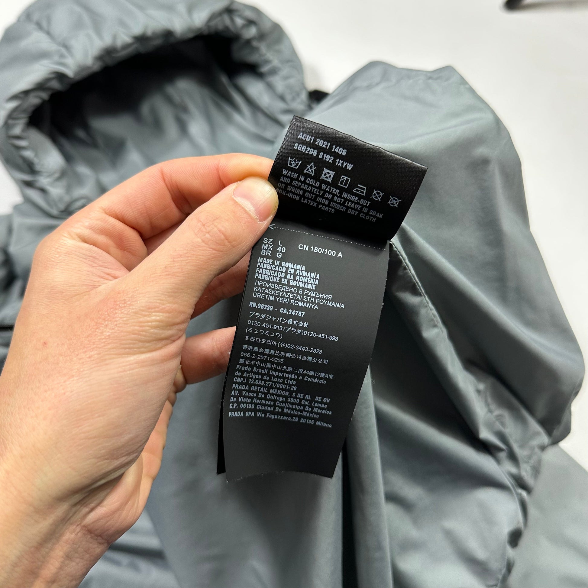 Very rare 2021 aluminium grey Prada Linea Rossa nylon puffer jacket with graphene infused polyester padding, latex logo to chest, adjustable cinch cords at hood and hem, elasticated cuffs.
