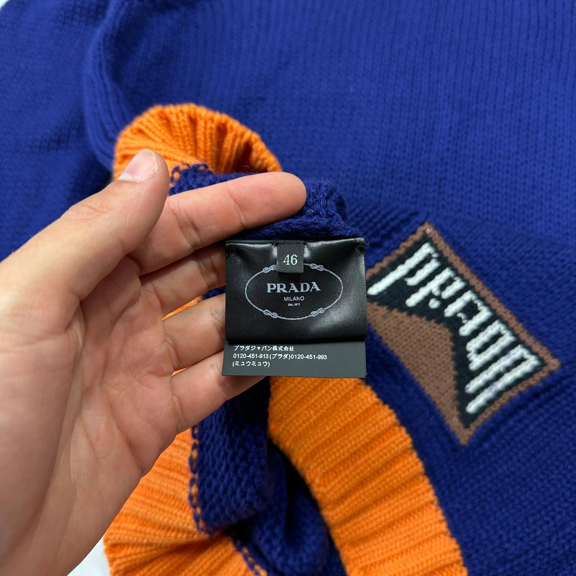 Extremely rare Prada Milano mainline cashmere intarsia blue and orange detailed braided knit sweater, lovely high quality piece made in Italy, Prada race logo on the lower right.