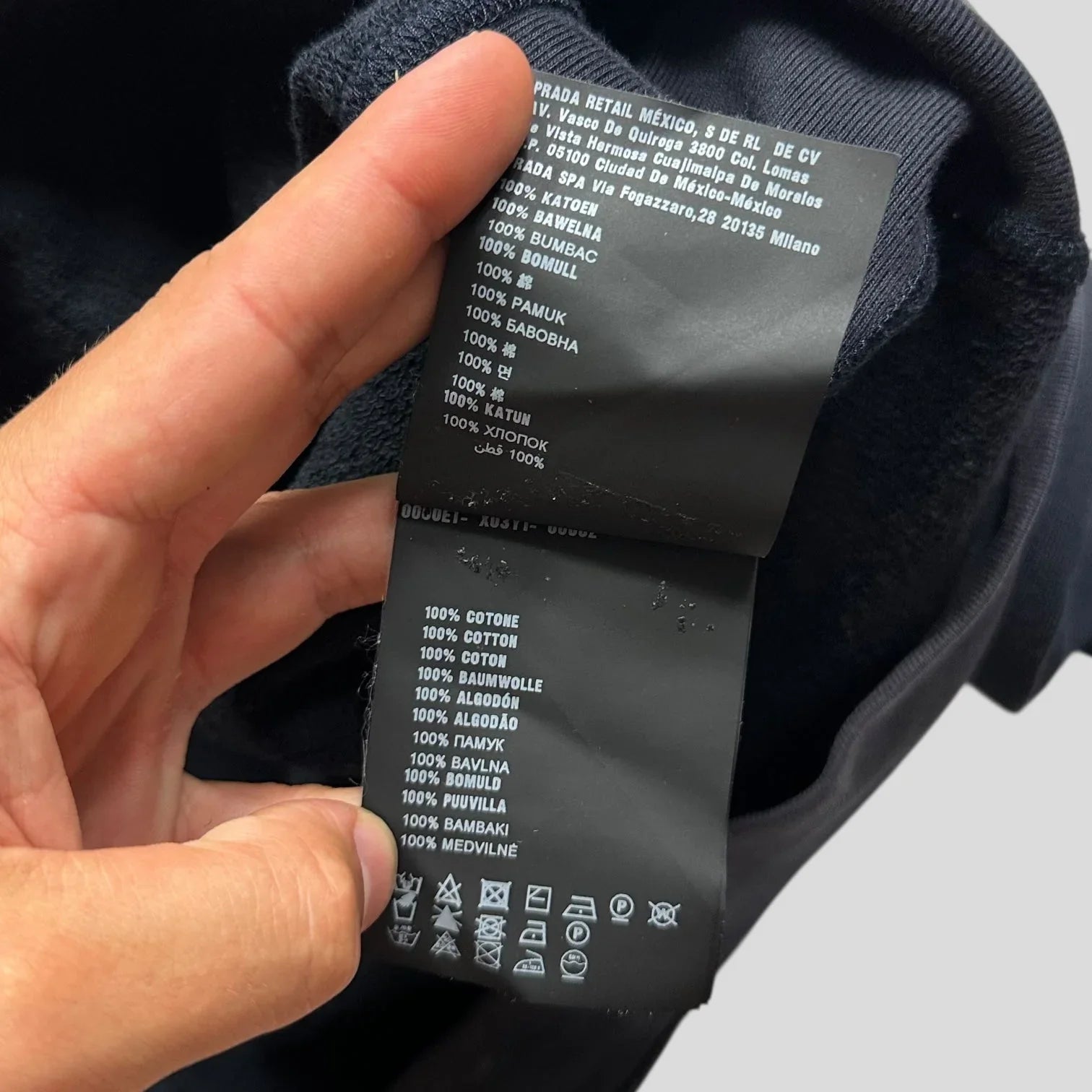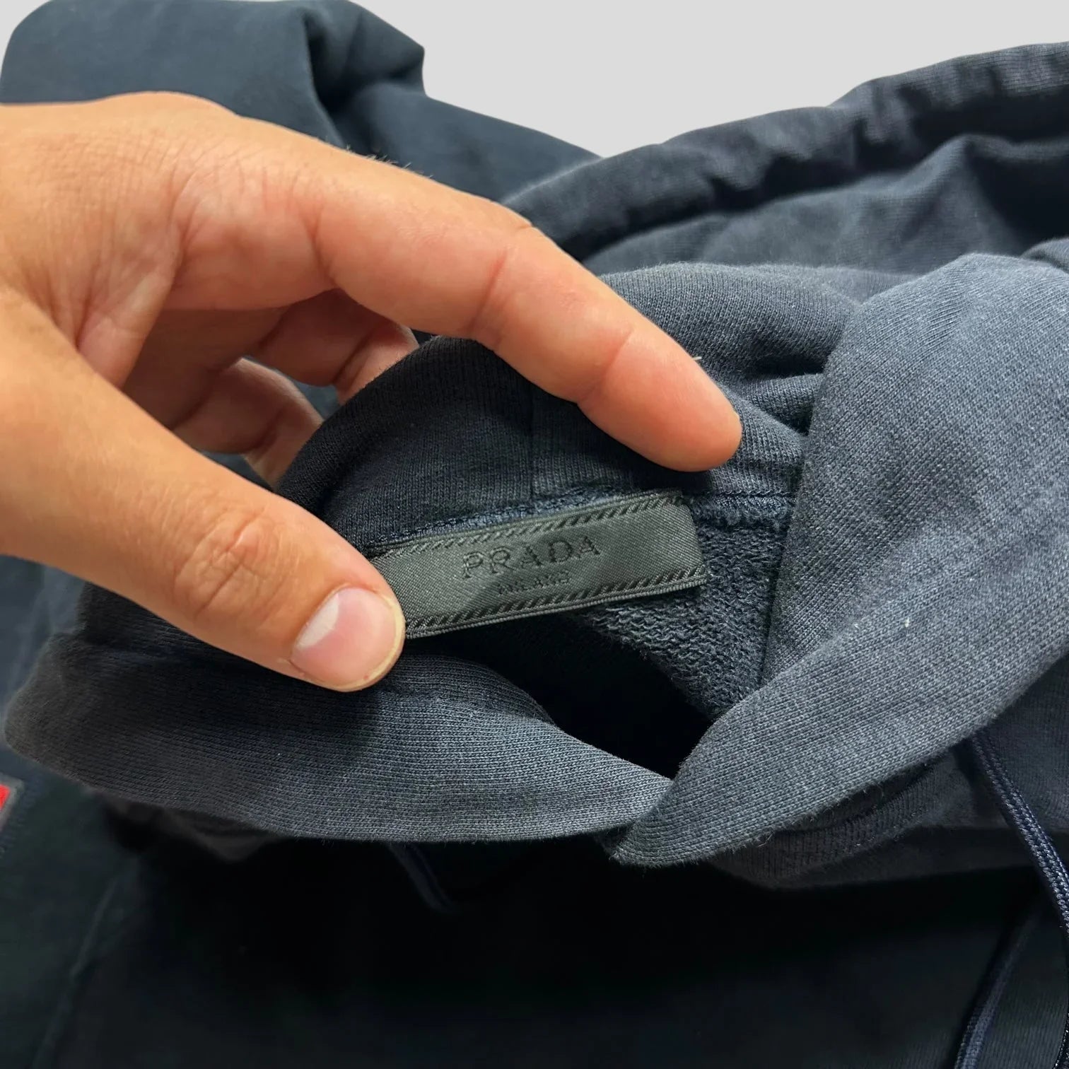 Prada Milano 2018 Red Tab Cotton Pullover Hoodie, navy blue colourway with red prada tab to hip, drawstrings at hood to adjust fit, hand pockets at front, lovely quality with very high retail price.