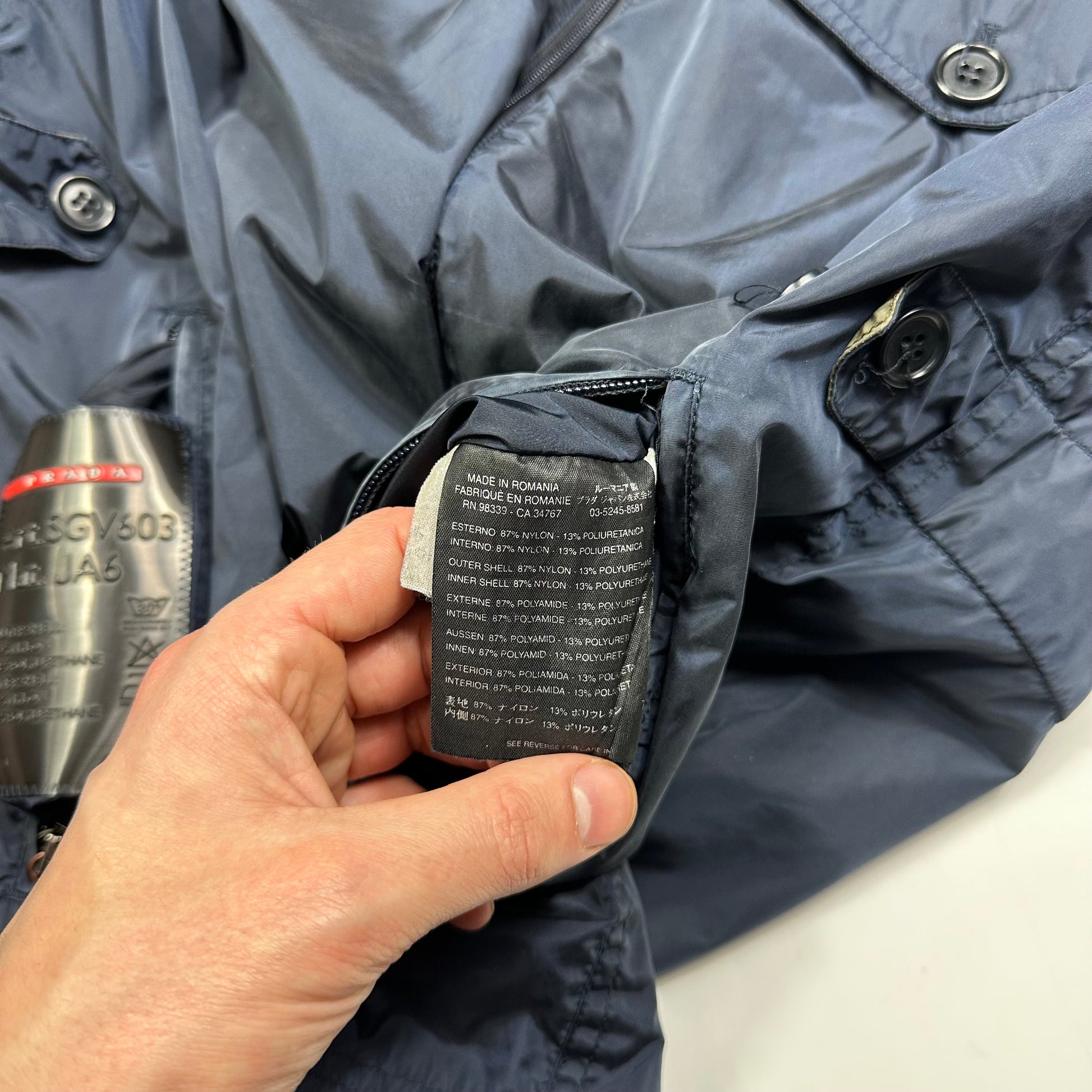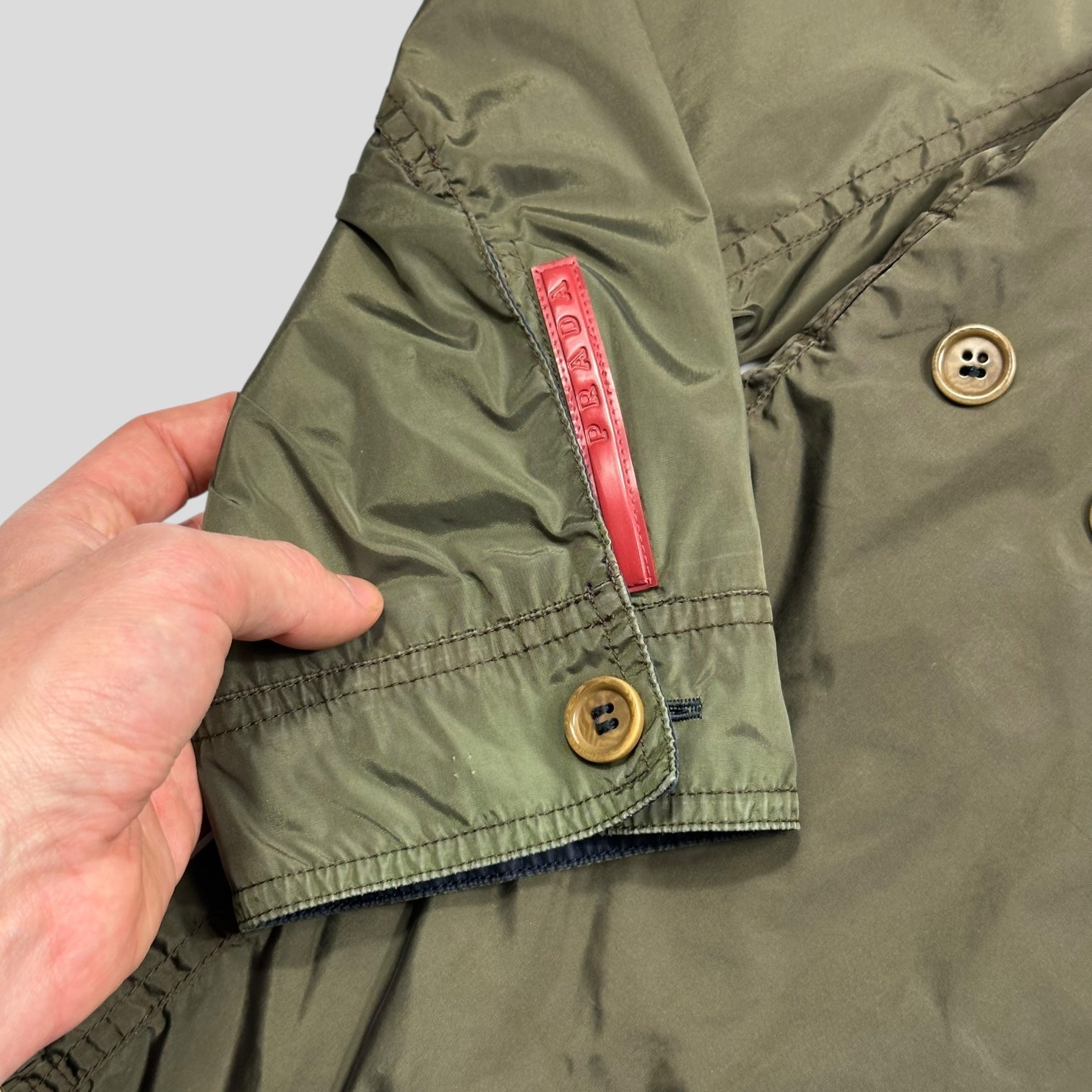Rare early 2000’s Nylon shimmer blue and green reversible hunting jacket, unique metal embossed Prada zip pulls on the blue side, D-ring and chest zip pockets on the green side, Prada red logo tab to cuff on both sides.