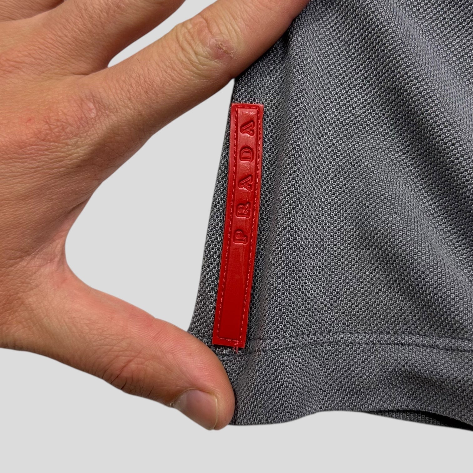 Rare Prada Sport grey polo, unique embroidered striping across the chest, you never see these for sale, red logo tab to hip.