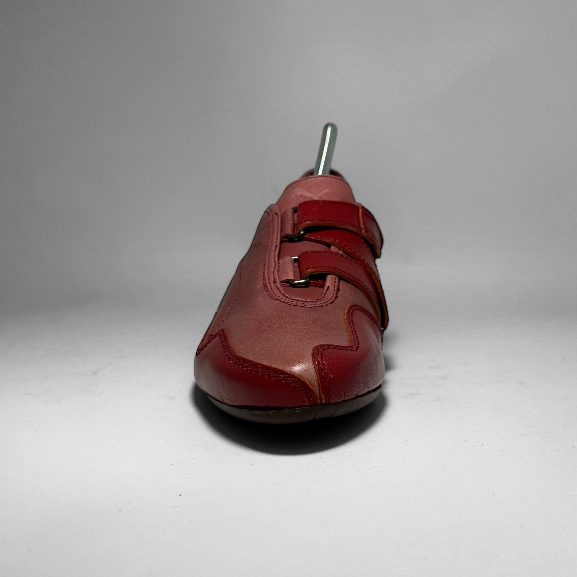 Low-profile wedged-Mostro featuring a concealed double-strap closure and angular paneling. Made in Italy with a mix of smooth and patent leather in tonal reds/pink hues. Finished with a wood-textured outsole and rubber grip pads.