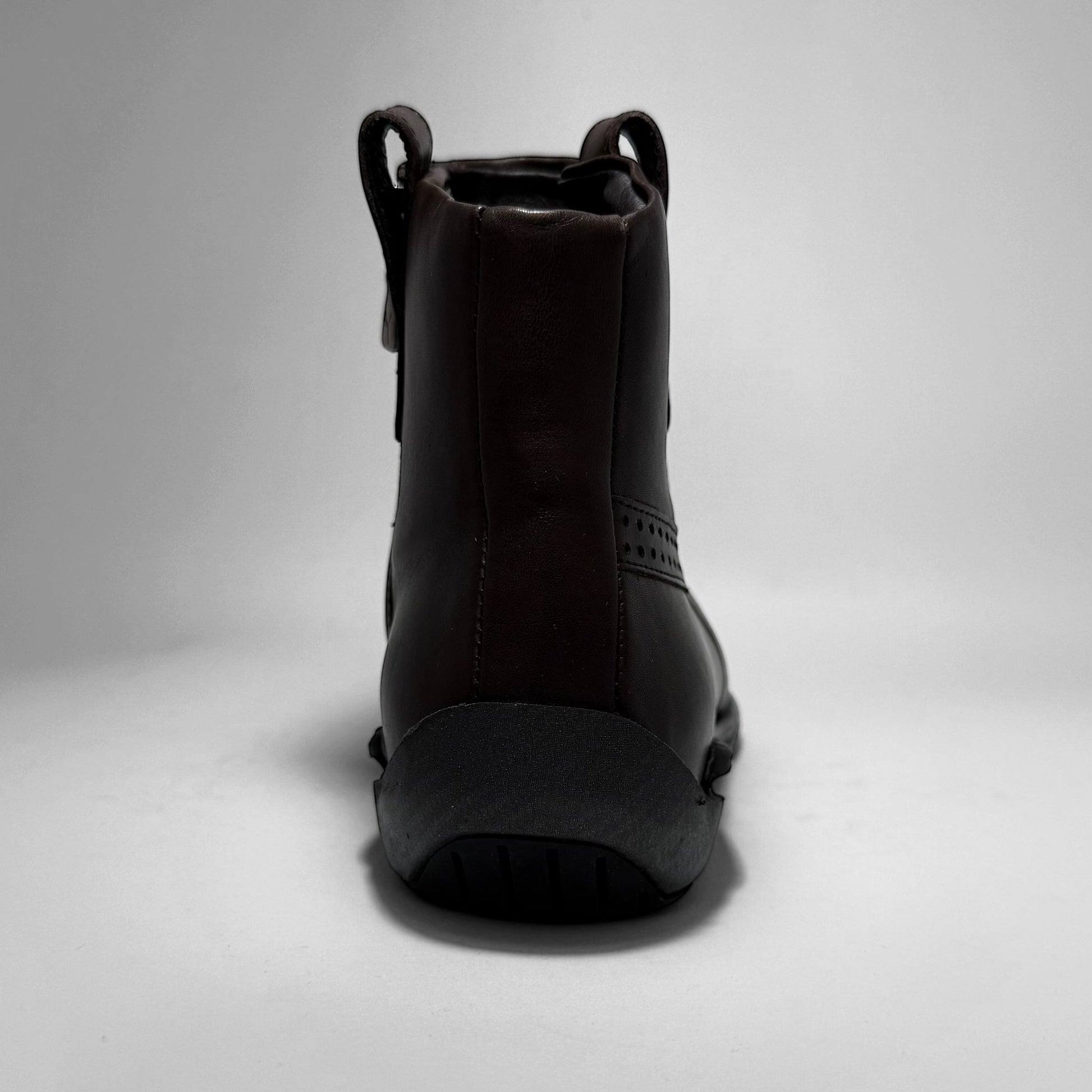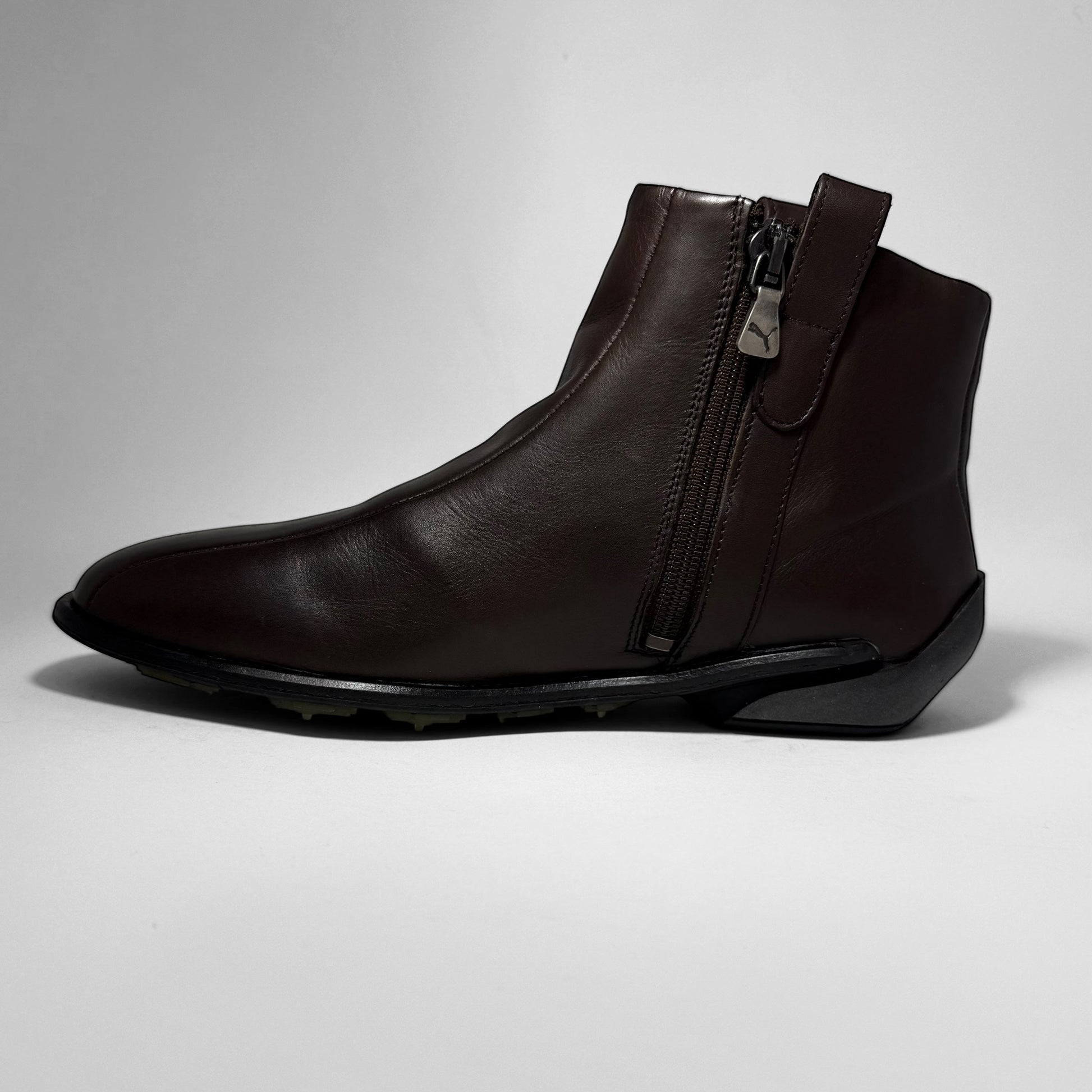 A sleek driving boot from the Puma 96 Hours line, the ‘Stecca’ features a full dark brown leather upper with brogue-inspired perforated Formstrip, medial zip closure, and a tab with embossed Puma logo. Finished with a sculpted heel wedge and textured outsole designed for grip and comfort.
