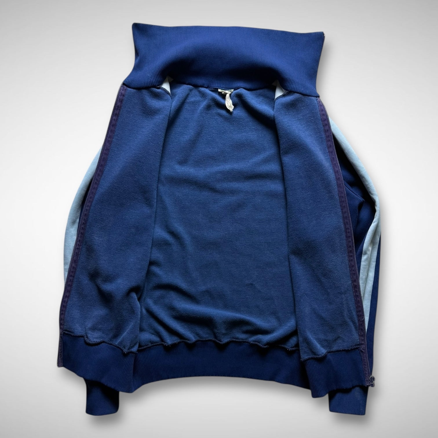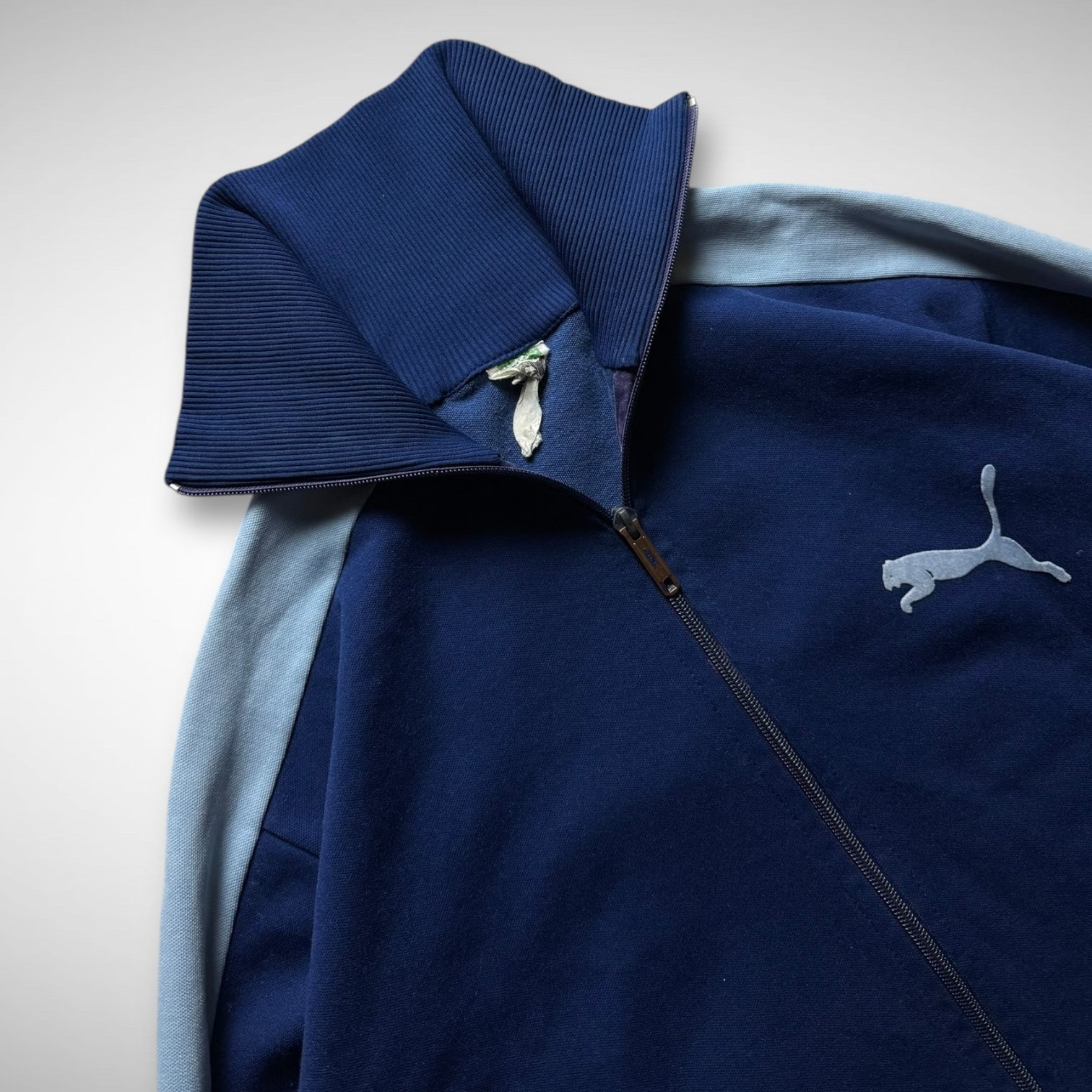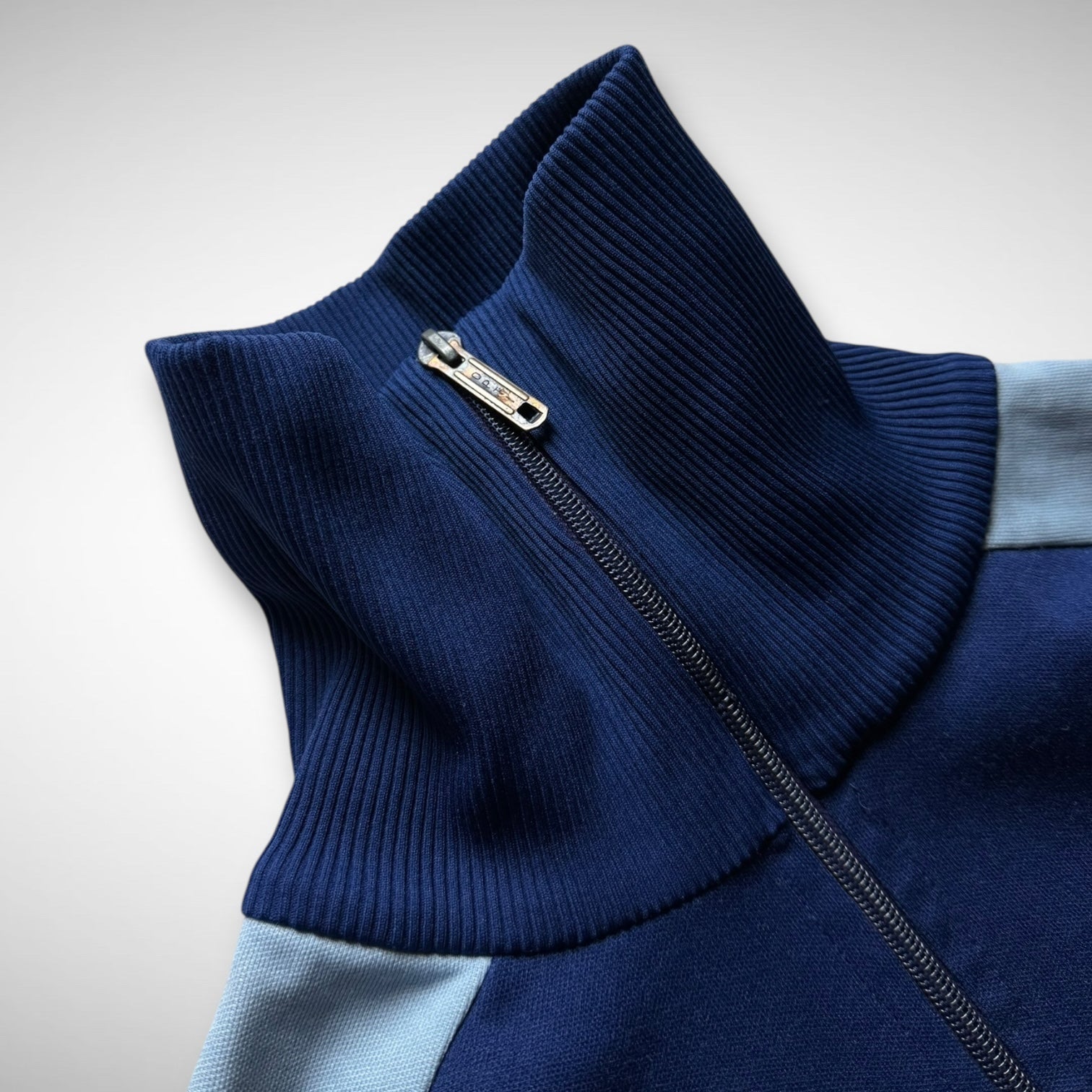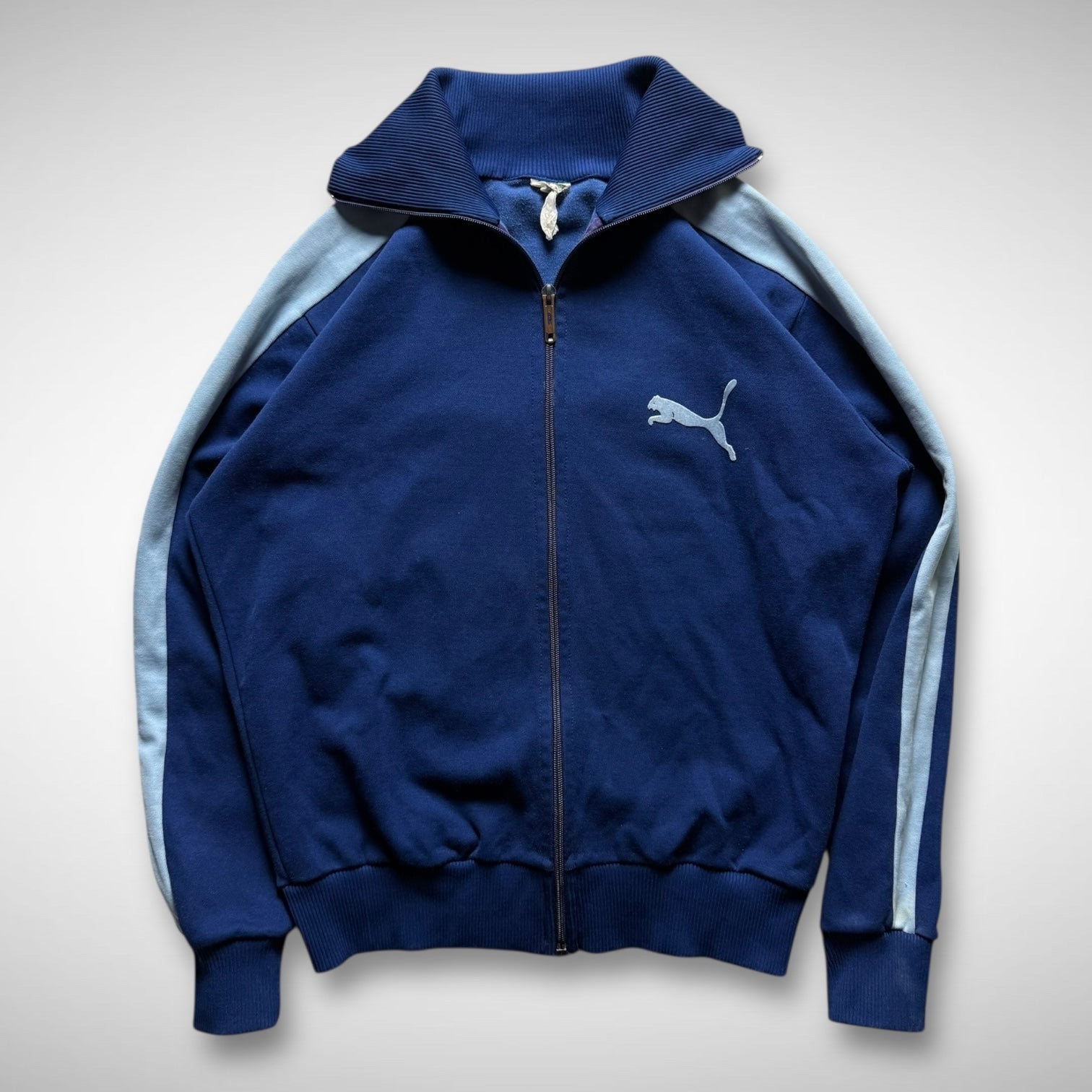 Classic trackjacket in navy with printed old Puma logo on the chest, Opti zip, high-collar, and contrast panelled stripe along the arms. Made in West-Germany.