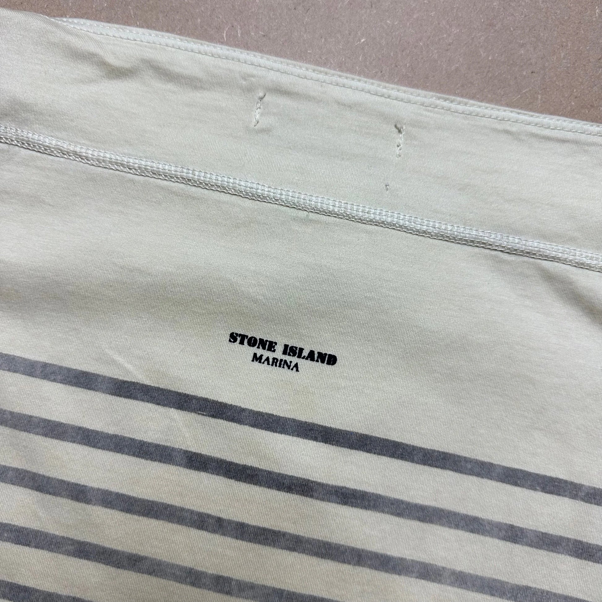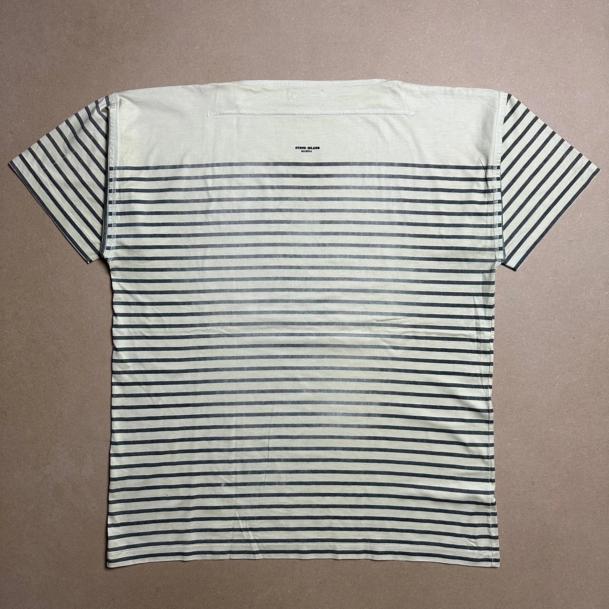 Designed by Massimo Osti. Heat reactive striped T-shirt. Boat neck design. Nautical striping with iconic ICE JACKET spell out. Rear back of neck Marina stencil spell out.