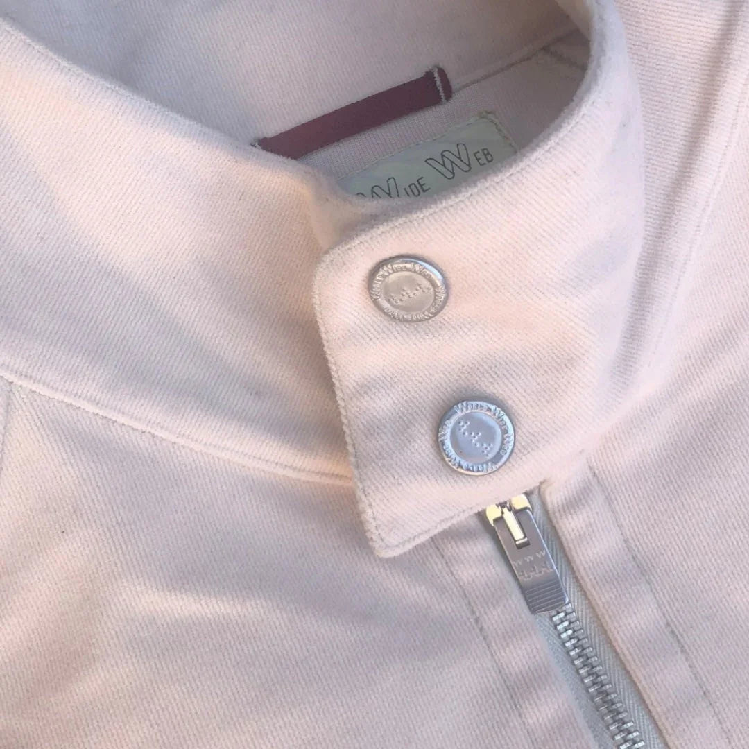 Beige lightweight jacket with stand-up collar closed by two studs. Spell-out logo printed to rear of the collar.