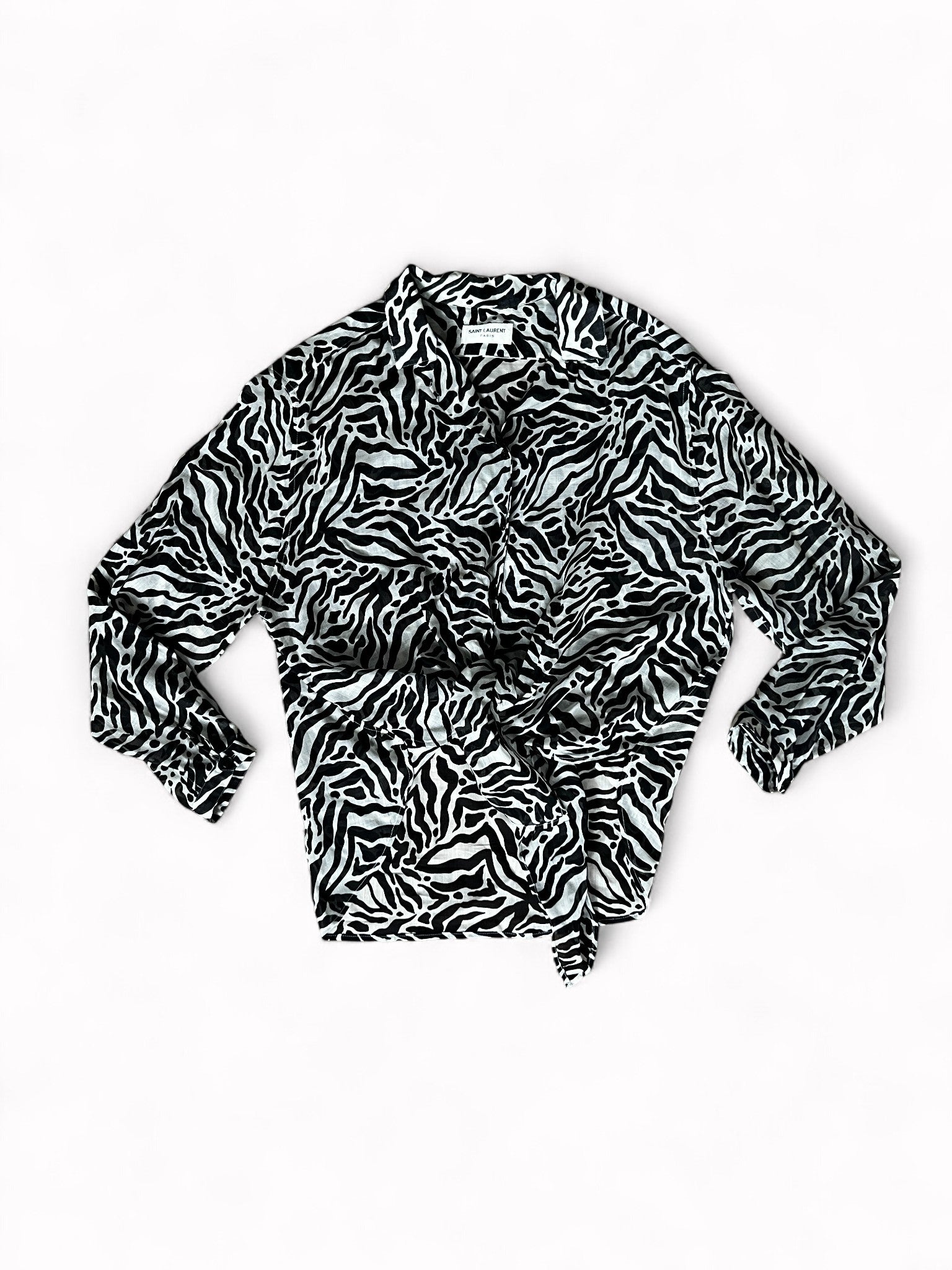 Spring Summer 2020 Saint Laurent Zebra Print Sheer Wool Shirt. A beautiful work of art with a tie bottom make it customizable. Made from 100% wool, but let's the light through. A true bit of beautiful craft.