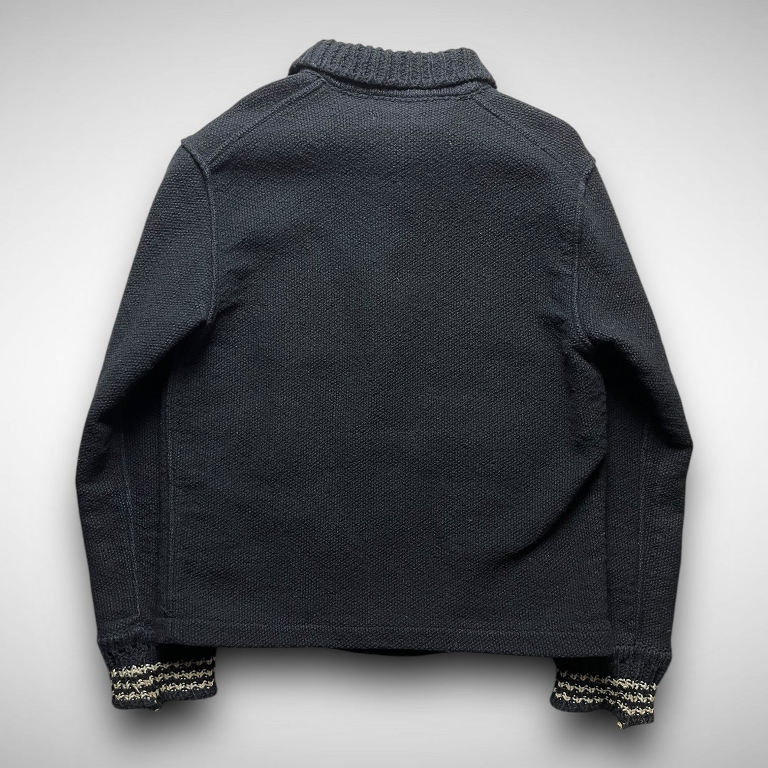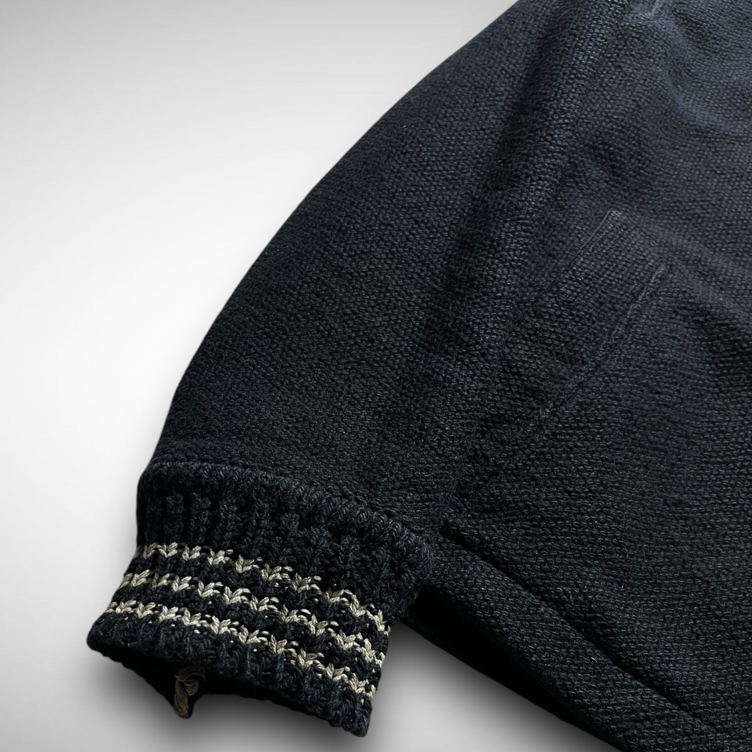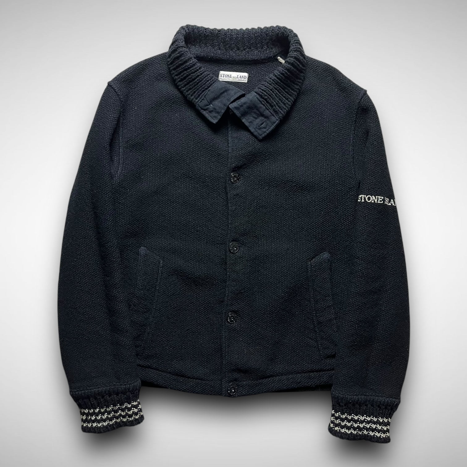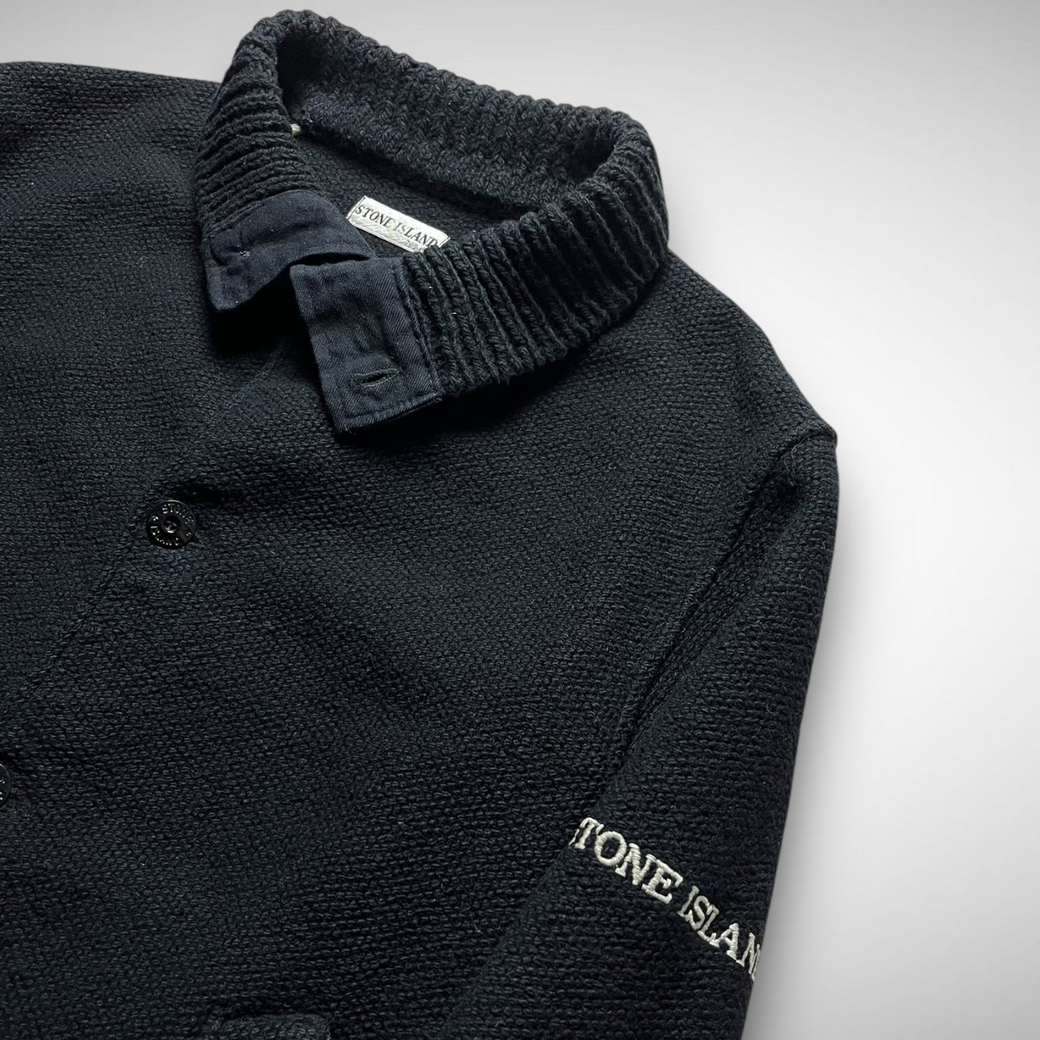 Heavyweight knitted wool jacket in dark navy/black with a ribbed shawl collar, tonal button closure, and front welt pockets. Features contrast striped knit cuffs and embroidered Stone Island logo on the sleeve for a subtle, refined finish.