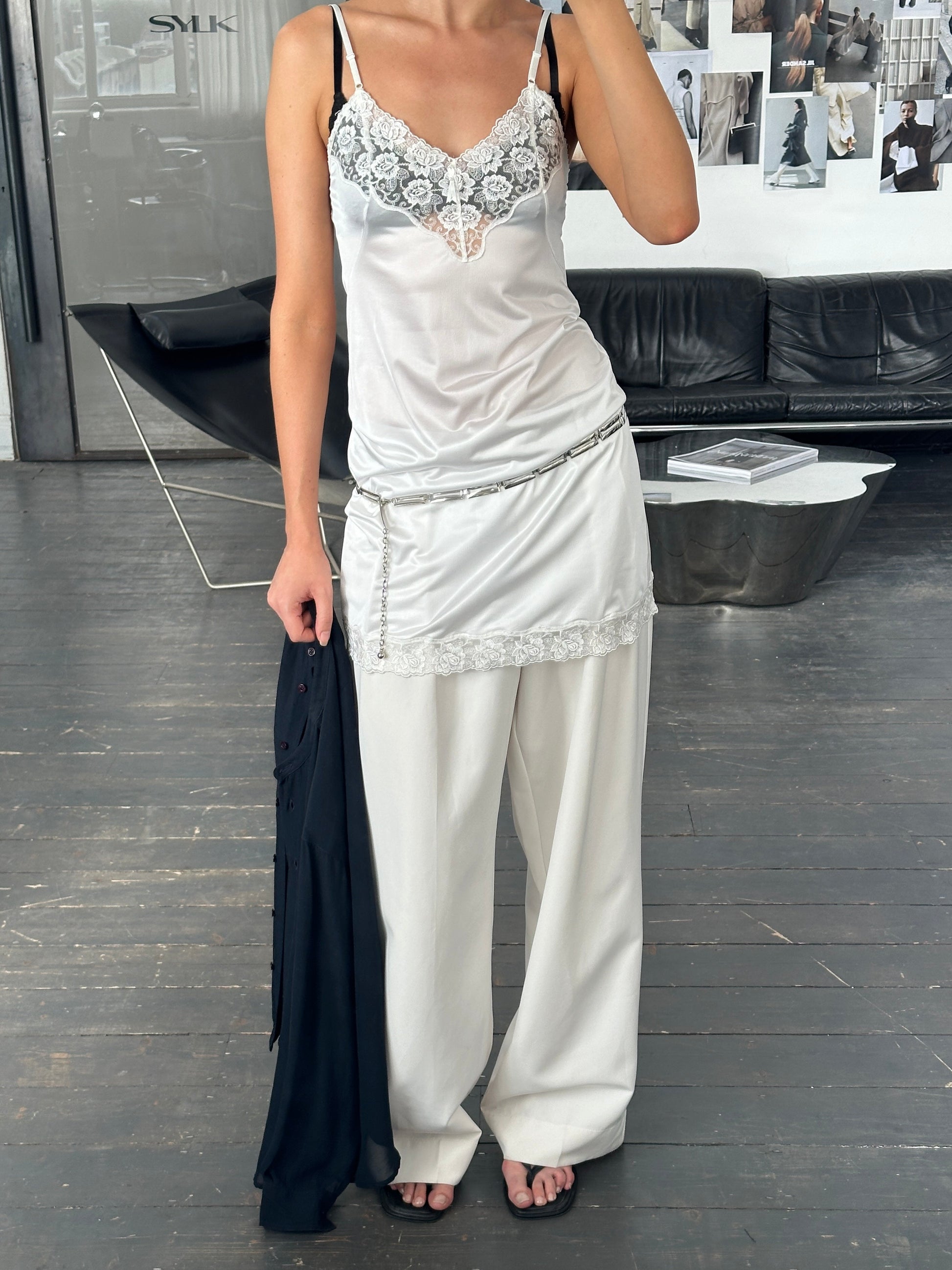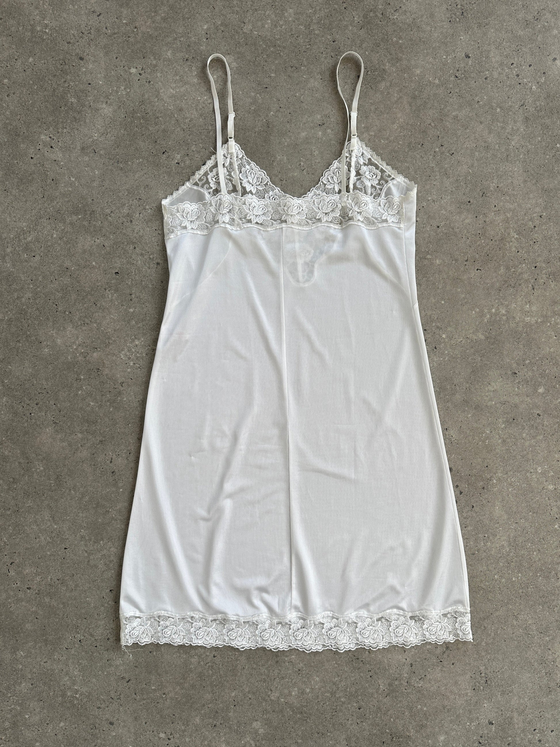 A delicate vintage 1990s Japanese slip dress in lustrous white satin with floral lace trim, perfect worn layered or as a statement lingerie-inspired piece.