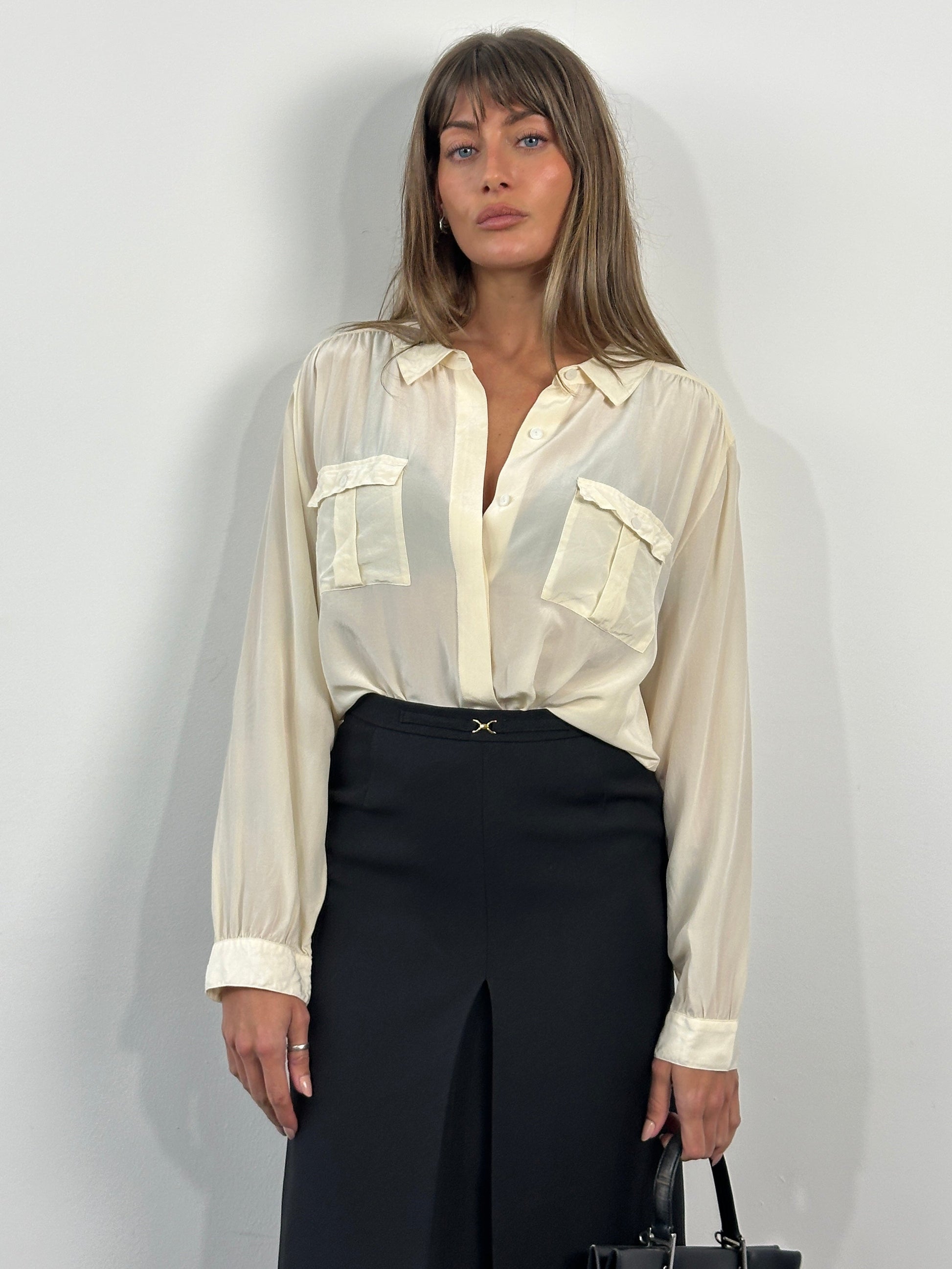 A vintage 1990s cream pure silk shirt with a soft fluid drape and subtle sheen. Designed with a concealed placket, pleated chest pockets and gentle gathering at the shoulders for a relaxed silhouette with quiet structure.