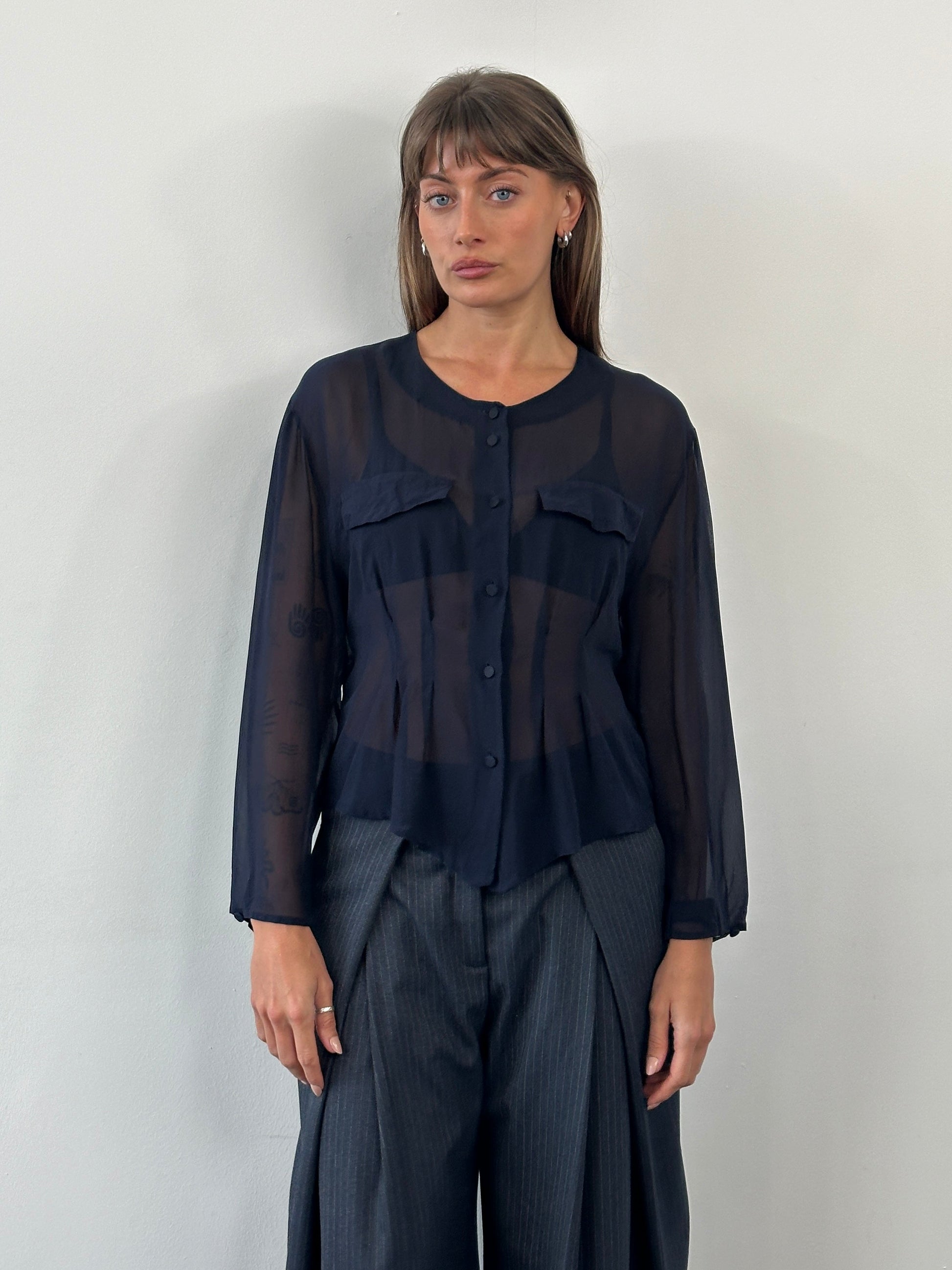 A lightweight sheer silk shirt with a fluid drape, finished with a soft V neckline, covered buttons, and a pointed hem that elongates the silhouette through the centre. Designed with a subtle chest pocket detailing, this piece reflects the minimalist womenswear styling of the 1990s.