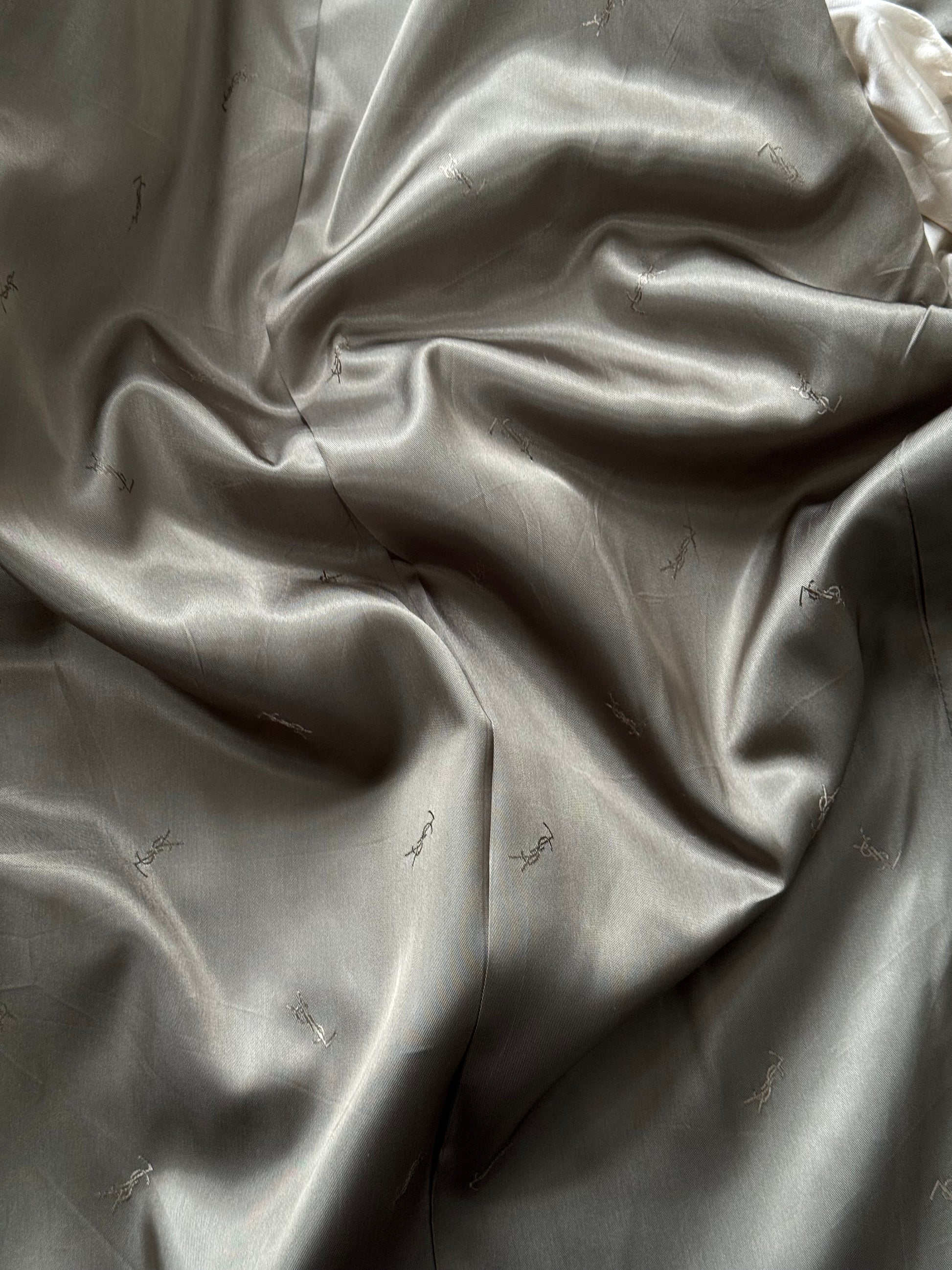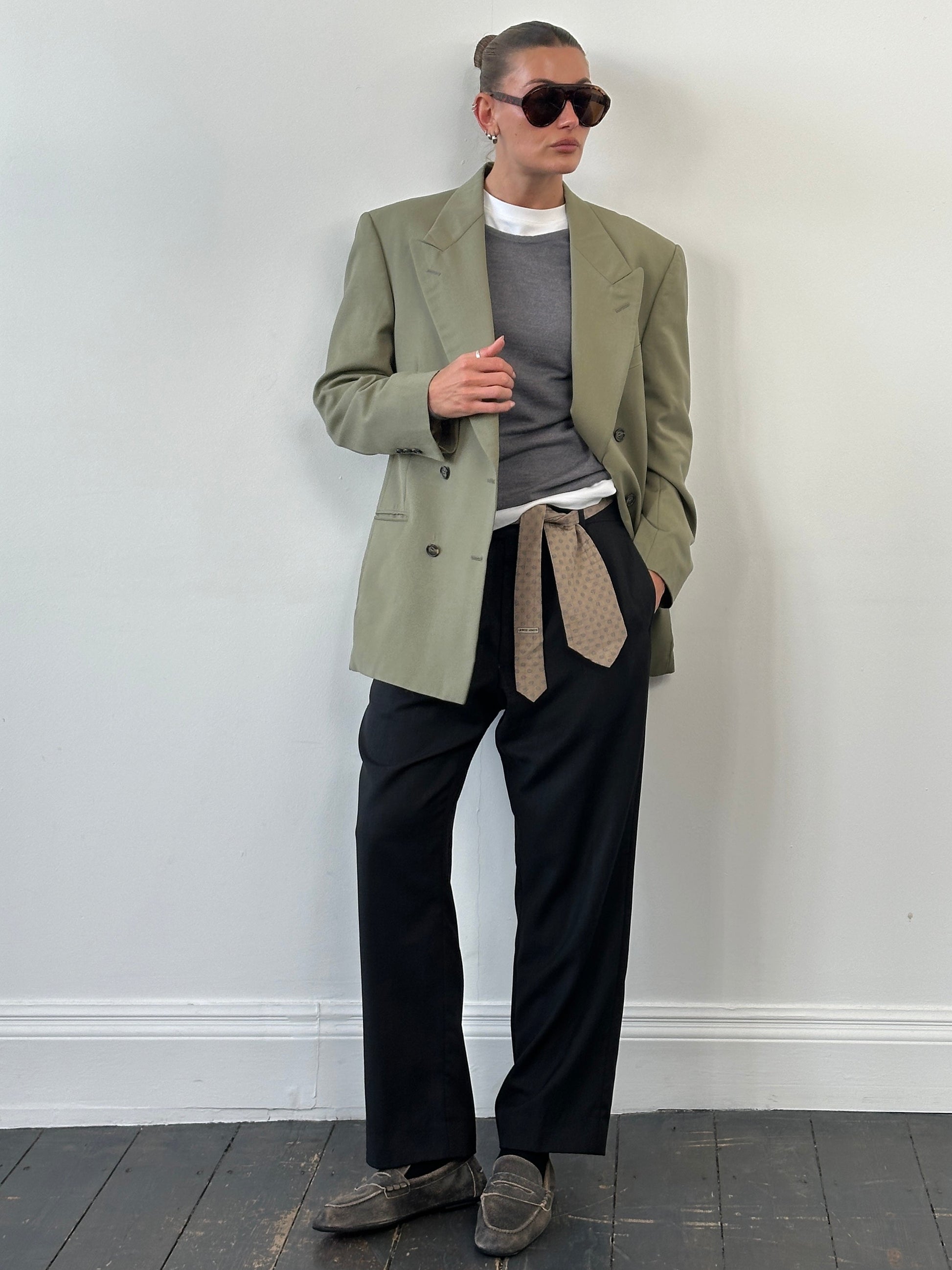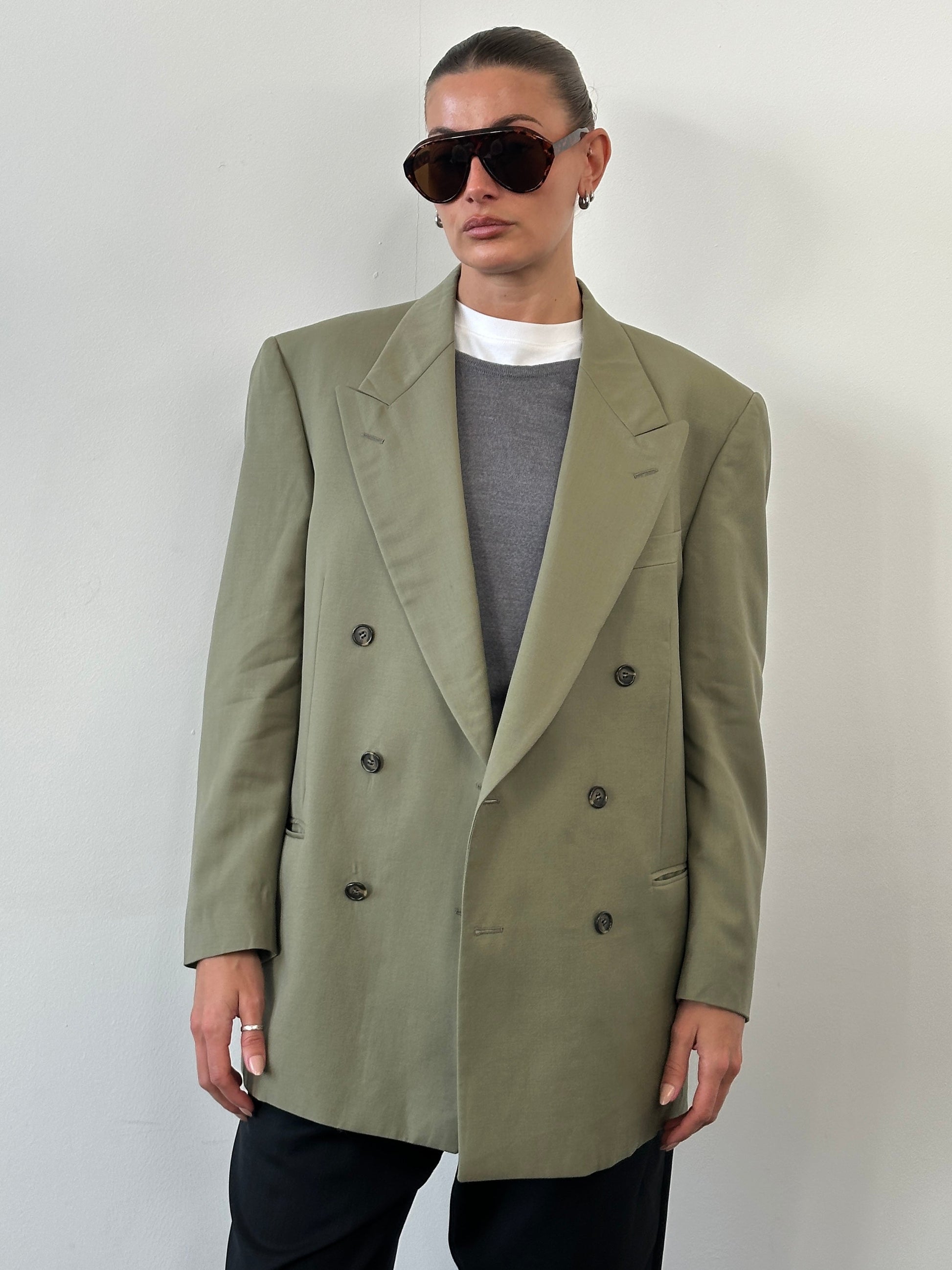 A muted olive green vintage Yves Saint Laurent blazer in structured worsted wool with a sharp double breasted front and strong peak lapels. Tailored with padded shoulders and a clean, elongated line through the body, it holds a classic power silhouette with subtle 1980s presence.